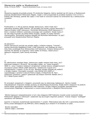 Słoneczne pętle w Mysłowicach (środa, 24 marzec 2010) - - Ostatnia aktualizacja (środa, 24 marzec 2010) Wiosenna pogoda przywitała prawie 70 amatorów biegania, którzy spotkali się 20 marca w Mysłowicach podczas Akademickich Mistrzostw Śląska. Część z nich przyjechała by przebiec dystans 5 km (3 km u kobiet) dla rekreacji, jednak dla części z nich była to coroczna szansa na zmierzenie się z odwiecznymi rywalami. Punktualnie o 11.00 na starcie stanęły dziewczyny, które miały do pokonania dystans 2800 metrów. Od początku do przodu ruszyły faworytki, Joanna Drobiec (AWF Katowice) i Dominika Wiśniewska (ŚUM Katowice), które z każdym kółkiem zyskiwały przewagę nad rywalkami. Dzięki temu, że cały bieg trzymały się jedna blisko drugiej, wpadły na metę niemal równocześnie. Minimalnie szybsza okazała się Dominika Wiśniewska i to jej przypadł tytuł Akademickiej Mistrzyni Śląska. Za plecami dwóch pierwszych toczyła się zacięta walka o kolejne miejsca. Trzecia wyścig ukończyła Magdalena Cisek z AWF Katowice, zaś niedługo po niej linię mety przebiegła Ewa Witoszyńska (UŚ Katowice). Kolejne dziewczyny również nie dawały za wygraną i ostra walka na finiszu, nawet przy dalszych miejscach, była rzeczą normalną. Po zakończeniu swojego biegu, dziewczyny zajęły miejsca koło trasy, by kibicować kolegom z drużyny. Od początku biegu, na trasie liczącej 4800 m. wraz z każdym kolejnym okrążeniem uciekał stawce ubiegłoroczny zwycięzca Łukasz Oślizło (AWF Katowice). Ostatecznie wygrał on niezagrożenie z czasem 12,05;76 min. Bardziej zacięta okazała się walka o drugie miejsce. Zwycięsko wyszedł z niej Michał Król (AWF), wyprzedzając o prawie 6 sekund Piotra Czaplę z Politechniki Śl. Na miejscach czwartym i piątym uplasowali się kolejno Dominik Sladek (Pol. Śl.) i Rafał Żywot (AWF). Po emocjach związanych z biegami, przyszedł czas na dekorację najlepszych. Oprócz medali indywidualnych wręczone zostały puchary za klasyfikację drużynową. Dzięki dwóm miejscom na podium wśród kobiet zwyciężyły zawodniczki AWF Katowice. Drugie miejsce przypadło zawodniczkom Uniwersytetu Śląskiego w Katowicach a trzecie dziewczynom z Akademii Ekonomicznej. Wśród mężczyzn niespodziewanie w tym roku biegacze AWF Katowice musieli uznać wyższość ekipy Politechniki Śląskiej w Gliwicach i zadowolić się się drugim stopniem podium. Trzecie miejsce "wybiegali" zawodnicy UŚ Katowice. Łącznie w imprezie wystartowali reprezentanci 7 uczelni. Mistrzostwa były dla nich z pewnością testem formy przed zbliżającymi się AMP'ami, które odbędą się w dniach 9-10 kwietnia w Łodzi. Wyniki zawodów Galeria zdjęć z zawodów http://www.azs.katowice.pl - AZS Katowice - Organizacja ŚrodowiskowaPowered by Mambo Generated: 6 March, 2017, 21:47 http://www.azs.katowice.pl - AZS Katowice - Organizacja ŚrodowiskowaPowered by Mambo Generated: 6 March, 2017, 21:47