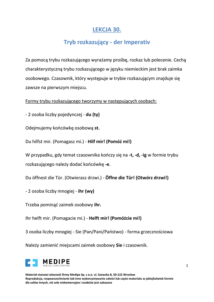 LEKCJA 30. Tryb rozkazujący - der Imperativ Za pomocą trybu rozkazującego wyrażamy prośbę, rozkaz lub polecenie. Cechą charakterystyczną trybu rozkazującego w języku niemieckim jest brak zaimka osobowego. Czasownik, który występuje w trybie rozkazującym znajduje się zawsze na pierwszym miejscu. Formy trybu rozkazującego tworzymy w następujących osobach: - 2 osoba liczby pojedynczej - du (ty) Odejmujemy końcówkę osobową st. Du hilfst mir. (Pomagasz mi.) - Hilf mir! (Pomóż mi!) W przypadku, gdy temat czasownika kończy się na -t, -d, -ig w formie trybu rozkazującego należy dodać końcówkę -e. Du öffnest die Tür. (Otwierasz drzwi.) - Öffne die Tür! (Otwórz drzwi!) - 2 osoba liczby mnogiej - ihr (wy) Trzeba pominąć zaimek osobowy ihr. Ihr helft mir. (Pomagacie mi.) - Helft mir! (Pomóżcie mi!) 3 osoba liczby mnogiej - Sie (Pan/Pani/Państwo) - forma grzecznościowa Należy zamienić miejscami zaimek osobowy Sie i czasownik. 1 Materiał stanowi własność firmy Medipe Sp. z o.o. ul. Szewska 8, 50-122 Wrocław Reprodukcja, rozpowszechnianie lub inne wykorzystywanie całości lub części materiału w jakiejkolwiek formie dla celów innych, niż cele niekomercyjne i osobiste jest zakazane Sie helfen mir. (Pani/Pan mi pomaga. / Państwo mi pomagają.) - Helfen Sie mir! (Niech Pani/Pan mi pomogą! /Niech Państwo mi pomogą!) Nieregularne formy trybu rozkazującego czasowników: haben, sein, werden. haben sein werden 2. os. liczby poj. Hab! Sei! Werde! 2. os. liczby mn. Habt! Seid! forma grzecznościowa Haben Sie! Seien Sie! Werdet! Werden Sie! 2 Materiał stanowi własność firmy Medipe Sp. z o.o. ul. Szewska 8, 50-122 Wrocław Reprodukcja, rozpowszechnianie lub inne wykorzystywanie całości lub części materiału w jakiejkolwiek formie dla celów innych, niż cele niekomercyjne i osobiste jest zakazane
