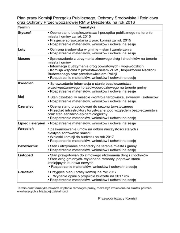 Plan pracy Komisji Porządku Publicznego, Ochrony Środowiska i Rolnictwa oraz Ochrony Przeciwpożarowej RM w Drezdenku na rok 2016 Termin Tematyka Styczeń • Ocena stanu bezpieczeństwa i porządku publicznego na terenie miasta i gminy za rok 2015 • Przyjęcie sprawozdania z prac komisji za rok 2015 • Rozpatrzenie materiałów, wniosków i uchwał na sesję Luty • Ochrona środowiska w gminie – stan i zamierzenia • Rozpatrzenie materiałów, wniosków i uchwał na sesję Marzec • Sprawozdanie z utrzymania zimowego dróg i chodników na terenie miasta i gminy • Informacja z utrzymania dróg powiatowych i wojewódzkich • Komisja wspólna z przedstawicielem ZDW , Inspektorem Nadzoru Budowlanego oraz przedstawicielem Policji • Rozpatrzenie materiałów, wniosków i uchwał na sesję Kwiecień • Sprawozdanie-informacja o stanie bezpieczeństwa przeciwpożarowego i przeciwpowodziowego na terenie gminy • Rozpatrzenie materiałów, wniosków i uchwał na sesję Maj • Stan czystości w mieście -kontrola targowiska, skwerów i zieleńców • Rozpatrzenie materiałów, wniosków i uchwał na sesję Czerwiec • Ocena stanu przygotowań do sezonu turystycznego • Przegląd infrastruktury turystycznej pod względem bezpieczeństwa oraz stan sanitarno-epidemiologiczny • Rozpatrzenie materiałów, wniosków i uchwał na sesję Lipiec i sierpień • Rozpatrzenie materiałów, wniosków i uchwał na sesję Wrzesień • Zaawansowanie umów na odbiór nieczystości stałych i ciekłych,sortowanie śmieci • Wnioski komisji do budżetu na rok 2017 • Rozpatrzenie materiałów, wniosków i uchwał na sesję Październik • Stan i utrzymanie cmentarzy na terenie miasta i gminy • Rozpatrzenie materiałów, wniosków i uchwał na sesję Listopad • Stan przygotowań do zimowego utrzymania dróg i chodników • Stan dróg gminnych- wykonane remonty, poprawa stanu istniejących,budowa nowych • Rozpatrzenie materiałów, wniosków i uchwał na sesję Grudzień • Przyjęcie planu pracy komisji na rok 2017 Wydanie opinii o projekcie budżetu na 2017 rok. • Rozpatrzenie materiałów, wniosków i uchwał na sesję Termin oraz tematyka zawarta w planie ramowym pracy, może być zmieniona na skutek potrzeb wynikających z bieżącej działalności Przewodniczący Komisji