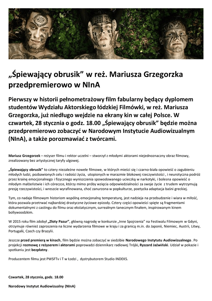 „Śpiewający obrusik” w reż. Mariusza Grzegorzka przedpremierowo w NInA Pierwszy w historii pełnometrażowy film fabularny będący dyplomem studentów Wydziału Aktorskiego łódzkiej Filmówki, w reż. Mariusza Grzegorzka, już niedługo wejdzie na ekrany kin w całej Polsce. W czwartek, 28 stycznia o godz. 18.00 „Śpiewający obrusik” będzie można przedpremierowo zobaczyć w Narodowym Instytucie Audiowizualnym (NInA), a także porozmawiać z twórcami. Mariusz Grzegorzek – reżyser filmu i rektor uczelni – stworzył z młodymi aktorami niejednoznaczny obraz filmowy, zrealizowany bez artystycznej taryfy ulgowej. „Śpiewający obrusik” to cztery niezależne nowele filmowe, w których mieści się i czarno-biała opowieść o zagubieniu młodych ludzi, pozbawionych celu i radości życia, utopionych w marazmie blokowej rzeczywistości , i neurotyczna podróż przez krainę emocjonalnego i fizycznego wyniszczenia spowodowanego ucieczką w narkotyki, i bolesna opowieść o młodym małżeństwie i ich córeczce, którzy mimo próby wzięcia odpowiedzialności za swoje życie z trudem wytrzymują presję rzeczywistości, i wreszcie wyrafinowana, choć zanurzona w popkulturze, poetycka adaptacja baśni greckiej. Tym, co nadaje filmowym historiom wspólną emocjonalną temperaturę, jest nadzieja na przebudzenie i wiara w miłość, która pozwala przetrwać najbardziej drastyczne życiowe epizody. Cztery części opowieści spięte są fragmentami dokumentalnymi z castingu do filmu oraz ekstatycznym, surrealnym tanecznym finałem, inspirowanym kinem bollywoodzkim. W 2015 roku film zdobył „Złoty Pazur”, główną nagrodę w konkursie „Inne Spojrzenia” na Festiwalu Filmowym w Gdyni, otrzymuje również zaproszenia na liczne wydarzenia filmowe w kraju i za granicą m.in. do Japonii, Niemiec, Austrii, Litwy, Portugalii, Czech czy Brazylii. Jeszcze przed premierą w kinach, film będzie można zobaczyć w siedzibie Narodowego Instytutu Audiowizualnego . Po projekcji rozmowę z reżyserem i aktorami poprowadzi dziennikarz radiowej Trójki, Ryszard Jaźwiński. Udział w pokazie i spotkaniu jest bezpłatny. Producentem filmu jest PWSFTv i T w Łodzi , dystrybutorem Studio INDEKS. Czwartek, 28 stycznia, godz. 18.00 Narodowy Instytut Audiowizualny (NInA) ul. Wałbrzyska 3/5, Warszawa stacja Metro Służew wstęp wolny Więcej informacji o pokazie na stronie www.nina.gov.pl http://www.nina.gov.pl/wydarzenia/spiewajacy-obrusik/ Kontakt dla mediów Dorota Zajdel specjalista ds. komunikacji T. +48 22 380 49 76 M. 0723 510 077 E-mail: [email protected] Agnieszka Wolak rzecznik prasowy Narodowego Instytutu Audiowizualnego T. +48 22 380 49 75 M. 0503 099 013 E-mail: [email protected] www.nina.gov.pl Data publikacji: 20 / 01 / 2016