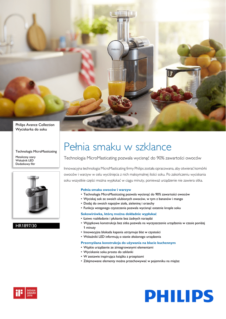 Philips Avance Collection Wyciskarka do soku Technologia MicroMasticating Metaliczny szary Wskaźnik LED Dodatkowy filtr Pełnia smaku w szklance Technologia MicroMasticating pozwala wycisnąć do 90% zawartości owoców Innowacyjna technologia MicroMasticating firmy Philips została opracowana, aby otwierać komórki owoców i warzyw w celu wyciśnięcia z nich maksymalnej ilości soku. Po zakończeniu wyciskania soku wszystkie części można wypłukać w ciągu minuty, ponieważ urządzenie nie zawiera sitka. Pełnia smaku owoców i warzyw • Technologia MicroMasticating pozwala wycisnąć do 90% zawartości owoców • Wyciskaj sok ze swoich ulubionych owoców, w tym z bananów i mango • Dodaj do swoich napojów zioła, zieleninę i orzechy • Funkcja wstępnego czyszczenia pozwala wycisnąć ostatnie krople soku HR1897/30 Sokowirówka, którą można dokładnie wypłukać • Łatwe rozkładanie i płukanie bez żadnych narzędzi • Wyjątkowa konstrukcja bez sitka pozwala na wyczyszczenie urządzenia w czasie poniżej 1 minuty • Innowacyjna blokada kapania utrzymuje blat w czystości • Wskaźniki LED informują o stanie złożonego urządzenia Przemyślana konstrukcja do używania na blacie kuchennym • Wąskie urządzenie ze zintegrowanymi elementami • Wyciskanie soku prosto do szklanki • W zestawie inspirująca książka z przepisami • Zdejmowane elementy można przechowywać w pojemniku na miąższ HR1897/30 Wyciskarka do soku Technologia MicroMasticating Metaliczny szary, Wskaźnik LED, Dodatkowy filtr Zalety Technologia MicroMasticating Zioła, zielenina i orzechy Owoce i warzywa mają tysiące komórek, które zawierają sok, witaminy i inne składniki odżywcze. Innowacyjna technologia MicroMasticating firmy Philips została zaprojektowana tak, aby otwierać te komórki i wyciskać z nich maksymalną ilość Twoich ulubionych składników oraz wykorzystać do 90%* zawartości owoców. Zioła i zielenina o dużej zawartości włókien również stanowią doskonały składnik zdrowych soków i mogą być przetwarzane przez to urządzenie. Młoda, zielona pszenica, szpinak i wiele innych składników mogą stanowić ważny dodatek do Twoich soków dzięki technologii MicroMasticating. Możesz nawet używać niektórych rodzajów orzechów, takich jak migdały, aby przygotować mleko migdałowe. Od miękkich owoców do twardych warzyw Funkcja QuickClean — czyszczenie w zaledwie 1 minutę Dzięki możliwości łatwego rozłożenia i bezkrawędziowym elementom to urządzenie można szybko wyczyścić, korzystając z bieżącej wody z kranu. Ponieważ elementy nie mają ostrych krawędzi, pozostałości włókien i cząstki składników są spłukiwane w kilka sekund. Funkcja wstępnego czyszczenia Przyrządzaj smaczne i zdrowe soki z miękkich owoców i twardych warzyw. Możesz wyciskać sok ze swoich ulubionych składników — nawet tych o wysokiej zawartości skrobi, takich jak banany i mango.</ Funkcja wstępnego czyszczenia to specjalny program, dzięki któremu sok wyciskany jest do ostatniej kropli, a jednocześnie czyszczone jest wnętrze produktu. Pozwala to na maksymalne wykorzystanie owoców i warzyw oraz zapobiega marnowaniu soku podczas czyszczenia. IF Design Award — nagroda za wzornictwo Zdobywające nagrody IF produkty, projekty i koncepcje wybierane przez czołowe postacie w dziedzinie wzornictwa. Każdego roku iF International Forum Design GmbH organizuje jeden z najsłynniejszych i najbardziej cenionych konkursów w dziedzinie wzornictwa — iF DESIGN AWARD. Konkurs ten na całym świecie jest uznawany za swoisty symbol doskonałego wzornictwa, dlatego co roku do organizatorów napływa ponad 5 tysięcy zgłoszeń z około 70 krajów. HR1897/30 Wyciskarka do soku Technologia MicroMasticating Metaliczny szary, Wskaźnik LED, Dodatkowy filtr Dane techniczne Akcesoria Serwis Informacje ogólne Zrównoważony rozwój • W zestawie: Filtr, Dzbanek, Broszura z przepisami • Charakterystyka produktu: Możliwość mycia w zmywarce, Stopy antypoślizgowe, Wyłącznik, Blokada zabezpieczająca, QuickClean Wzornictwo • Kolor: Metaliczny szary Wykończenie • Materiał akcesoriów: Blokada zabezpieczająca — metal • Materiał dzbanka: Plastik • Materiał korpusu: Plastik • Materiał pojemnika na odpadki: Plastik • 2 lata gwarancji • Opakowanie: > 90% materiału z odzysku • Instrukcja obsługi: 100% papier przetworzony Dane techniczne • • • • • • Pojemność dzbanka: 1 L Pojemność pojemnika na miąższ: 1 L Długość przewodu: 1 m Częstotliwość: 50–60 Hz Moc: 200 W Napięcie: 220–240 V Kraj pochodzenia • Miejsce produkcji: Chiny • Data wydania 2016-05-19 © 2016 Koninklijke Philips N.V. Wszelkie prawa zastrzeżone. Wersja: 4.1.1 Dane techniczne mogą ulec zmianie bez powiadomienia. Znaki towarowe są własnością Koninklijke Philips N.V. lub własnością odpowiednich firm. EAN: 08 71010 37501 61 www.philips.com * Dane na podstawie testów wewnętrznych przeprowadzonych na 1000 g winogron, jabłek, czarnej porzeczki, truskawek, pomidorów, arbuzów, pomarańczy i granatów.