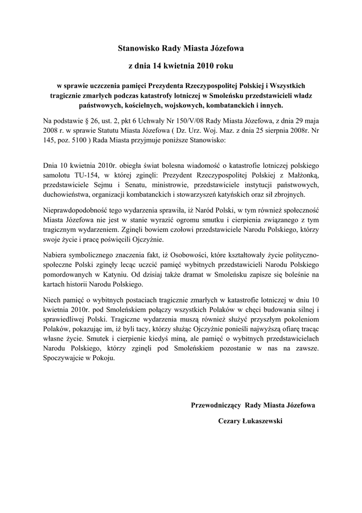 Stanowisko Rady Miasta Józefowa z dnia 14 kwietnia 2010 roku w sprawie uczczenia pamięci Prezydenta Rzeczypospolitej Polskiej i Wszystkich tragicznie zmarłych podczas katastrofy lotniczej w Smoleńsku przedstawicieli władz państwowych, kościelnych, wojskowych, kombatanckich i innych. Na podstawie § 26, ust. 2, pkt 6 Uchwały Nr 150/V/08 Rady Miasta Józefowa, z dnia 29 maja 2008 r. w sprawie Statutu Miasta Józefowa ( Dz. Urz. Woj. Maz. z dnia 25 sierpnia 2008r. Nr 145, poz. 5100 ) Rada Miasta przyjmuje poniższe Stanowisko: Dnia 10 kwietnia 2010r. obiegła świat bolesna wiadomość o katastrofie lotniczej polskiego samolotu TU-154, w której zginęli: Prezydent Rzeczypospolitej Polskiej z Małżonką, przedstawiciele Sejmu i Senatu, ministrowie, przedstawiciele instytucji państwowych, duchowieństwa, organizacji kombatanckich i stowarzyszeń katyńskich oraz sił zbrojnych. Nieprawdopodobność tego wydarzenia sprawiła, iż Naród Polski, w tym również społeczność Miasta Józefowa nie jest w stanie wyrazić ogromu smutku i cierpienia związanego z tym tragicznym wydarzeniem. Zginęli bowiem czołowi przedstawiciele Narodu Polskiego, którzy swoje życie i pracę poświęcili Ojczyźnie. Nabiera symbolicznego znaczenia fakt, iż Osobowości, które kształtowały życie politycznospołeczne Polski zginęły lecąc uczcić pamięć wybitnych przedstawicieli Narodu Polskiego pomordowanych w Katyniu. Od dzisiaj także dramat w Smoleńsku zapisze się boleśnie na kartach historii Narodu Polskiego. Niech pamięć o wybitnych postaciach tragicznie zmarłych w katastrofie lotniczej w dniu 10 kwietnia 2010r. pod Smoleńskiem połączy wszystkich Polaków w chęci budowania silnej i sprawiedliwej Polski. Tragiczne wydarzenia muszą również służyć przyszłym pokoleniom Polaków, pokazując im, iż byli tacy, którzy służąc Ojczyźnie ponieśli najwyższą ofiarę tracąc własne życie. Smutek i cierpienie kiedyś miną, ale pamięć o wybitnych przedstawicielach Narodu Polskiego, którzy zginęli pod Smoleńskiem pozostanie w nas na zawsze. Spoczywajcie w Pokoju. Przewodniczący Rady Miasta Józefowa Cezary Łukaszewski