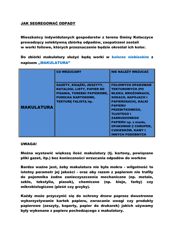 JAK SEGREGOWAĆ ODPADY Mieszkańcy indywidulanych gospodarstw z terenu Gminy Kołaczyce prowadzący selektywną zbiórkę odpadów, zaopatrzeni zostali w worki foliowe, których przeznaczenie będzie określał ich kolor. Do zbiórki makulatury służyć będą worki w kolorze niebieskim z napisem ,,MAKULATURA” MAKULATURA CO WRZUCAMY NIE NALEŻY WRZUCAĆ GAZETY, KSIĄŻKI, ZESZYTY, KATALOGI, LISTY, PAPIER DO PISANIA, TOREBKI PAPIEROWE, PUDEŁKA KARTONOWE, TEKTURĘ FALISTĄ itp. FOLIOWYCH OPAKOWAŃ TEKTUROWYCH (PO MLEKU, MROŻONKACH, SOKACH, NAPOJACH I PAPIEROSACH), KALKI PAPIERU PRZEBITKOWEGO, TŁUSTEGO I ZABRUDZONEGO PAPIERU np. z masła, OPAKOWAŃ Z CHRUPEK, CUKIERKÓW, KAWY I INNYCH PODOBNYCH UWAGA! Można wystawić większą ilość makulatury (tj. kartony, powiązane pliki gazet, itp.) bez konieczności wrzucania odpadów do worków Bardzo ważne jest, żeby makulatura nie była mokra - wilgotność to istotny parametr jej jakości - oraz aby razem z papierem nie trafiły do pojemnika żadne zanieczyszczenia mechaniczne (np. metale, szkło, tekstylia, piasek), chemiczne (np. kleje, farby) czy mikrobiologiczne (pleśń czy grzyby). Każdy może przyczynić się do ochrony drzew poprzez dwustronne wykorzystywanie kartek papieru, zwracanie uwagi czy produkty papierowe (zeszyty, koperty, papier do drukarek) jakich używamy były wykonane z papieru pochodzącego z makulatury. Worki w kolorze białym z napisem ,,SZKŁO” służyć będą do zbierania szkła białego i kolorowego SZKŁO CO WRZUCAMY NIE NALEŻY WRZUCAĆ OPAKOWANIA ZE SZKŁA BIAŁEGO I KOLOROWEGO (BUTELKI, POJEMNIKI, SŁOIKI itp.) STŁUCZKĘ SZKLANA WOLNĄ OD ZANIECZYSZCZEŃ METALAMI I TWORZYWAMI LUSTER, SZKŁA ZBROJONEGO, PORCELANY, NAKRĘTEK, KAPSLI, KORKÓW, ZUŻYTYCH ŻARÓWEK I LAMP NEONOWYCH, SZKŁA OKIENNEGO, SZYB SAMOCHODOWYCH Energia zaoszczędzona dzięki recyklingowi jednej szklanej butelki pozwala zasilić: komputer przez 25 min, telewizor przez 20 min, zmywarkę do naczyń przez 10 min. Niewielki wysiłek - wielkie korzyści ! Do zbiórki tworzyw sztucznych przeznaczone będą worki w kolorze żółtym z napisem ,,TWORZYWA SZTUCZNE” TWORZYWA SZTUCZNE CO WRZUCAMY NIE NALEŻY WRZUCAĆ OPAKOWANIA PO PŁYNACH, FOLIE, REKLAMÓWKI, WORECZKI FOLIOWE, ARTYKUŁY GOSPODARSTWA DOMOWEGO Z TWORZYW SZTUCZNYCH itp. CZYSTE KUBKI PO JOGURTACH, LODACH, MARGARYNIE, OPAKOWANIA KARTONOWE PO SOKACH, NAPOJACH, MLEKU ARTYKUŁÓW WYKONANYCH Z POŁĄCZENIA TWORZYW SZTUCZNYCH Z INNYMI MATERIAŁAMI, OPAKOWAŃ PO CHRUPKACH, Butelki PET dają się powtórnie przetwarzać. Włókno z odzysku to znakomity surowiec na ubrania narciarskie, turystyczne, treningowe. Ale i na ekwipunek turysty i wyczynowca: plecaki, namioty, buty. Z PET-ów wytwarzana jest dzianina typu polar. Tworzywa sztuczne zwyczajowo zwane plastikiem, to produkty powstające z przerobu ropy naftowej - nieodnawialnego surowca naturalnego. Jego biodegradacja, czyli rozkład organiczny w środowisku naturalnym trwać może nawet wiele setek lat. Podczas powolnego rozkładu dochodzi do zatruć przenikającymi do gleby i wód toksycznymi substancjami zawartymi w tworzywach sztucznych. Spalanie tworzyw sztucznych jest niebezpieczne ze względu na uwalnianie trujących i niejednokrotnie rakotwórczych substancji takich jak dioksyny. NIE SPALAJ TWORZYW SZTUCZNYCH! TRUJESZ SIEBIE I INNYCH! Do zbiórki puszek metalowych i drobnego złomu przeznaczone będą worki w kolorze czerwonym z napisem ,,METAL” METAL CO WRZUCAMY NIE NALEŻY WRZUCAĆ PUSZKI PO KOSERWACH, NAPOJACH, DROBNY ZŁOM ŻELAZNY (NAKRĘTKI, KAPSLE, itp.) INNE METALE OPAKOWAŃ PO MEDYKAMENTACH, OPAKOWAŃ I BUTELEK PO OLEJACH I SMARACH, PUSZEK I POJEMNIKÓW PO FARBACH I LAKIERACH, OPAKOWAŃ PO ŚRODKACH CHWASTO I OWADOBÓJCZYCH Aluminiowe przetworzenia puszki i w nie całości muszą nadają trafiać na się do ponownego wysypiska śmieci. Odzysk aluminium z puszek prowadzić można w nieskończoność, nie powodując utraty jakości metalu. UWAGA! Można wystawić również grubszy złom bez konieczności wrzucania do worków! Do zbiórki odpadów biodegradowalnych i zielonych służyć będą worki zielone z napisem ,,ODPADY BIODEGRADOWALNE I ZIELONE” ODPADY BIODEGRADOWALNE I ZIELONE CO WRZUCAMY NIE NALEŻY WRZUCAĆ ODPADKI SPOZYWCZE (RESZTKI Z OBIADU, OBIERKI, OGRYZKI, SKORUPKI Z JAJEK itp.) ODPADY ZIELONE (LIŚCIE, GAŁĄZKI, TRAWA) KOŚCI, PIÓR, ODCHODÓW ZWIERZĘCYCH, DUŻYCH ILOŚCI ODPADÓW POCHODZENIA ZWIERZĘCEGO Do zbiórki odpadów komunalnych będą służyły worki CZARNE lub w innym kolorze z oznaczeniem ,,ODPADY NIESEGREGOWALNE” CO WRZUCAMY ODPADY KOMUNALNE WSZYSTKIE POZOSTAŁE ODPADY, KTÓRYCH NIE MOŻNA ZALICZYĆ DO WYMIENIONYCH WYŻEJ W specjalnie utworzonych punktach do selektywnej zbiórki odpadów (planowany termin otwarci lipiec 2014r.) będzie można oddawać odpady takie jak: szkło, makulatura, tworzywa sztuczne, metal, odpady wielkogabarytowe chemikalia (farby, lakiery, przeterminowane leki, środki ochrony roślin), przeterminowane leki, opony, zużyte akumulatory, baterie, zużyty sprzęt elektryczny i elektroniczny Odpady nadające się ponownego przetworzenia są odpowiednio oznakowane. Zwracajmy więc uwagę na znaki i symbole umieszczane na opakowaniach: SYMBOL OPIS Możliwość ponownego wykorzystania znak ekologiczny ten pojawia się na opakowaniach przydatnych do wielokrotnego użytku. Takie opakowania, po wykorzystaniu, nie stają się odpadem. Projektuje się je specjalnie z myślą o ponownym użyciu do tego samego celu. Muszą nadawać się do użyciu co najmniej dwukrotnie. Symbol ekologiczny można znaleźć na kontenerach, beczkach, pudełkach, puszkach, kanistrach, ale także na butelkach, szklanych pojemnikach Opakowania biodegradowalne - znak ekologiczny jest przeznaczony dla opakowań, które rozkładają się podczas kompostowania i nie uwalniają szkodliwych substancji. Opakowanie nadające się do recyklingu /trzy strzałki/ - znak ekologiczny przeznaczony dla opak