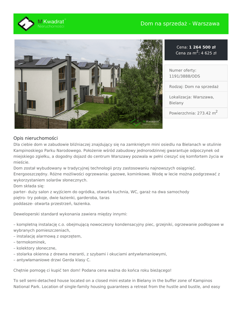 Dom na sprzedaż - Warszawa Cena: 1 264 500 zł Cena za m2: 4 625 zł Numer oferty: 1191/3888/ODS Rodzaj: Dom na sprzedaż Lokalizacja: Warszawa, Bielany Powierzchnia: 273.42 m2 Opis nieruchomości Dla ciebie dom w zabudowie bliźniaczej znajdujący się na zamkniętym mini osiedlu na Bielanach w otulinie Kampinoskiego Parku Narodowego. Położenie wśród zabudowy jednorodzinnej gwarantuje odpoczynek od miejskiego zgiełku, a dogodny dojazd do centrum Warszawy pozwala w pełni cieszyć się komfortem życia w mieście. Dom został wybudowany w tradycyjnej technologii przy zastosowaniu najnowszych osiągnięć. Energooszczędny. Różne możliwości ogrzewania: gazowe, kominkowe. Wodę w lecie można podgrzewać z wykorzystaniem solarów słonecznych. Dom składa się: parter- duży salon z wyjściem do ogródka, otwarta kuchnia, WC, garaż na dwa samochody piętro- try pokoje, dwie łazienki, garderoba, taras poddasze- otwarta przestrzeń, łazienka. Deweloperski standard wykonania zawiera między innymi: – kompletną instalację c.o. obejmującą nowoczesny kondensacyjny piec, grzejniki, ogrzewanie podłogowe w wybranych pomieszczeniach, – instalację alarmową z osprzętem, – termokominek, – kolektory słoneczne, – stolarka okienna z drewna meranti, z szybami i okuciami antywłamaniowymi, – antywłamaniowe drzwi Gerda klasy C. Chętnie pomogę ci kupić ten dom! Podana cena ważna do końca roku bieżącego! To sell semi-detached house located on a closed mini estate in Bielany in the buffer zone of Kampinos National Park. Location of single-family housing guarantees a retreat from the hustle and bustle, and easy access to the city center allows you to fully enjoy the comfort of living in the city. The house was built in traditional technology, using the latest developments. Developers standard shall contain, among other things: – a complete system which includes a modern condensing furnace, radiators, underfloor heating in selected rooms – alarm system with accessories – termokominek – solar, – window frames with meranti wood, with windows and fittings burglary, – security doors Gerda class C Welcome to the presentation and submission of price offer Kontakt w sprawie oferty M Kwadrat Nieruchomości Biuro nieruchomości 693 222 222 [email protected]