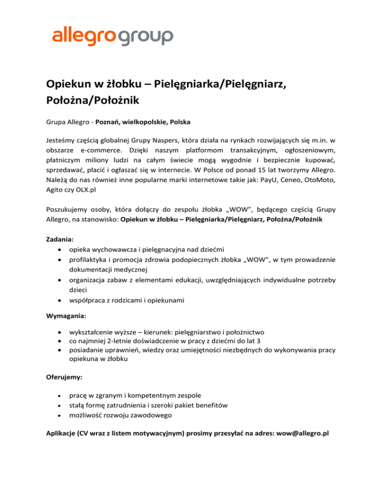Opiekun w żłobku – Pielęgniarka/Pielęgniarz, Położna/Położnik Grupa Allegro - Poznań, wielkopolskie, Polska Jesteśmy częścią globalnej Grupy Naspers, która działa na rynkach rozwijających się m.in. w obszarze e-commerce. Dzięki naszym platformom transakcyjnym, ogłoszeniowym, płatniczym miliony ludzi na całym świecie mogą wygodnie i bezpiecznie kupować, sprzedawać, płacić i ogłaszać się w internecie. W Polsce od ponad 15 lat tworzymy Allegro. Należą do nas również inne popularne marki internetowe takie jak: PayU, Ceneo, OtoMoto, Agito czy OLX.pl Poszukujemy osoby, która dołączy do zespołu żłobka „WOW”, będącego częścią Grupy Allegro, na stanowisko: Opiekun w żłobku – Pielęgniarka/Pielęgniarz, Położna/Położnik Zadania: opieka wychowawcza i pielęgnacyjna nad dziećmi profilaktyka i promocja zdrowia podopiecznych żłobka „WOW”, w tym prowadzenie dokumentacji medycznej organizacja zabaw z elementami edukacji, uwzględniających indywidualne potrzeby dzieci współpraca z rodzicami i opiekunami Wymagania: wykształcenie wyższe – kierunek: pielęgniarstwo i położnictwo co najmniej 2-letnie doświadczenie w pracy z dziećmi do lat 3 posiadanie uprawnień, wiedzy oraz umiejętności niezbędnych do wykonywania pracy opiekuna w żłobku Oferujemy: pracę w zgranym i kompetentnym zespole stałą formę zatrudnienia i szeroki pakiet benefitów możliwość rozwoju zawodowego Aplikacje (CV wraz z listem motywacyjnym) prosimy przesyłać na adres: [email protected]