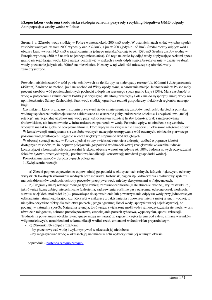 Ekoportal.eu - ochrona środowiska ekologia ochrona przyrody recykling biopaliwa GMO odpady Antropopresja a zasoby wodne w Polsce Strona 1 z 2Zasoby wody słodkiej w Polsce wynoszą około 200 km3 wody. W ostatnich latach widać wyraźny spadek zasobów wodnych, w roku 2000 wynosiły one 232 km3, a już w 2003 jedynie 168 km3. Średni roczny odpływ wód z obszaru kraju wynosi 54,3 km3 w przeliczeniu na jednego mieszkańca daje to ok. 1580 m3 (średnie zasoby wodne w Europie wynoszą 4560 m3 na rok na jednego mieszkańca). Od tego należało by odjąć wody dopływające rzekami spoza granic naszego kraju, wody, które należy pozostawić w rzekach i wody odpływającą bezużytecznie w czasie wezbrań, wtedy pozostanie jedynie ok. 600m3 na mieszkańca. Niestety w tej wielkości mieszczą się również wody zanieczyszczone. Powodem niskich zasobów wód powierzchniowych na tle Europy są małe opady roczne (ok. 650mm) i duże parowanie (450mm).Zarówno na zachód, jak i na wschód od Wisty opady rosną, a parowanie maleje. Jednocześnie w Polsce mały procent zasobów wód powierzchniowych pochodzi z dopływu rzecznego spoza granic kraju (13%). Mała zasobność w wodę w połączeniu z zaludnieniem Polski jest przyczyną, dla której przeciętny Polak ma do dyspozycji mniej wody niż np. mieszkaniec Sahary Zachodniej. Brak wody słodkiej ogranicza rozwój gospodarczy niektórych regionów naszego kraju. Czynnikiem, który w znacznym stopniu przyczynił się do zmniejszenia się zasobów wodnych była błędna polityka wodnogospodarcza: melioracje wodne nakierowane na osuszanie gleby, zniszczenie obiektów i urządzeń tzw. „małej retencji”, nieracjonalne użytkowanie wody przy jednoczesnym wzroście liczby ludności, brak zainteresowania środowiskiem, nie inwestowanie w infrastrukturę zaopatrzenia w wodę. Pośredni wpływ na obniżenie się zasobów wodnych ma także globalne ocieplenie klimatu, które wpływa na zwiększenie ewaporacji i okresowe natężenie spływu. W konsekwencji zmniejszania się zasobów wodnych następuje zczerpywanie wód otwartych, obniżanie pierwszego poziomu wód gruntowych i sięganie w coraz większym stopniu do wód wgłębnych. W obecnej sytuacji należy w Polsce z jednej strony zwiększać retencję a z drugiej zadbać o poprawę jakości dostępnych zasobów, m. in. poprzez polepszenie gospodarki wodno-ściekowej (zwiększenie wskaźnika ludności korzystającej z komunalnych oczyszczalni ścieków, obecnie wynosi on jedynie ok. 50%, budowa nowych oczyszczalni ścieków bytowo-przemysłowych), przebudowę kanalizacji, konserwację urządzeń gospodarki wodnej. Powiększanie zasobów dyspozycyjnych polega na: 1. Zwiększeniu retencji: - a) Zlewni poprzez zapewnienie: odpowiedniej gospodarki w ekosystemach rolnych, leśnych i łąkowych, ochrony wszystkich lokalnych zbiorników wodnych oraz mokradeł, torfowisk, bagien itp., odtworzenia i rozbudowy systemu małych zbiorników wodnych, ochrony procesów przepływu wody między ekosystemami w fizjocenozach. - b) Programy małej retencji: różnego typu zabiegi zarówno techniczne (małe zbiorniki wodne, jazy, zastawki itp.), jak również liczne zabiegi nietechniczne (zalesienia, zadrzewienia, roślinne pasy ochronne, ochrona oczek wodnych, stawów wiejskich, mokradeł itp.) – prowadzące do spowolnienia lub powstrzymania odpływu wody przy jednoczesnym odtwarzaniu naturalnego krajobrazu. Korzyści wynikające z uaktywnienia i upowszechnienia małej retencji wodnej, to nie tylko oczywiste efekty dla rolnictwa potrzebującego ogromnej ilości wody, spożytkowanej najefektywniej, bo podanej w naturalny sposób. Naturalna retencja, to również: zwiększone możliwości samooczyszczania się wody, w tym również z miogenów, ochrona przeciwpożarowa, zaspokajanie potrzeb rybactwa, wypoczynku, sportu, rekreacji. Trudności z powstaniem obiektu retencyjnego mogą się wiązać z: zajęciem części terenu pod zalew, zmianą warunków wilgotnościowych, utrudnieniami w komunikacji wzdłuż rzeki, zmianami w środowisku przyrodniczym. - c) Zbiorniki retencyjne służą temu: - by przechowywać wodę i wykorzystywać w okresach jej niedoboru - by magazynować wodę w okresach jej nadmiaru w celu wykorzystania jej w innym okresie poprzednia - następna »» strona 1 / 1