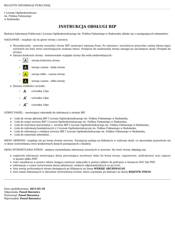 BIULETYN INFORMACJI PUBLCZNEJ I Liceum Ogólnokształcące im. Feliksa Fabianiego w Radomsku INSTRUKCJA OBSŁUGI BIP Biuletyn Informacji Publicznej I Liceum Ogólnokształcącego im. Feliksa Fabianiego w Radomsku składa się z następujących elementów: NAGŁOWEK - znajduje się na górze strony i zawiera: Wyszukiwarka - pozwala wyszykać strony BIP zawierące wpisaną frazę. Po wpisaniu i naciśnieciu przycisku szukaj (ikona lupy) wyświetli sie lista stron zawierających szukane słowo. Przejście do znalezionej strony nastąpi po naciśnięciu ikony (Przejdź do strony). Zmiana kontrastu strony - dostosowanie wyglądu strony dla osób niedowidzących : - wersja kolorowa strony - wersja czarno - biała strony - wersja żółto - czarna strony - wersja czarno - żółta strony Zmiana wielkości czcionki : - czcionka 12px - czcionka 14px - czcionka 16px GÓRNY PANEL - zawierający odnośniki do informacji o stronie BIP - Link do strony głównej BIP I Liceum Ogólnokształcącego im. Feliksa Fabianiego w Radomsku, - Link do mapy serwisu BIP I Liceum Ogólnokształcącego im. Feliksa Fabianiego w Radomsku, - Link do instrukcji korzystania z serwisu BIP I Liceum Ogólnokształcącego im. Feliksa Fabianiego w Radomsku, - Link do informacji kontaktowych z I Liceum Ogólnokształcącym im. Feliksa Fabianiego w Radomsku, - Link do informacji o redakcji serwisu BIP I Liceum Ogólnokształcącego im. Feliksa Fabianiego w Radomsku, - Link do statystyki odwiedzin , MENU SERWISU- znajduje sie po lewej stronie serwisu. Nawigacja polega na kliknięciu w wybrany dział, co spowoduje pojawienie się w oknie wyświetlania stron konkretnych danych powiązanych z działem. OKNO WYŚWIETLANIA STRON - miejsce wyświetlania informacji zawartych w serwisie. Na treść strony skłądają się: nagłowek informacji zawierający ikony pozwalające wyrównać tekst do lewej strony, wyjustować, wydrukować oraz zapisać w postaci pliku PDF, treść zasadnicza w postaci tekstu mogąca zawierać załączniki w postaci plików do pobrania w formacie DOC lub PDF, informacje o czasie wytworzenia danej informacji, osobach odpowiedzialnych za jej treść, lista wersji archiwalnych strony dostępnych po kliknięciu na ikonę WERSJE ARCHIWALNE. lista zmian dokonanych w aktualnie wyświetlanej stronie, która uzyskamy po kliknięci na ikonę REJESTR ZMIAN Data opublikowania: 2015-05-18 Odpowiada: Paweł Borowicz Wytworzył: Paweł Borowicz Wprowadził: Paweł Borowicz