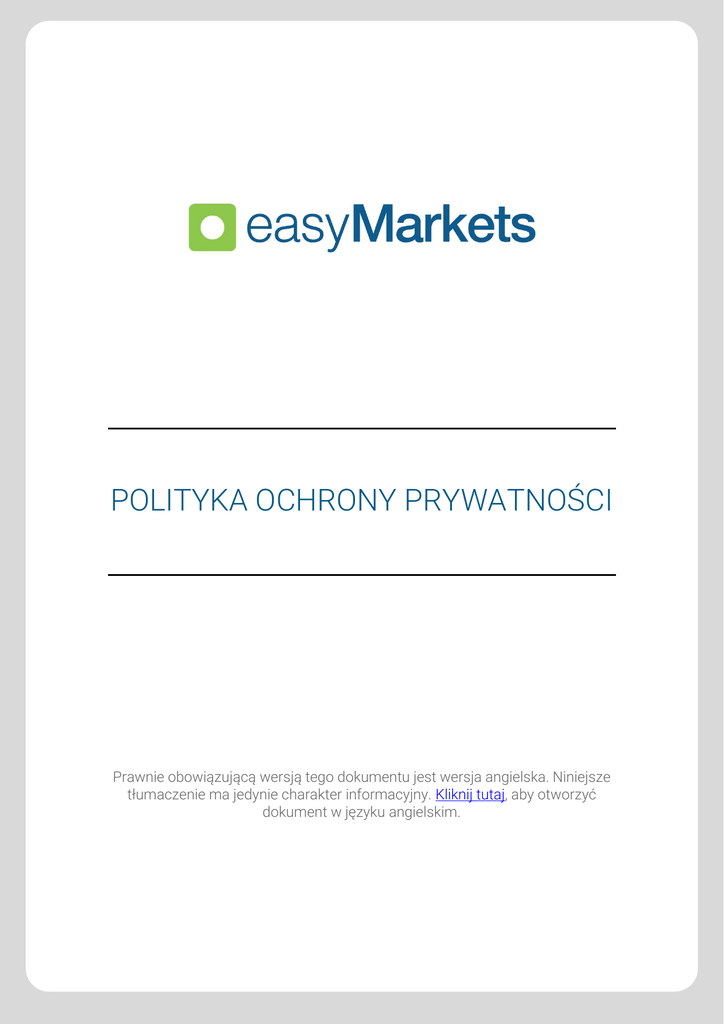POLITYKA OCHRONY PRYWATNOŚCI Prawnie obowiązującą wersją tego dokumentu jest wersja angielska. Niniejsze tłumaczenie ma jedynie charakter informacyjny. Kliknij tutaj, aby otworzyć dokument w języku angielskim. 31 grudnia 2013 POLITYKA OCHRONY PRYWATNOŚCI – BEZPIECZEŃSTWO Poprzez zarejestrowanie się lub wejście na stronę internetową easyMarkets wyrażasz zgodę na pozyskiwanie, wykorzystywanie i przetwarzanie twoich danych osobowych. Dane osobowe Przepisy prawa nakładają na nas obowiązek pozyskiwania i przetwarzania danych osobowych w ramach świadczenia usług. Pozyskujemy również dane osobowe dla celów wewnętrznych i administracyjnych, w tym związanych z promocją i marketingiem (np. wiadomości e-mail, SMS, portale społecznościowe), jak również aby zapewniać lepszy komfort korzystania i usprawniać obsługę klienta. Takie dane są przechowywane w bezpieczny sposób na nośnikach fizycznych lub w formie elektronicznej, przy jednoczesnym zastosowaniu proceduralnych środków kontroli. Wszystkie dane osobowe są traktowane jako POUFNE. Pozyskujemy jedynie dane osobowe, które są niezbędne i odpowiednie dla prowadzonej przez nas działalności. Wszelkie dane przechowywane są tylko przez uzasadniony okres. Nigdy nie prosimy o przekazanie większej ilości informacji, niż wymagają tego od nas przepisy prawa. Możemy pozyskiwać informacje pośrednie, które są wykorzystywane jedynie w celach związanych z weryfikacją i bezpieczeństwem, lub służą tylko w celu poprawnego przeglądania strony lub zapewnienia właściwej funkcjonalności. Dane te mogą obejmować adres (IP), rodzaj przeglądarki internetowej, system operacyjny, usługodawcę internetowego (ISP), pliki cookie. Prosimy zapoznać się z naszą polityką dotyczącą plików cookie, która znajduje się pod adresem www.easymarkets.com/legal. Jakiego rodzaju informacje pozyskujecie ode mnie? Przez okres współpracy informacje pozyskujemy bezpośrednio od użytkownika. Mogą to być dane osobowe, takie jak: imię i nazwisko, dane profilu społecznościowego, adres IP, kraj zamieszkania, data urodzenia, e-mail, adres pocztowy, dane bankowe, informacje dotyczące sytuacji finansowej, aktywności podczas wykonywania transakcji, historii przeprowadzonych transakcji, informacje o saldzie konta oraz wybrane dokumenty KYC (tzw. dokumenty „znaj swojego klienta”). Dokumentami KYC są na przykład: Easy Forex Trading Limited 2017 All rights reserved. • • • Dokument potwierdzający tożsamość (np. dowód osobisty, paszport, prawo jazdy) Dokument potwierdzający adres zamieszkania (np. rachunek opłat mieszkaniowych, prawo jazdy) Zestawienie transakcji dokonanych kartą kredytową (np. wyciąg z konta) Pliki cookie Pliki cookie to niewielkie pliki tekstowe, które podczas dostępu do internetu są wysyłane na dane urządzenie (np. komputer stacjonarny lub laptop, smartfon, tablet lub phablet), gdy użytkownik po raz pierwszy odwiedza daną stronę internetową, a następnie przechowywane na tym urządzeniu. Pliki cookie pozwalają serwisowi internetowemu rozpoznać urządzenie użytkownika. Celem zastosowania plików cookie jest usprawnienie obsługi i poprawienie komfortu użytkownika podczas korzystania z danego serwisu. Więcej informacji na temat naszej polityki dotyczącej plików cookie można znaleźć pod adresem www.easymarkets.com/legal. Portale Społecznościowe i Promocje Możemy zbierać osobiste informacje z kanałów społecznościach podczas interakcji z nami na naszych portalach społecznościach, a także za pośrednictwem jednej z naszych aplikacji i/lub innych portali internetowych takich jak np.: publiczne bazy danych partnerzy do spraw marketingu; platformy mediów społecznościowych; od osób, z którymi Jesteś połączony jako znajomy lub w inny sposób na platformach serwisów społecznościowych, a także od innych osób trzecich. Dlaczego pozyskujemy dane osobowe? Aby chronić interesy naszych klientów; • Aby zapewnić bezpieczeństwo, integralność i poufność ewidencji i transakcji naszych klientów; • Aby chronić przed nieupoważnionym dostępem lub wykorzystywaniem ewidencji lub informacji klientów, co z kolei mogłoby wyrządzić poważne szkody lub spowodować niedogodności naszym klientom; • Aby działać w zgodzie z obowiązującymi przepisami prawa; • Aby usprawniać nasze usługi oraz wzmacniać doznania klientów. • Aby dostosować promocje i edukację do Twoich potrzeb i zainteresowań; • Aby umożliwić Ci udział w społecznościowych ankietach, promocjach i konkursach; by rozdawać nagrody, darowizny w odpowiedni sposób. Easy Forex Trading Limited 2017 All rights reserved. • Niektóre z tych działań mają dodatkowe zasady, które mogą zawierać dodatkowe informacje o tym, jak wykorzystywać i ujawniać dane osobowe, więc ważne jest, aby przeczytać dodatkowe zasady uważnie; Aby umożliwić Ci uczestnictwo na chacie, stronach profilowych i blogach oraz innych usługach, do których Jesteś w stanie opublikować informacje i materiały (w tym nasze portale społecznościowe). Bezpieczeństwo i ochrona danych naszych użytkowników to dla nas najważniejszy cel. Nie sprzedajemy ani danych osobowych ani bazy klientów. Nie prowadzimy dystrybucji ani nie przekazujemy jakichkolwiek danych swoich klientów jakiejkolwiek nieupoważnionej lub niepowiązanej stronie trzeciej. Możemy ujawnić dane niepowiązanej stronie trzeciej, z którą prowadzimy interesy. W takich sytuacjach sporządzamy umowy o zachowaniu poufności, a ujawnieniu podlegają tylko te dane, którą są niezbędne i wymagane w celu świadczenia usług na rzecz użytkownika. Usługi te mogą obejmować współpracę z instytucjami finansowymi, takimi jak banki i dostawcy usług płatniczych, działania promocyjne, monitoring związany z praniem brudnych pieniędzy i zwalczaniem nadużyć finansowych, a także wzmacnianie doznań klientów. Komunikacja z klientem Od