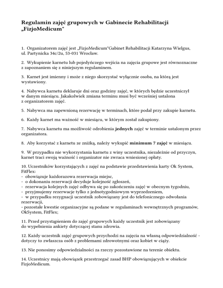 Regulamin zajęć grupowych w Gabinecie Rehabilitacji „FizjoMedicum" 1. Organizatorem zajęć jest „FizjoMedicum"Gabinet Rehabilitacji Katarzyna Wielgus, ul. Partynicka 34c/2u, 53-031 Wrocław. 2. Wykupienie karnetu lub pojedyńczego wejścia na zajęcia grupowe jest równoznaczne z zapoznaniem się z niniejszym regulaminem. 3. Karnet jest imienny i może z niego skorzystać wyłącznie osoba, na którą jest wystawiony. 4. Nabywca karnetu deklaruje dni oraz godziny zajęć, w których będzie uczestniczył w danym miesiącu. Jakakolwiek zmiana terminu musi być wcześniej ustalona z organizatorem zajęć. 5. Nabywca ma zapewnioną rezerwację w terminach, które podał przy zakupie karnetu. 6. Każdy karnet ma ważność w miesiącu, w którym został zakupiony. 7. Nabywca karnetu ma możliwość odrobienia jednych zajęć w terminie ustalonym przez organizatora. 8. Aby korzystać z karnetu ze zniżką, należy wykupić minimum 7 zajęć w miesiącu. 9. W przypadku nie wykorzystania karnetu z winy uczestnika, niezależnie od przyczyn, karnet traci swoją ważność i organizator nie zwraca wniesionej opłaty. 10. Uczestników korzystających z zajęć na podstawie przedstawienia karty Ok System, FitFlex: - obowiązuje każdorazowa rezerwacja miejsc, - o dokonaniu rezerwacji decyduje kolejność zgłoszeń, - rezerwacja kolejnych zajęć odbywa się po zakończeniu zajęć w obecnym tygodniu, - przyjmujemy rezerwacje tylko z jednotygodniowym wyprzedzeniem, - w przypadku rezygnacji uczestnik zobowiązany jest do telefonicznego odwołania rezerwacji, - pozostałe kwestie organizacyjne są podane w regulaminach wewnętrznych programów, OkSystem, FitFlex; 11. Przed przystąpieniem do zajęć grupowych każdy uczestnik jest zobowiązany do wypełnienia ankiety dotyczącej stanu zdrowia. 12. Każdy uczestnik zajęć grupowych przychodzi na zajęcia na własną odpowiedzialność dotyczy to zwłaszcza osób z problemami zdrowotnymi oraz kobiet w ciąży. 13. Nie ponosimy odpowiedzialności za rzeczy pozostawione na terenie obiektu. 14. Uczestnicy mają obowiązek przestrzegać zasad BHP obowiązujących w obiekcie FizjoMedicum.