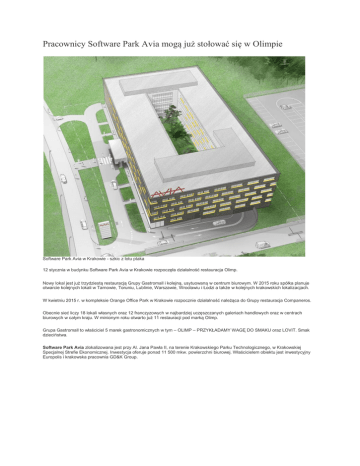 Pracownicy Software Park Avia mogą już stołować się w Olimpie Software Park Avia w Krakowie - szkic z lotu ptaka 12 stycznia w budynku Software Park Avia w Krakowie rozpoczęła działalność restauracja Olimp. Nowy lokal jest już trzydziestą restauracją Grupy Gastromall i kolejną, usytuowaną w centrum biurowym. W 2015 roku spółka planuje otwarcie kolejnych lokali w Tarnowie, Toruniu, Lublinie, Warszawie, Wrocławiu i Łodzi a także w kolejnych krakowskich lokalizacjach. W kwietniu 2015 r. w kompleksie Orange Office Park w Krakowie rozpocznie działalność należąca do Grupy restauracja Companeros. Obecnie sieć liczy 18 lokali własnych oraz 12 franczyzowych w najbardziej uczęszczanych galeriach handlowych oraz w centrach biurowych w całym kraju. W minionym roku otwarto już 11 restauracji pod marką Olimp. Grupa Gastromall to właściciel 5 marek gastronomicznych w tym – OLIMP – PRZYKŁADAMY WAGĘ DO SMAKU oraz LOVIT. Smak dzieciństwa. Software Park Avia zlokalizowana jest przy Al. Jana Pawła II, na terenie Krakowskiego Parku Technologicznego, w Krakowskiej Specjalnej Strefie Ekonomicznej. Inwestycja oferuje ponad 11 500 mkw. powierzchni biurowej. Właścicielem obiektu jest inwestycyjny Europolis i krakowska pracownia GD&K Group. Restauracja Olimp w Software Park Avia Restauracja Olimp w Software Park Avia