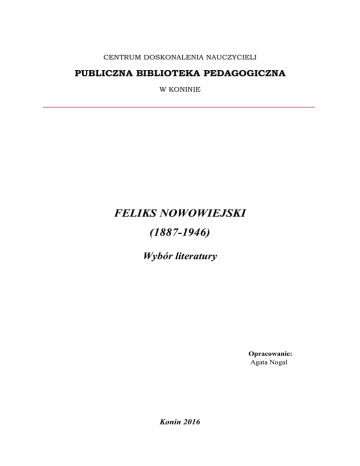 CENTRUM DOSKONALENIA NAUCZYCIELI PUBLICZNA BIBLIOTEKA PEDAGOGICZNA W KONINIE ___________________________________________________________________________ FELIKS NOWOWIEJSKI (1887-1946) Wybór literatury Opracowanie: Agata Nogal Konin 2016 Sejm ustanowił rok 2016 Rokiem Feliksa Nowowiejskiego - kompozytora, dyrygenta, autora muzyki do "Roty". "Nowowiejski zawsze stał po stronie polskości i polskiej kultury" - głosi uchwała. "Artysta był autorem wielu pieśni patriotycznych, które umacniały tożsamość narodową Polaków. W niepodległej Polsce brał czynny udział w tworzeniu i organizowaniu życia artystycznego. (...) Jego dorobek wywarł wpływ na kulturę muzyczną całego świata, a w szczególności Polski. Artysta zawsze stał po stronie polskości i polskiej kultury" – czytamy w uchwale. WYDAWNICTWA ZWARTE 1. BARCZEWO: rodzinne miasto Felixa Nowowiejskiego / Wojciech Zenderowski.Barczewo : Centrum Kultury i Promocji Gminy, 2010 2. BYDGOSKIE rękopisy Roty M. Konopnickiej i F. Nowowiejskiego / Józef Podgóreczny.- Bydgoszcz : Kujawsko-Pomorskie Towarzystwo Kulturalne, [1980] 3. FELIKS Nowowiejski / Zbigniew Kozub.- Poznań : Ars Nova, 1994 4. Feliks Nowowiejski, artysta i wychowawca / Jan Boehm.- Olsztyn : Ośrodek Badań Naukowych im. Wojciecha Kętrzyńskiego w Olsztynie ; Wyższa Szkoła Pedagogiczna w Olsztynie, 1985 5. FELIKS Nowowiejski : 1877-1946 : zarys biograficzny / Jan Boehm.- Olsztyn : Pojezierze, 1977 6. FELIKS Nowowiejski : w setną rocznicę urodzin / Prace Specjalne.- Gdańsk : Wyższa Szkoła Pedagogiczna w Olsztynie, 1978 7. GRUNWALD, "Rota", Nowowiejski : konferencja naukowa, Olsztyn, 14 czerwca 2010 / red. Jan Chłosta, Janusz Jasiński i Zenona Rondomańska.- Olsztyn : Agencja WIT Witold Mierzejewski, 2010 8. MAŁY Feluś wyrusza w świat / Katarzyna Kowalczyk.- Barczewo : Stowarzyszenie Inicjatyw Obywatelskich, [2011] 2 9. NIE RZUCIM ziemi, skąd nasz ród ... / Dioniza Wawrzykowska-Wierciochowa.Warszawa : Wydaw. Min. Obrony Narodowej, 1988 10. OD PIEŚNI do symfonii / red. Krzysztof D. Szatrawski.- Barczewo : Stowarzyszenie Inicjatyw Obywatelskich, 2013 11. OJCIEC - Anioł : wspomnienie o Feliksie Nowowiejskim / z Niną i Janem Nowowiejskimi rozmawiają Małgorzata Durnowska i Łukasz Kałużny.- Poznań : Inicjatywa Wydawnicza "Jerozolima" : przy współpr. W Drodze, 2000 12. PATRIOTYCZNE i religijne źródła twórczości Feliksa Nowowiejskiego / red. Krzysztof D. Szatrawski.- Barczewo : Stowarzyszenie Inicjatyw Obywatelskich, 2008 13. PRAWYKONANIE światowe pierwszego oratorium Feliksa Nowowiejskiego Powrót syna marnotrawnego op. 3, Olsztyn, Święta Lipka 1993 : wybrane problemy wykonawcze muzyki chóralnej na przykładzie dzieła / Józef Wojtkowiak.- Olsztyn : Wyższa Szkoła Pedagogiczna. Wydawnictwo, 1998 14. PROBLEMATYKA wykonawcza utworów organowych Feliksa Nowowiejskiego w świetle poglądów estetycznych kompozytora na przykładzie wybranych symfonii opus 45 / Ireneusz Wyrwa ; Katolicki Uniwersytet Lubelski Jana Pawła II. Wydział Teologii. Instytut Muzykologii.- Lublin : Wydawnictwo KUL, 2011 15. W KRĘGU kultury romantycznej : w 200-lecie urodzin Fryderyka Chopina i w 100lecie powstania "Roty" Feliksa Nowowiejskiego / red. Krzysztof D. Szatrawski.Barczewo: Stowarzyszenie Inicjatyw Obywatelskich, 2010 Literatura dostępna w bibliotece w Koninie oraz Filiach w Kole, Słupcy i Turku. 1. Feliks Nowowiejski : 1877-1946 : zarys biograficzny / Jan Boehm.- Olsztyn : Wydawnictwo "Pojezierze", 1977 Sygnatura: 24539 (Konin) Sygnatura: 17559 (Koło) Sygnatura: 11865 (Słupca) 2. Kantyczki z nutami / zebr. Jan Kaszycki, muzykę przejrzał Feliks Nowowiejski ; wyd. Melchior Kądzioła.- Lublin : Wydawnictwo Kurii Biskupiej, 1984 Sygnatura: 95525 (Konin) 3. Nie rzucim ziemi ... : pieśni do słów Roty Marii Konopnickiej : na chór a cappella / oprac. Feliks Nowowiejski, Stanisław Prószyński.- Bydgoszcz : "Pomorze", 1985 Sygnatura: 45848 (Konin) 4. Nie rzucim ziemi, skąd nasz ród... / Dioniza Wawrzykowska-Wierciochowa.Warszawa : Wydawnictwo Ministerstwa Obrony Narodowej, 1988 Sygnatura: 53784 (Konin) Sygnatura: 30093 (Turek) 3 ARTYKUŁY Z CZASOPISM 1. ANIOŁ / Tomasz Cyz. Muzyka i Bóg // W Drodze. - 2008, [nr] 5, s. 110-112 2. CZY pieśń uszła cało? : WebQuest dla uczniów szkoły ponadgimnazjalnej / Krystyna Dyba. Bibliogr. // Wiadomości Historyczne : czasopismo dla nauczycieli. – 2011, nr 5, s. 25-33 3. FELIKS Nowowiejski o Szkole Muzyki Kościelnej w Ratyzbonie / Ilona Dulisz ; Wydział Sztuki. Zakład Teorii Muzyki i Edukacji Muzycznej. Uniwersytet Warmińsko-Mazurski w Olsztynie. Streszcz. ang., niem. // Studia Warmińskie. – 2014, t. 51, s. 297-308 4. FELIKS Nowowiejski - znany i nieznany / Antoni Buchner // Ruch Muzyczny. 2009, nr 25, s. 32-33 5. FELIKS Nowowiejski znany i nieznany / Michał Piotrowski // Musica Sacra Nova. – 2007, R. 1, nr 1 , s. 467-469 6. GRAM muzykę Nowowiejskiego / Rudolf Innig ; rozm. przepr. Jarosław Ciecierski. // Muzyka 21. - 2008, nr 10 , s. 33-34 7. "GRUNWALD" Feliksa Nowowiejskiego : myśląc Ojczyzna... / J. Polonus. // Źródło. - 2010, nr 27, s. 18 8. IDIOM polifonii religijnej i symbolika konfesyjna w Missa "Christus spes mea" Feliksa Nowowiejskiego / Stanisław Dąbek // Annales Lublinenses pro Musica Sacra. - 2010, nr 1, s. 395-419 9. INSPIRACJE religijne w twórczości organowej Feliksa Nowowiejskiego / Teresa Dorożała-Brodniewicz // Musica Sacra Nova. - 2007, nr 1 s. 117-121 10. JAK się nie grało, tak się i nie gra / Krzysztof Panasik // Przegląd Powszechny. 2009, nr 3, s. 162-165 11. [LISTY do redakcji] / Jan Nowowiejski, Janina Nowowiejska [Odpowiedź] / Agnieszka Lewandowska-Kąkol. // Przegląd Powszechny. – 2009, nr 1, s. 153-157 12. PIEŚNI Feliksa Nowowiejskiego / Barbara Ewa Werner. Streszcz. ang. // Zeszyt Naukowy / Akademia Muzyczna im. Karola Lipińskiego we Wrocławiu. – 2001, Nr 81 , s. 115-126 13. RECEPCJA twórczości poetek z kręgu Skamandra w liryce wokalne