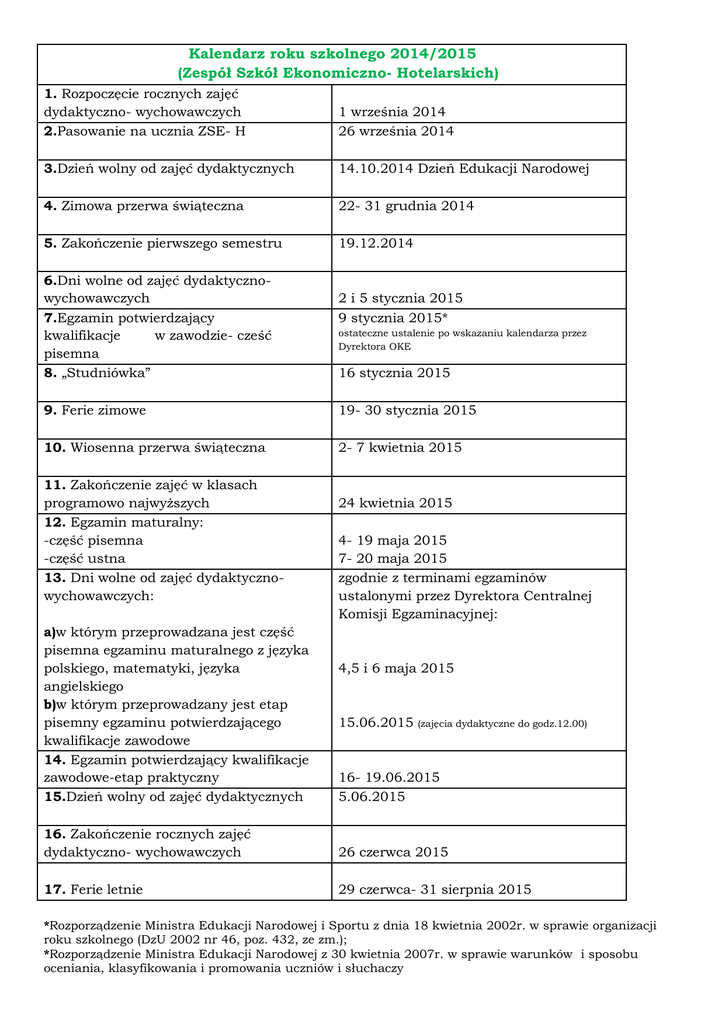Kalendarz roku szkolnego 2014/2015 (Zespół Szkół Ekonomiczno- Hotelarskich) 1. Rozpoczęcie rocznych zajęć dydaktyczno- wychowawczych 2.Pasowanie na ucznia ZSE- H 1 września 2014 26 września 2014 3.Dzień wolny od zajęć dydaktycznych 14.10.2014 Dzień Edukacji Narodowej 4. Zimowa przerwa świąteczna 22- 31 grudnia 2014 5. Zakończenie pierwszego semestru 19.12.2014 6.Dni wolne od zajęć dydaktycznowychowawczych 7.Egzamin potwierdzający kwalifikacje w zawodzie- cześć pisemna 8. „Studniówka” 2 i 5 stycznia 2015 9 stycznia 2015* ostateczne ustalenie po wskazaniu kalendarza przez Dyrektora OKE 16 stycznia 2015 9. Ferie zimowe 19- 30 stycznia 2015 10. Wiosenna przerwa świąteczna 2- 7 kwietnia 2015 11. Zakończenie zajęć w klasach programowo najwyższych 12. Egzamin maturalny: -część pisemna -część ustna 13. Dni wolne od zajęć dydaktycznowychowawczych: a)w którym przeprowadzana jest część pisemna egzaminu maturalnego z języka polskiego, matematyki, języka angielskiego b)w którym przeprowadzany jest etap pisemny egzaminu potwierdzającego kwalifikacje zawodowe 14. Egzamin potwierdzający kwalifikacje zawodowe-etap praktyczny 15.Dzień wolny od zajęć dydaktycznych 24 kwietnia 2015 4- 19 maja 2015 7- 20 maja 2015 zgodnie z terminami egzaminów ustalonymi przez Dyrektora Centralnej Komisji Egzaminacyjnej: 4,5 i 6 maja 2015 15.06.2015 (zajęcia dydaktyczne do godz.12.00) 16- 19.06.2015 5.06.2015 16. Zakończenie rocznych zajęć dydaktyczno- wychowawczych 26 czerwca 2015 17. Ferie letnie 29 czerwca- 31 sierpnia 2015 *Rozporządzenie Ministra Edukacji Narodowej i Sportu z dnia 18 kwietnia 2002r. w sprawie organizacji roku szkolnego (DzU 2002 nr 46, poz. 432, ze zm.); *Rozporządzenie Ministra Edukacji Narodowej z 30 kwietnia 2007r. w sprawie warunków i sposobu oceniania, klasyfikowania i promowania uczniów i słuchaczy oraz przeprowadzania sprawdzianów i egzaminów w szkołach publicznych (Dz U 2007 nr 83, poz. 562, ze zm.). *Rozporządzenie Ministra Edukacji Narodowej z 30 grudnia 2009 roku w sprawie organizacji roku szkolnego