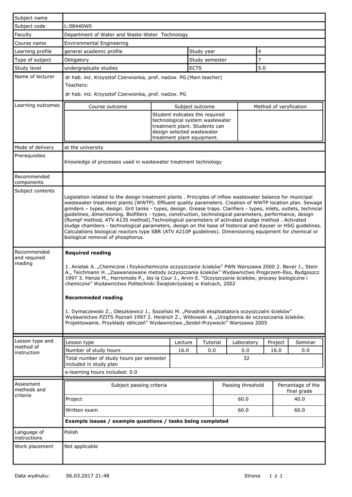Subject name Subject code L:08440W0 Faculty Department of Water and Waste-Water Technology Course name Environmental Engineering Learning profile general academic profile Study year 4 Type of subject Obligatory Study semester 7 Study level undergraduate studies ECTS 5.0 Name of lecturer dr hab. inż. Krzysztof Czerwionka, prof. nadzw. PG (Main teacher) Teachers: dr hab. inż. Krzysztof Czerwionka, prof. nadzw. PG Learning outcomes Course outcome Subject outcome Method of veryfication Student indicates the required technological system wastewater treatment plant. Students can design selected wastewater treatment plant equipment. Mode of delivery at the university Prerequisites Knowledge of processes used in wastewater treatment technology Recommended components Subject contents Legislation related to the design treatment plants . Principles of inflow wastewater balance for municipal wastewater treatment plants (WWTP). Effluent quality parameters. Creation of WWTP location plan. Sewage grinders – types, design. Grit tanks - types, design. Grease traps. Clarifiers - types, inlets, outlets, technical guidelines, dimensioning. Biofilters - types, construction, technological parameters, performance, design (Rumpf method, ATV A135 method).Technological parameters of activated sludge method . Activated sludge chambers - technological parameters, design on the base of historical and Kayser or HSG guidelines. Calculations biological reactors type SBR (ATV A210P guidelines). Dimensioning equipment for chemical or biological removal of phosphorus. Recommended and required reading Required reading 1. Anielak A. „Chemiczne i fizykochemiczne oczyszczanie ścieków” PWN Warszawa 2000 2. Bever J., Stein A., Teichmann H. „Zaawansowane metody oczyszczania ścieków” Wydawnictwo Projprzem-Eko, Bydgoszcz 1997 3. Henze M., Harremoës P., Jes la Cour J., Arvin E. “Oczyszczanie ścieków, procesy biologiczne i chemiczne” Wydawnictwo Politechniki Świętokrzyskiej w Kielcach, 2002 Recommeded reading 1. Dymaczewski Z., Oleszkiewicz J., Sozański M. „Poradnik eksploatatora oczyszczalni ścieków” Wydawnictwo PZITS Poznań 1997 2. Heidrich Z., Witkowski A. „Urządzenia do oczyszczania ścieków. Projektowanie. Przykłady obliczeń” Wydawnictwo „Seidel-Przywecki” Warszawa 2005 Lesson type and method of instruction Lesson type Number of study hours Lecture Tutorial Laboratory Project Seminar 16.0 0.0 0.0 16.0 0.0 Total number of study hours per semester included in study plan 32 e-learning hours included: 0.0 Assesment methods and criteria Subject passing criteria Passing threshold Percentage of the final grade Project 60.0 40.0 Written exam 60.0 60.0 Example issues / example questions / tasks being completed Language of instructions Polish Work placement Not applicable Data wydruku: 06.03.2017 21:48 Strona 1 z 1