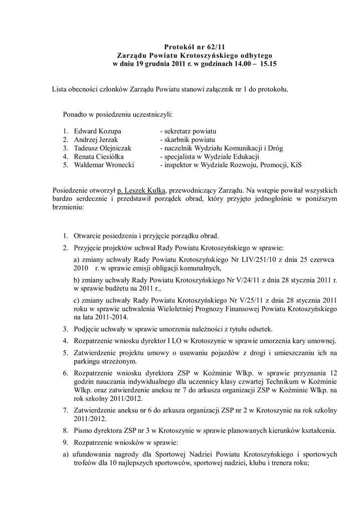 Protokół nr 62/11 Zarządu Powiatu Krotoszyńskiego odbytego w