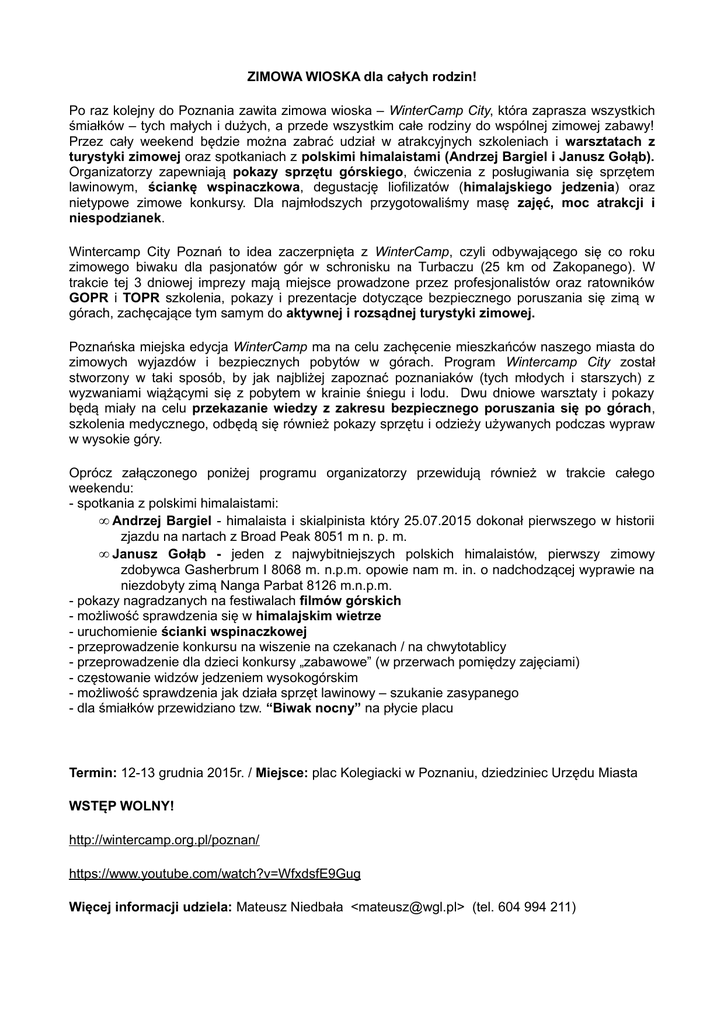 ZIMOWA WIOSKA dla całych rodzin! Po raz kolejny do Poznania zawita zimowa wioska – WinterCamp City, która zaprasza wszystkich śmiałków – tych małych i dużych, a przede wszystkim całe rodziny do wspólnej zimowej zabawy! Przez cały weekend będzie można zabrać udział w atrakcyjnych szkoleniach i warsztatach z turystyki zimowej oraz spotkaniach z polskimi himalaistami (Andrzej Bargiel i Janusz Gołąb). Organizatorzy zapewniają pokazy sprzętu górskiego, ćwiczenia z posługiwania się sprzętem lawinowym, ściankę wspinaczkowa, degustację liofilizatów (himalajskiego jedzenia) oraz nietypowe zimowe konkursy. Dla najmłodszych przygotowaliśmy masę zajęć, moc atrakcji i niespodzianek. Wintercamp City Poznań to idea zaczerpnięta z WinterCamp, czyli odbywającego się co roku zimowego biwaku dla pasjonatów gór w schronisku na Turbaczu (25 km od Zakopanego). W trakcie tej 3 dniowej imprezy mają miejsce prowadzone przez profesjonalistów oraz ratowników GOPR i TOPR szkolenia, pokazy i prezentacje dotyczące bezpiecznego poruszania się zimą w górach, zachęcające tym samym do aktywnej i rozsądnej turystyki zimowej. Poznańska miejska edycja WinterCamp ma na celu zachęcenie mieszkańców naszego miasta do zimowych wyjazdów i bezpiecznych pobytów w górach. Program Wintercamp City został stworzony w taki sposób, by jak najbliżej zapoznać poznaniaków (tych młodych i starszych) z wyzwaniami wiążącymi się z pobytem w krainie śniegu i lodu. Dwu dniowe warsztaty i pokazy będą miały na celu przekazanie wiedzy z zakresu bezpiecznego poruszania się po górach, szkolenia medycznego, odbędą się również pokazy sprzętu i odzieży używanych podczas wypraw w wysokie góry. Oprócz załączonego poniżej programu organizatorzy przewidują również w trakcie całego weekendu: - spotkania z polskimi himalaistami: • Andrzej Bargiel - himalaista i skialpinista który 25.07.2015 dokonał pierwszego w historii zjazdu na nartach z Broad Peak 8051 m n. p. m. • Janusz Gołąb - jeden z najwybitniejszych polskich himalaistów, pierwszy zimowy zdobywca Gasherbrum I 8068 m. n.p.m. opowie nam m. in. o nadchodzącej wyprawie na niezdobyty zimą Nanga Parbat 8126 m.n.p.m. - pokazy nagradzanych na festiwalach filmów górskich - możliwość sprawdzenia się w himalajskim wietrze - uruchomienie ścianki wspinaczkowej - przeprowadzenie konkursu na wiszenie na czekanach / na chwytotablicy - przeprowadzenie dla dzieci konkursy „zabawowe” (w przerwach pomiędzy zajęciami) - częstowanie widzów jedzeniem wysokogórskim - możliwość sprawdzenia jak działa sprzęt lawinowy – szukanie zasypanego - dla śmiałków przewidziano tzw. “Biwak nocny” na płycie placu Termin: 12-13 grudnia 2015r. / Miejsce: plac Kolegiacki w Poznaniu, dziedziniec Urzędu Miasta WSTĘP WOLNY! http://wintercamp.org.pl/poznan/ https://www.youtube.com/watch?v=WfxdsfE9Gug Więcej informacji udziela: Mateusz Niedbała <[email protected]> (tel. 604 994 211)