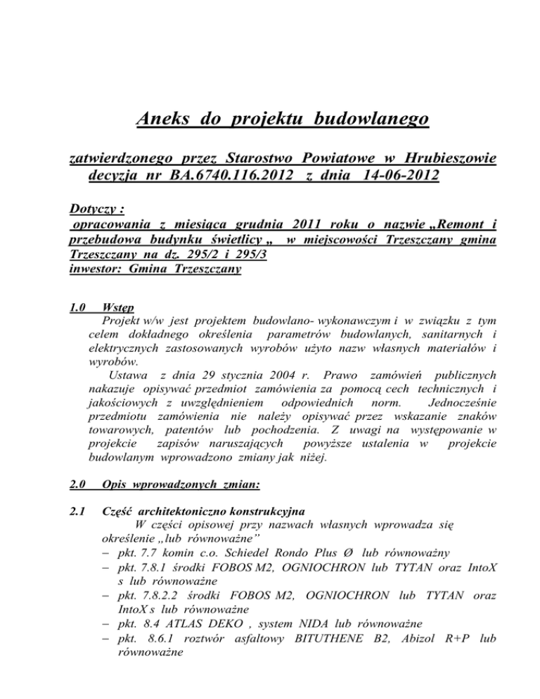 Aneks do projektu budowlanego zatwierdzonego przez Starostwo Powiatowe w Hrubieszowie decyzja nr BA.6740.116.2012 z dnia 14-06-2012 Dotyczy : opracowania z miesiąca grudnia 2011 roku o nazwie „Remont i przebudowa budynku świetlicy „ w miejscowości Trzeszczany gmina Trzeszczany na dz. 295/2 i 295/3 inwestor: Gmina Trzeszczany 1.0 Wstęp Projekt w/w jest projektem budowlano- wykonawczym i w związku z tym celem dokładnego określenia parametrów budowlanych, sanitarnych i elektrycznych zastosowanych wyrobów uŜyto nazw własnych materiałów i wyrobów. Ustawa z dnia 29 stycznia 2004 r. Prawo zamówień publicznych nakazuje opisywać przedmiot zamówienia za pomocą cech technicznych i jakościowych z uwzględnieniem odpowiednich norm. Jednocześnie przedmiotu zamówienia nie naleŜy opisywać przez wskazanie znaków towarowych, patentów lub pochodzenia. Z uwagi na występowanie w projekcie zapisów naruszających powyŜsze ustalenia w projekcie budowlanym wprowadzono zmiany jak niŜej. 2.0 Opis wprowadzonych zmian: 2.1 Część architektoniczno konstrukcyjna W części opisowej przy nazwach własnych wprowadza się określenie „lub równowaŜne” − pkt. 7.7 komin c.o. Schiedel Rondo Plus Ø lub równowaŜny − pkt. 7.8.1 środki FOBOS M2, OGNIOCHRON lub TYTAN oraz IntoX s lub równowaŜne − pkt. 7.8.2.2 środki FOBOS M2, OGNIOCHRON lub TYTAN oraz IntoX s lub równowaŜne − pkt. 8.4 ATLAS DEKO , system NIDA lub równowaŜne − pkt. 8.6.1 roztwór asfaltowy BITUTHENE B2, Abizol R+P lub równowaŜne Remont budynku świetlicy w Trzeszczanach − pkt. 8.6.2 wełna mineralna ROCKMIN lub równowaŜny − pkt. 9.1 ATLAS STOPTER K-2; ATLAS SILIKAT R; STOPTER K-20 ; ATLAS WODER E lub równowaŜny − pkt. 9.2 uszczelki EPDM lub równowaŜne − pkt. 11.1 palisada Nostalit lub równowaŜny − pkt. 11.2 kostka Holland lub równowaŜny W części rysunkowej przy nazwach własnych wprowadza się określenie „lub równowaŜne” − rys. nr 2 Schiedel Rondo Plus Ø lub równowaŜny − rys. nr 3 Schiedel Rondo Plus Ø lub równowaŜny − rys. nr 4 wyłaz dachowy WSZ lub równowaŜny − rys. nr 6 izolacja Bituthene B2 lub równowaŜny − rys. nr 12 LB lub równowaŜny − rys. nr 15 FOBOS M2, OGNIOCHRON lub TYTAN oraz IntoX s lub równowaŜne 2.2 Instalacje sanitarne W części opisowej przy nazwach własnych wprowadza się określenie „lub równowaŜne” − pkt. 2 koszulki TERMOCOMPACT-S lub równowaŜny − pkt. 3.1 grzejniki stalowe – płytowe „PURMO” lub równowaŜne − pkt. 3.2 zawory grzejnikowe Danfoss typ RA-N z głowicami termostatycznymi Typ RAW-K 5135 Danfoss ; zestawy przyłączeniowe - kątowe marki OVENTROP „Multiflex F” ; zawory powrotne OVENTROP Typ Combi 3 lub 4; zawory spustowe kulowe z motylkiem Walwex nr kat. MF – 1582/010 ; termometry tarczowe bimetaliczne M52/NS63/G1/2”/Lt=50 lub równowaŜne − pkt. 3.7 kocioł olejowy typ VITOLA 200 firmy VISSMANN o mocy 22 kW z palnikiem olejowym Vitoflame 200 typ VEKI-1 ; pompka obiegowa WILO STAR E 25/1-5; zawór bezpieczeństwa spręŜynowy SYR Typu 1915; komin Schiedel Rondo Plus Ø lub równowaŜne W części „obliczenia technologiczne” przy nazwach własnych wprowadza się określenie „ lub równowaŜne” − pkt. 1 kocioł firmy Viessmann Typ VITOLA 200 o mocy znamionowej 22 kW z palnikiem olejowym Vitoflame 200 typ VEKI1 lub równowaŜny − pkt. 2 komin Schiedel Rondo Plus Ø lub równowaŜny − pkt. 5.1 zawór bezpieczeństwa SYR typ 1915 Ø15/20 lub równowaŜny − pkt. 5.2 n.w. przeponowe „REFLEX” 18N lub równowaŜne − pkt. 6 pompa WILO STAR E 25/1-5 SSM lub równowaŜna − pkt. 7.2 zbiorniki firmy Viessmann o poj. 1500 l lub równowaŜne Remont budynku świetlicy w Trzeszczanach W części rysunkowej przy nazwach własnych wprowadza się określenie „lub równowaŜne” − rys. nr 1 Schiedel Rondo Plus Ø 20; kocioł olejowy VITOLA 200 o mocy 22 kW; przeponowe naczynie wzbiorcze firmy Reflex lub równowaŜne − rys. nr 2 Schiedel Rondo Plus Ø 20; kocioł olejowy VITOLA 200 o mocy 22 kW; przeponowe naczynie wzbiorcze firmy Reflex lub równowaŜne − rys. nr 3 Schiedel Rondo Plus Ø 20 lub równowaŜny − rys. nr 4 kocioł olejowy VITOLA 200 o mocy 22 kW; przeponowe naczynie wzbiorcze firmy Reflex lub równowaŜne 2.3 Instalacje elektryczne W części opisowej przy nazwach własnych wprowadza się określenie „ lub równowaŜne” − pkt. 1.8 oprawy OP1-S8TA1N lub równowaŜne − pkt. 1.13 ochronniki zespolone klasy B+C typ ETITEC WENT 15/25 TNS 255V ; ochronnik ETITEC D 275/3 lub równowaŜne W części rysunkowej przy nazwach własnych wprowadza się określenie „ lub równowaŜne” − rys. nr 2 oprawy prod. ES-SYSTEM S.A.; oprawa typu downlight D225 2x18 W EVG ds. IP20; oprawa świetlówkowa BASE 2x18 W EVG ds. IP 44; oprawa świetlówkowa K 4x18W P-A EVG ds. IP 20; oprawa świetlówkowa CO1 2x36W EVG ns. IP 65; oprawa świetlówkowa SRN 2x36W P-A EVG ns. IP 20; oprawa oświetlenia kierunkowego OP1-S8TA1N; oprawa świetlówkowa PF 1x18W ns. IP 54 lub równowaŜne − rys. nr 3 oprawy prod. ES-SYSTEM S.A.; oprawa typu downlight D225 2x18 W EVG ds. IP20; oprawa świetlówkowa BASE 2x18 W EVG ds. IP 44; oprawa świetlówkowa K 4x18W P-A EVG ds. IP 20; oprawa świetlówkowa CO1 2x36W EVG ns. IP 65; oprawa świetlówkowa SRN 2x36W P-A EVG ns. IP 20; oprawa oświetlenia kierunkowego OP1-S8TA1N; oprawa świetlówkowa PF 1x18W ns. IP 54 lub równowaŜne 3.0 Uwagi końcowe Poza zmianami wprowadzonymi niniejszym aneksem pozostałe treści, obliczenia i rysunki zawarte w projekcie podstawowym sa obowiązujące przy realizacji zadania inwestycyjnego „Remont i przebudowa budynku świetlicy” w Trzeszczanach. Wprowadzenie materiałów budowlanych równowaŜnych w stosunku do wymienionych w Projekcie Budowlanym „Remont i przebudowa budynku Remont budynku świetlicy w Trzeszczanach świetlicy” w Trzeszczanach nie stanowi istotnego odstąpienia od zatwierdzonego pr