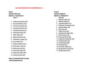 SĄ JESZCZE MIEJSCA DLA UCZNIÓW KLAS 4-6. Grupa I sportowa dziewcząt Opiekun p. Tyszkowska D. sala 11 1. Kalinowska Gabriela (4b) 2. Muraszko Wiktoria (4b) 3. Czarnecka Gabriela (4b) 4. Dmochowska Diana (4c) 5. Sobolewska Oliwia (4c) 6. Rytelewska Alicja (5c) 7. Matys Oliwia (5c) 8. Ejdys Aleksandra (5c) 9. Danielewicz Izabela (5c) 10. Kaca Natalia (5c) 11. Głębocka Wiktoria (5c) 12. Wnorowska Julia (5c) 13. Kędzierska Julia (5c) 14. Piotrowska Maja (5d) 15. Kulikowska Oliwia (6b) 16. Żukowska Maria (6b) Grupa w poniedziałek idzie na basen -proszę przygotować się. Grupa II sportowa chłopców Opiekun p. Dobkowski R. sala 103 1. Bagiński Jakub (4c) 2. Skrodzki Rafał (4c) 3. Jankowski Wiktor (4c) 4. Pietrewicz Przemysław (5a) 5. Badorek Wiktor (5b) 6. Wajs Filip (5b) 7. Ciołko Cezary (5b) 8. Święćkowska Nikola (6b) 9. Biryło Szymon (6b) 10. Kacperski Maciej (6b) 11. Fojutowski Aleksander (6b) 12. Danieluk Oskar (6b) 13. Korzeb Oliwier (6b) 14. Buć Michał (6c) 15. Pomichter Hubert (6c) 16. Romanowski Szymon (6c) 17. Zwolak Szymon (6c) Grupa III Opiekun p. Szumska K. sala 103 1. Jentoch Kinga (4a) 2. Maciorowska Oliwia (4a) 3. Maliszewska Żaneta (4a) 4. Piotrowska Maja (5d) 5. Deputat Paulina (5d) 6. Tchórzewski Piotr (4a) 7. Kaszkiel Jakub (4a) 8. Kotarski Karol (4a) 9. Trzeciakowski Michał (4a) 10. Miech Kacper (4a) 11. Mastaj Wiktor (4a) 12. Byczkowski Piotr (4b) 13. Badorek Kacper (4b) 14. Zwolak Bartosz (4b) 15. Piekarski Oliwier (4b) Grupa w poniedziałek idzie na basen -proszę przygotować się. Grupa IV Opiekun p. Gajdemska K.. sala 104 1. Borowska Maja (0a) 2. Crzanowska Pola (0a) 3. Leonik Aleksandra(0a) 4. Babiński Aleksander(0a) 5. Przyborowska Julia (0a) 6. Łepkowska Kinga (0a) 7. Pińczak Liliana (0a) 8. Maciorowska Alicja (0b) 9. Iwaszko Zofia (0b) 10. Supińska Liliana (0b) 11. Wróblewski Miłosz (0b) 12. Januszewski Jakub (1a) 13. Popoławski Miłosz(1a) 14. Iwaszko Jakub(1a) Grupa V Opiekun p. Wiśniewska E. sala 206 1. Sienda Aleksandra (1b) 2. Juszkiewicz Artur (1b) 3. Korycki Bartosz (1b) 4. Sulima Gabriela (2f) 5. Małanowski Maja (2f) 6. Ciurzycki Oskar (2f) 7. Korf Marlena (2f) 8. Prądzyński Franciszek(2f) 9. Popoławski Oliwier (2f) 10. Węcek Bartosz (2g) 11. Igor Szybiński (2g) 12. Kalisz Urszula (2g) 13. Nadolny Igor (3b) 14. Kuligowski Maximilian (2a) Grupa VI Opiekun p. Perkowska M. sala 204 1. Bućko Zuzanna (2c) 2. Turowska Maria (2c) 3. Sosnowska Wiktoria (2c) 4. Mróz Igor (2c) 5. Danieluk Marcel (2c) 6. Wiszniewska Maja (2c) 7. Konecko Agata (2c) 8. Kuczyński Paweł (2c) 9. Póltarzycki Dawid (2c) 10. Nitkowska Helena (2e) 11. Zalewski Kacper (2e) 12. Wysocka Aniela (2a) 13. Cuper Oliwia (3d) 14. Dminiak Kornelia (3f) 15. Barańczuk Oliwia (3f) Grupa VII Opiekun p. Radzaj M. sala 108 1. Kołnacka Julia (3c) 2. Koniecko Weronika (3c) 3. Piaścik Piotr (3c) 4. Siwik Julia (3c) 5. Wasilczyk Natalia (3c) 6. Krejczman Mateusz (3c) 7. Wysocka Oliwia (3c) 8. Smolańczuk Antonina (3c) 9. Piekarska Maja (3c) 10. Korf Milena (3c) 11. Kasprak Michalina (3c) 12. Korszeko Gabriela (3c) 13. Truszkowski Olaf (3c) 14. Mikoś Gabriela (3c) 15. Paszkowska Kinga (3b) 16. Kurzątkowski Jakub (3c) Grupa VIII Opiekun p. Skowrońska T. sala 205 1. Lewandowska Ida (3a) 2. Synowiec Anna (3a) 3. Śliż Arkadiusz (3a) 4. Uździło Szymon (3a) 5. Świeczko Krzysztof (3a) 6. Maszkowska Zuzanna (3a) 7. Sadowska Nikola (3a) 8. Sadowski Jakub (3a) 9. Gorzoch Łucja (3a) 10. Przyborowska Wiktoria (3a) 11. Babińska Zuzanna (3a) 12. Klimaszewski Dawid (3a) 13. Kruczewski Szymon (3a) 14. Makowski Jakub (3a) Grupa IX Opiekun p. Marcińczyk E. sala 105 1. Korsak Maryla (3b) 2. Przyborowska Oliwia (3d) 3. Śmiech Mikołaj (3d) 4. Wilkiewicz Jakub Antoni (3d) 5. Jagłowska Zofia (3d) 6. Dobrowolski Jakub (3d) 7. Kirycki Kamil (3d) 8. Kamiński Bartosz (3d) 9. Crzanowski Remigiusz (3d) 10. Ramotowwski Aleksander (3d) 11. Chruszcz Maja (3d) 12. Dminiak Kornelia (3f) 13. Chmielewska Amelia (3g) 14. Miech Aleksandra (3g) 15. Bilmon Oliwia (3g) Grupa X Opiekun p. Faszczewska-Kuźma B. sala 203 1. Perkowska Zuzanna (2a) 2. Rejmer Maria (2a) 3. Rytelewska Patrycja (2a) 4. Gawedzka Gabriela (2b) 5. Halicka Wiktoria (2b) 6. Żytyniec Piotr (2b) 7. Mścichowska Amelia (2b) 8. Grygo Pola (2b) 9. Smokowska Maja (2d) 10. Olichwier Adam (2d) 11. Duchnowska Agata (2d) 12. Mikoś Zuzanna (2d) 13. Nowalaska Oliwia (2d) 14. Sadowski Dawid (2d)