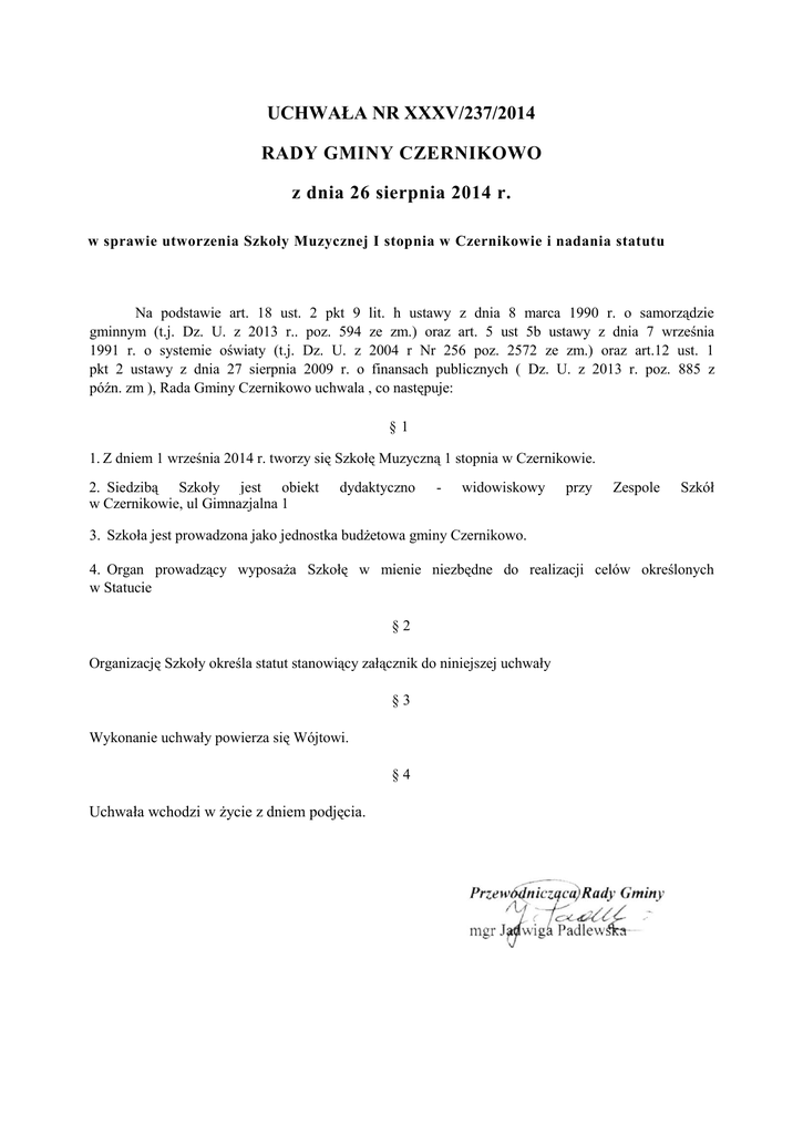 UCHWAŁA NR XXXV/237/2014 RADY GMINY CZERNIKOWO z dnia 26 sierpnia 2014 r. w sprawie utworzenia Szkoły Muzycznej I stopnia w Czernikowie i nadania statutu Na podstawie art. 18 ust. 2 pkt 9 lit. h ustawy z dnia 8 marca 1990 r. o samorządzie gminnym (t.j. Dz. U. z 2013 r.. poz. 594 ze zm.) oraz art. 5 ust 5b ustawy z dnia 7 września 1991 r. o systemie oświaty (t.j. Dz. U. z 2004 r Nr 256 poz. 2572 ze zm.) oraz art.12 ust. 1 pkt 2 ustawy z dnia 27 sierpnia 2009 r. o finansach publicznych ( Dz. U. z 2013 r. poz. 885 z późn. zm ), Rada Gminy Czernikowo uchwala , co następuje: §1 1. Z dniem 1 września 2014 r. tworzy się Szkołę Muzyczną 1 stopnia w Czernikowie. 2. Siedzibą Szkoły jest obiekt w Czernikowie, ul Gimnazjalna 1 dydaktyczno - widowiskowy przy Zespole Szkół 3. Szkoła jest prowadzona jako jednostka budżetowa gminy Czernikowo. 4. Organ prowadzący wyposaża Szkołę w mienie niezbędne do realizacji celów określonych w Statucie §2 Organizację Szkoły określa statut stanowiący załącznik do niniejszej uchwały §3 Wykonanie uchwały powierza się Wójtowi. §4 Uchwała wchodzi w życie z dniem podjęcia. Uzasadnienie Uchwałą Nr XXIX /209/2014 z dnia 31 stycznia 2014 r. Rada Gminy wyraziła wolę utworzenia w gminie Szkoły Muzycznej I stopnia w Czernikowie. Podjęcie ww. uchwały umożliwiło Wójtowi Gminy wystąpienie z wnioskiem do Ministra Kultury i Dziedzictwa Narodowego o wyrażenie zgody na jej prowadzenie. W wyniku pozytywnej weryfikacji warunków lokalowych, wyposażenia szkoły oraz kwalifikacji kadry nauczycielskiej zostało podpisane porozumienie z Ministrem Kultury i Dziedzictwa Narodowego w sprawie wyrażenia zgody na utworzenie i prowadzenie szkoły muzycznej. Zgodnie z art. 58 ust. 6 ustawy z dnia 7 września 1991 r. o systemie oświaty organ zakładający szkołę publiczną podpisuje akt założycielski oraz nadaje pierwszy statut. Niniejsza uchwała jest wypełnieniem obowiązku ustawowego. Załącznik Nr 1 do Uchwały nr XXXV/237/2014 Rady Gminy Czernikowo z dnia 26 sierpnia 2014 r. STATUT SZKOŁY MUZYCZNEJ I STOPNIA W CZERNIKOWIE Statut opracowano zgodnie z Rozporządzeniem Ministra Kultura i Dziedzictwa Narodowego z dnia 31 sierpnia 2005 roku w sprawie ramowych statutów publicznych szkół i placówek artystycznych. Podstawa prawna: 1. Art. 60 ust.2 ustawy z dnia 7 września 1991 r. o systemie oświaty ( Dz. U. z 2004 r. Nr 256, poz. 2572, z późn. zm.) 2. Ustawa z dnia 26 stycznia 1982 r. Karta Nauczyciela (Dz. U. z 2006 r. nr 97, poz. 674 z późn. zm.) 3. Rozporządzenie Ministra Kultury z dnia 31 sierpnia 2005 r. w sprawie ramowych statutów publicznych szkół i placówek artystycznych ( Dz. U. Nr 181, poz. 1507 z późn.zm.) 4. Rozporządzenie Ministra Kultury i Dziedzictwa Narodowego z dnia 8 kwietnia 2008 r. w sprawie warunków i sposobu oceniania, klasyfikowania i promowania uczniów oraz przeprowadzania sprawdzianów i egzaminów w publicznych szkołach i placówkach artystycznych ( Dz. U. Nr 65, poz. 400.) 5. Rozporządzenie Ministra Kultury i Dziedzictwa Narodowego z dnia 16 czerwca 2011 r. w sprawie warunków i trybu przyjmowania uczniów do publicznych szkół i placówek artystycznych oraz przechodzenia z jednych typów szkół do innych ( Dz. U. z 2011 r. Nr 142, poz. 831) SPIS TREŚCI Str. I POSTANOWIENIA OGÓLNE 4 II CELE I ZADANIA SZKOŁY 4 III ORGANY SZKOŁY 5 IV NAUCZYCIELE I INNI PRACOWNICY SZKOŁY V WSPÓŁPRACA Z RODZICAMI VI ORGANIZACJA PRACY SZKOŁY 7 8 8 VII SYSTEM OCENIANIA 10 VIII UCZNIOWIE SZKOŁY, ICH PRAWA I OBOWIĄZKI 12 IX ZASADY REKRUTACJI 14 X POSTANOWIENIA KOŃCOWE 3 14 I POSTANOWIENIA OGÓLNE § 1. 1. Szkoła Muzyczna I stopnia w Czernikowie, zwana dalej Szkołą, jest publiczną szkołą artystyczną dającą podstawy wykształcenia muzycznego. 2. Siedziba Szkoły znajduje się w Czernikowie adres : 87-640 Czernikowo, ul. Gimnazjalna 1 3. Szkoła używa nazwy: Szkoła Muzyczna I stopnia w Czernikowie. 4. Na pieczątkach, stemplach i pieczęciach używa się nazwy w pełnym brzmieniu według wzoru: Szkoła Muzyczna I stopnia w Czernikowie. 5. Szkoła nie posiada imienia, a ewentualnego nadania może dokonać organ prowadzący, na wspólny wniosek Rady Pedagogicznej, Rady Rodziców i Samorządu Uczniowskiego. 6. Organem założycielskim i prowadzącym szkołę jest gmina Czernikowo. 7. Nadzór pedagogiczny nad Szkołą sprawuje Minister Kultury i Dziedzictwa Narodowego za pośrednictwem Centrum Edukacji Artystycznej w Warszawie. II CELE I ZADANIA SZKOŁY § 2. Szkoła realizuje zadania w oparciu o ustawę z 7 września 1991 r. o systemie oświaty (t.j. Dz. U. z 2004 r. Nr 256, poz. 2572 z późn. zm.) oraz inne obowiązujące przepisy. § 3. Zadaniem Szkoły jest: 1) rozbudzenie i rozwijanie podstawowych zdolności muzycznych; 2) umuzykalnienie oraz przygotowanie wrażliwych i świadomych odbiorców muzyki; 3) przygotowanie uczniów do dalszego kształcenia zawodowego w szkole muzycznej II stopnia; 4) wychowanie osób oddziaływujących na otoczenie w sferze kultury. § 4. Szkoła realizuje zadania, o których mowa w § 3 Statutu poprzez: 1) prowadzenie indywidualnych zajęć nauki gry na instrumentach, teoretycznych lekcji zbiorowych oraz zespołów muzycznych w zakresie przedmiotów objętych planem nauczania; 2) udział uczniów i nauczycieli w konkursach i konsultacjach, przesłuchaniach, festiwalach i koncertach, przeglądach; 4 3) współdziałanie z samorządem lokalnym w rozwijaniu działalności kulturalnej w zakresie organizacji koncertów, konkursów oraz innych imprez i projektów artystycznych; 4) dostosowanie metod nauczania do indywidualnych predyspozycji uczniów. III ORGANY SZKOŁY § 5. 1. Organami Szkoły są: 1) Dyrektor Szkoły; 2) Rada Pedagogiczna; 3) Rada Rodziców; 4) Samorząd Uczniowski. Dyrektor szkoły § 6. 1. Stanowisko Dyrektora Szkoły powierza organ prowadzący zgodnie z obowiązującymi przepisami. 2. Dyrektor Szkoły w szczególności: 1) kieruje działalnością S