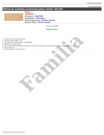 Informacje o produkcie Utworzono 06-03-2017 Wkład do szuflady kuchennej płyta wielof. EK1201 Cena : 199,00 zł Producent : ESSETRE Dostępność : Dostępny Stan magazynowy : bardzo wysoki Średnia ocena : brak recenzji Producent: ESSETRE Made in Italy ili a materiał: klejone drewno bukowe zabezpieczenie drewna: olej do szuflad firmy BLUM, system TANDEMBOX, głębokość szuflady 500mm płyta z drewna bukowego jako podstawa do dowolnych konfiguracji modułów na patelnie, butelki, talerze, i inne. waga (kg): 4,30 wymiary(SxGxW ): 1115x470x15 Fa m 1. 2. 3. 4. 5. 6. 7. Wygenerowano w programie www.oscGold.com