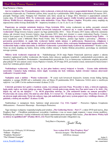 Neal Frisby Partnerzy Capstone © MAJ 2014 Drogi Partnerze w Żniwie, Jest to wyjątkowy list. Przeanalizujemy wiele wydarzeń, o których była mowa w poprzednich listach. Pierwsze ważne wydarzenie rozpoczęło się 17stoletnim cyklem, który zaczął się w październiku 2008. Drugim wydarzeniem był marzec 2011, początek 7letniego cyklu. Następny był 14stoletni cykl, który zaczął się 3 lutego 2012. Również w poprzednich cytatach ważna data, 23 kwiecień 2014. To wydarzenie znane jako (grand square) wielki kwadrat powszechnie znany jako Główny Wielki Krzyż, obejmujący cztery ciała niebieskie: Uran, Mars, Pluton i Jupiter. Wszystkie cztery znajdują się naprzeciwko siebie tworząc doskonały 90 – stopniowy kwadrat o 13, na 13, na 13, na 13 stopni. Popatrzmy na ostatnie zaćmienie księżyca 15ego kwietnia 2014, ważne wydarzenie na niebie, początek czterech krwawych księżyców. Pierwszy z czterech krwawych księżyców wydarzył się w czasie żydowskiej Paschy, ważne wydarzenie! Drugi krwawy księżyc pojawi się 8ego października 2014. – Teraz 20 marca 2015 mamy całkowite zaćmienie słońca, jak również trzeci krwawy księżyc 4ego kwietnia 2015, który jest również w czasie żydowskiej Paschy. Czwarty księżyc krwi pojawi się 28 września 2015. Wszystkie cztery księżyce krwi dzieją się w czasie ważnych świąt Żydów. – A teraz wyjątkowy cytat z biblioteki Brata Neala Frisby: Dan. 9:6 objawia, „koniec tego będzie z powodzią.” „Możemy z pewnością przewidzieć, że nagła fala wydarzeń będzie miała miejsce w politycznym, finansowym, religijnym i naukowym świecie i niezwykłe zmiany tuż przed powrotem Jezusa, które wstrząsną fundamentami społeczeństwa. Te wydarzenia będą o takim znaczeniu, że niektóre wydarzenia z przeszłości będą wydawać się nieistotne!” Koniec cytatu. Teraz na ziemi znajdują się ludzie, którzy zrobią wielkie zmiany w bardzo bliskiej przyszłości, pozwalając na zaistnienie nowego systemu. Milowy krok wydarzeń rozpoczął się – Nadchodzącego 24-26 maja Papież Franciszek (pierwszy papież z zakonu Jezuitów) zaplanował wielkie wydarzenie dla Izraela, które dotyczy spotkania izraelskich i palestyńskich przywódców, jak również Żydów, Katolików, Protestantów i muzułmańskich przywódców. Czy to historyczne wydarzenie mogłoby przynieść plan pokoju? W tym samym czasie wizyty Papieża w Izraelu, 24-29 maja 2014, jest kometa Linear, meteorytowa burza komet i może być widziana gołym okiem.! Nadchodzące wydarzenia – Słyszy się, że jest plan budowy nowej świątyni w Izraelu. – Liczne ciała niebieskie (asteroidy i komety) będą widziane, które nigdy wcześniej nie były widziane, będzie również większa aktywność wulkanów i trzęsień ziemi. Nadejdzie znak z niebios – Ważne wydarzenie – W czasie tych krwawych księżyców, kometa zwana Siding Spring nadejdzie w zasięgu 80,000 mil o niebiański włos od Marsa 29 października 2014. Naukowiec NASA mówi o możliwym wpływie 1 na 2,000. Coś do zaobserwowania! (Łukasz 21:25) Człowiek powinien być gotów o każdym czasie, wyczekując powrotu Pana. Wszystkie te daty, o których napisano, będą miały wpływ na świat, jakim go znany. Niepokój i strach pokrywają ziemię, lecz Pan mówi nam w Iz. 44:8, „Nie bójcie się, ani się nie lękajcie.” – Iz. 46:10 poprzedza mówiąc, że „On ustanowił koniec na samym początku.” Przybywamy do czasu, który On miał na celu! (Koh. 3:1 i werset 11) – Te daty są istotne i ważne. Wszystko to wydarzy się niczym nagłe uderzenie. Świat nie zobaczy tego, jak nadchodzi, gdyż nowy system pojawi się z wielkiego chaosu. „W godzinie, o której nie myślisz!” (Łukasz 12:40) Nadchodzące w następnym liście, będziesz mógł przeczytać: Czy USA Upada? – Proroctwo Ogłasza Urządzenie Obliczeniowe – Proroctwo Maszeruje – Rozwinięcie Proroctwa. Tego miesiąca wydajemy wspaniałą książkę pod tytułem „The Gathering Storm – Part 2”, a także DVD pod nazwą „Run Prophecy Run” – Chciałbym podziękować wszystkim i każdemu z was za wasze ciągłe wsparcie i wasze wierne modlitwy. Publikacja tej cudownej i ważnej wiadomości nie będzie zapomniana przez naszego Pana Jezusa. „Pan dał słowo: Wielcy byli ci, którzy to opublikowali!” (Psalmy 68:11, (12) Niech Pan nadal prowadzi i błogosławi cię. Twój Brat w Chrystusie, Wszystkie trzy CD/Kasety, $15.00 donacja “Nahum – Prophecy” “Prophetic Mysteries” “The Ultimate Example” w w w. N e a l F r i s b y. p l Gerald Frisby Nowe wydane DVD: “Run Prophecy Run” Również dostępne: “The Resurrection” ($20.00/szt. donacja) Postbus 71 8050 AB Hattem Tel: +31644752537