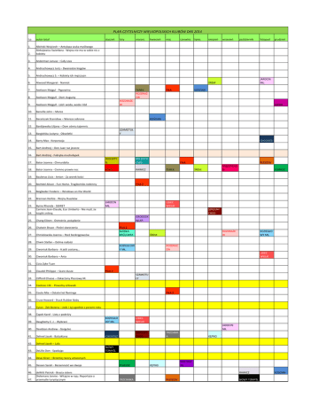 PLAN CZYTELNICZY WIELKOPOLSKICH KLUBÓW DKK 2014 l.p. autor tytuł 1. 2. Albioski Wojciech – Antylopa szuka myśliwego Aleksijewicz Swietłana - Wojna nie ma w sobie nic z kobiety 3. Anderman Janusz – Cały czas 4. Andruchowycz Jurij – Dwanaście kręgów 5. Andruchowycz S. – Kobiety ich mężczyzn 6. Atwood Margaret - Namiot 7. Axelsson Majgul - Pępowina 8. Axelsson Majgull - Dom Augusty 9. Axelsson Majgull - Lód i woda, woda i lód 10. Banville John – Morze 11. Baraoczak Stanisław – Wiersze zebrane 12. Bardijewska Liljana – Dom ośmiu tajemnic 13. Bargielska Justyna - Obsoletki 14. Barry Max - Korporacja 15. Bart Andrzej – Don Juan raz jeszcze 16. Bart Andrzej - Fabryka muchołapek 17. Bator Joanna - Chmurdalia WOLSZTY N MIEDZICH OWO 18. Bator Joanna - Ciemno prawie noc KOŁO RAWICZ 19. Baulenas Lluis - Anton - Za worek kości 20. Bechdel Alison - Fun Home. Tragikomiks rodzinny 21. Beigbeder Frederic – Windows on the World 22. Brennan Herbie - Wojny Duszków 23. Byrne Rhonda - SEKRET Carriere Jean-Claude, Eco Umberto - Nie myśl, że książki znikną 24. 25. Chang Eileen - Ostrożnie, pożądanie 26. Chatwin Bruce - Pieśni stworzenia 27. Chmielewska Joanna – Rzeź bezkręgowców 28. Chwin Stefan – Dolina radości 29. Ciwoniuk Barbara - A jeśli zostanę… 30. Ciwoniuk Barbara – Ania 31. Cizia Zyke Tuan 32. Claudel Philippe – Szare dusze 33. Clifford Chasse – Oskarżony Pluszowy M. 34. Coetzee J.M. - Powolny człowiek 35. Couto Mia – Ostatni lot flaminga 36. Cruse Howard - Stuck Rubber Baby 37. Cyran - Żak Bożena – Jedz i żyj zgodnie z porami roku 38. Dapek Karel - Listy z podróży 39. Daugherty C. J. - Wybrani 40. Davidson Andrew - Gargulec 41. Dehnel Jacek - Balzakiana 42. Dehnel Jacek – Lala 43. DeLillo Don - Spadając 44. Desai Kiran – Brzemię rzeczy utraconych 45. Dessen Sarah - Bezsennośd we dwoje 46. deWitt Patrick - Bracia sisters Dielemans Jennie - Witajcie w raju. Reportaże o przemyśle turystycznym 47. styczeo luty marzec kwiecieo maj czerwiec lipiec sierpieo wrzesieo październik PIŁA grudzieo JAROCIN MŁ. ŚREM TUREK ROZDRAŻ EW listopad KOŚCIAN ROZDRAŻE W KONIN KOŚCIAN SZAMOTUŁ Y CHODZIEŻ PIŁA TUREK PLESZEW MIĘDZYCHÓ D ŚREM POWIDZ PIŁA 2 JAROCIN MŁ. LISIEC WIELKI SZKOLNY CHOD. GRODZISK WLKP. PIŁA 2 MODŁA KRÓLEWSK ROZDRAŻE W ŚREM KOZIEGŁOW Y MŁ. KOZIEGŁO WY MŁ. ROZDRAŻ EW LISIEC WIELKI PIŁA 2 SZAMOTU ŁY PIŁA 2 KOZIEGŁO WY MŁ. LISIEC WIELKI JAROCIN MŁ. SZKOLNYCHOD. CHODZIEŻ TRZCIANK A KĘPNO NOWY TOMYŚL POWIDZ KROTOSZ YN KĘPNO RAWICZ TRZCIANKA PLESZEW NOWY TOMYŚL KOŚCIAN l.p. autor tytuł styczeo luty marzec 48. Doerry Martin - Moje zranione serce 49. Dukaj Jacek - Córka łupieżcy 50. Dukaj Jacek – Inne pieśni 51. Dukaj Jacek - Wroniec 52. Dylan Bob – Kroniki 53. Enerlich Katarzyna - Prowincja pełna smaków 54. Enquist Per Olov - Opowieśd o Blanche i Marie 55. Esterhazy Peter – Harmonia caelestis 56. Eugenides Jeffrey - Intryga małżeoska 57. Exupéry Antonie de Saint – O sens życia 58. Faber Michel – Szkarłatny płatek i biały 59. Ferid Zoran- Pułapka na myszy Walta Disneya KOŁO 60. Foley – Zakochaj się w życiu PIŁA 61. Fox Marta – Iza Anoreczka KROTOSZYN 62. Fox Marta – Kaśka Podrywaczka KROTOSZ YN 63. Fox Marta – Kobieta zaklęta w kamieo ZDUNY 64. Franco Jorge – Paraíso Travel 65. Fuguet Alberto - Filmy mojego życia 66. Gaude Laurent – Słooce Scortów 67. Glukhovsky Dmitry - Metro 2033 68. Gortad Grzegorz – Do pierwszej krwi 69. Gortat Grzegorz – Szczury i wilki 70. Goźlioski Paweł - Jul 71. Gretkowska Manuela – Agent 72. Gross Jan T. - Strach 73. Grylls Bear - Złoto bogów 74. Gutowska-Adamczyk Małgorzata – 13 poprzeczna 75. Gutowska-Adamczyk Małgorzata – wystarczy, że jesteś 76. Hakl Emil - O rodzicach i dzieciach 77. Herbert Zbigniew - Wiersze Wybrane 78. Hewson David - Dochodzenie 79. 80. Higgins Fiona E. - Magia kości Highsmith Patricia - Księga zemsty dla miłośników zwierząt 81. Hoppe Felicitas - Piknik fryzjerów 82. Hornby Nick – Długa droga w dół 83. Hornby Nick - Wpadka 84. Houellebecq Michel - Mapa i terytorium 85. Houellebecq Michel - Możliwośd wyspy 86. Hrabal Bohumil – Piękna Rupieciarnia 87. Huelle Paweł – Ostatnia wieczerza 88. Hughes T. - Pogromca snów i inne… 90. Indridason Arnaldur - Grobowa cisza 91. Iwanec Aleksandr– Riwne / Rowno 92. Iwasiów Inga - Bambino 93. Jaffrey Madhur - Wśród mangowych drzew 94. Jagielska Grażyna - Miłośd z kamienia 95. Jagielska Grażyna - Płaskuda KĘPNO WĄGROW IEC MIEDZICH OWO PLESZEW kwiecieo ROZDRAŻE W maj czerwiec lipiec sierpieo wrzesieo październik listopad grudzieo ROZDRAŻ EW RAWICZ LESZNO KOŚCIAN JAROCIN RAWICZ MODŁA KRÓLEWSK PIŁA ROZDRAŻ EW TRZCIANKA WĄGROWIE C ŚREM PLESZEW PLESZEW NOWY TOMYŚL KOŚCIAN MODŁA KRÓLEWS OBORNIKI PIŁA TRZCIANK A KĘPNO ŚREM ROZDRAŻEW ŚREM NOWY TOMYŚL PIŁA WOLSZTY N OBRA KOŁO LISIEC WIELKI SZAMOTU ŁY POWIDZ SZAMOTUŁ Y KĘPNO JAROCIN MODŁA KRÓLEWS KA LESZNO MIEDZICH OWO OBORNIKI KOŚCIAN KONIN KĘPNO RAWICZ OBORNIKI l.p. autor tytuł 96. Jagielski Wojciech - Wypalanie traw 97. 98. Jagiełło Joanna - Czekolada z Chili Januszkiewicz M., Pleskaczyoski A. – Kronika rozmaitości wielkopolskich 99. Jelinek Elfride – Amatorki styczeo luty TRZCIANK A marzec kwiecieo PIŁA maj czerwiec LESZNO lipiec sierpieo RAWICZ wrzesieo październik listopad KĘPNO grudzieo MODŁA KRÓLEWS KOZIEGŁOW Y MŁ. WOLSZTYN OBRA MIĘDZYCH ÓD 100. Jerofiejew Wienedikt – Moskwa Pietuszki SZAMOTU ŁY 101. Kalder Daniel - Dziwne teleskopy 102. Kalder Daniel - Zagubiony kosmonauta 103. Kalicinska Małgorzata – Dom nad rozlewiskiem 104. Kalicinska Małgorzata – Miłośd nad rozlewiskiem 105. Kalicinska Małgorzata – Powroty nad rozlewisko KOZIEGŁOW Y MŁ. 106. Kapuścioki Ryszard – Podróże z Herodotem Karpowicz Ignacy - Ości MODŁA KRÓLEWSKA POWIDZ 107. Karpowicz Ignacy - Niehalo PIŁA TUREK 108. Katz Daniel– 