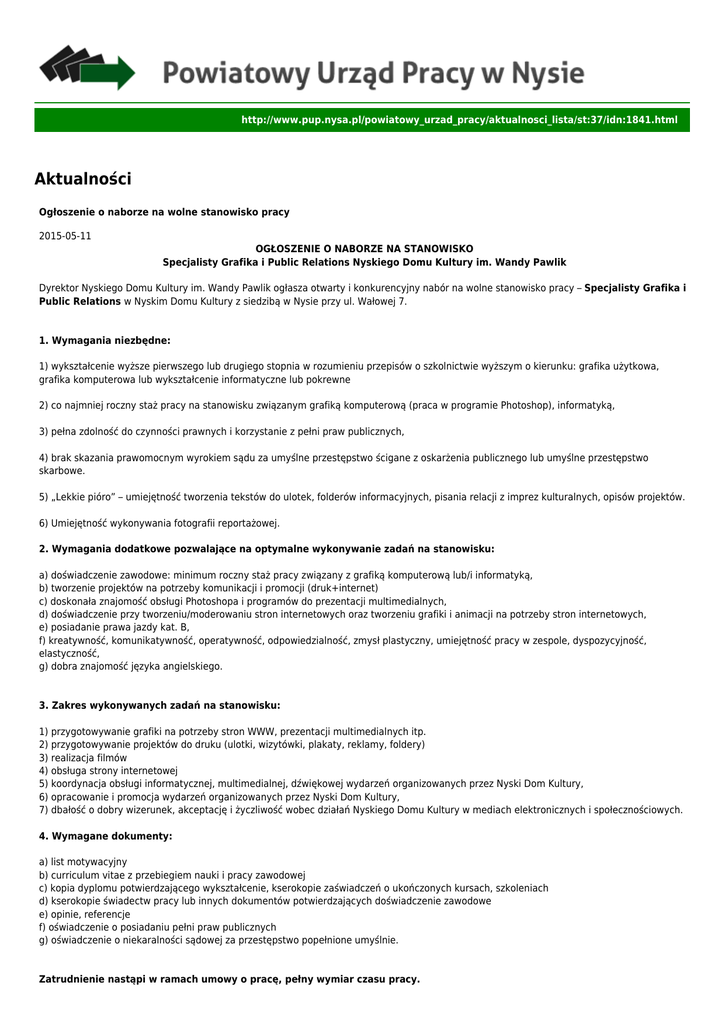 http://www.pup.nysa.pl/powiatowy_urzad_pracy/aktualnosci_lista/st:37/idn:1841.html Aktualności Ogłoszenie o naborze na wolne stanowisko pracy 2015-05-11 OGŁOSZENIE O NABORZE NA STANOWISKO Specjalisty Grafika i Public Relations Nyskiego Domu Kultury im. Wandy Pawlik Dyrektor Nyskiego Domu Kultury im. Wandy Pawlik ogłasza otwarty i konkurencyjny nabór na wolne stanowisko pracy – Specjalisty Grafika i Public Relations w Nyskim Domu Kultury z siedzibą w Nysie przy ul. Wałowej 7. 1. Wymagania niezbędne: 1) wykształcenie wyższe pierwszego lub drugiego stopnia w rozumieniu przepisów o szkolnictwie wyższym o kierunku: grafika użytkowa, grafika komputerowa lub wykształcenie informatyczne lub pokrewne 2) co najmniej roczny staż pracy na stanowisku związanym grafiką komputerową (praca w programie Photoshop), informatyką, 3) pełna zdolność do czynności prawnych i korzystanie z pełni praw publicznych, 4) brak skazania prawomocnym wyrokiem sądu za umyślne przestępstwo ścigane z oskarżenia publicznego lub umyślne przestępstwo skarbowe. 5) „Lekkie pióro” – umiejętność tworzenia tekstów do ulotek, folderów informacyjnych, pisania relacji z imprez kulturalnych, opisów projektów. 6) Umiejętność wykonywania fotografii reportażowej. 2. Wymagania dodatkowe pozwalające na optymalne wykonywanie zadań na stanowisku: a) doświadczenie zawodowe: minimum roczny staż pracy związany z grafiką komputerową lub/i informatyką, b) tworzenie projektów na potrzeby komunikacji i promocji (druk+internet) c) doskonała znajomość obsługi Photoshopa i programów do prezentacji multimedialnych, d) doświadczenie przy tworzeniu/moderowaniu stron internetowych oraz tworzeniu grafiki i animacji na potrzeby stron internetowych, e) posiadanie prawa jazdy kat. B, f) kreatywność, komunikatywność, operatywność, odpowiedzialność, zmysł plastyczny, umiejętność pracy w zespole, dyspozycyjność, elastyczność, g) dobra znajomość języka angielskiego. 3. Zakres wykonywanych zadań na stanowisku: 1) przygotowywanie grafiki na potrzeby stron WWW, prezentacji multimedialnych itp. 2) przygotowywanie projektów do druku (ulotki, wizytówki, plakaty, reklamy, foldery) 3) realizacja filmów 4) obsługa strony internetowej 5) koordynacja obsługi informatycznej, multimedialnej, dźwiękowej wydarzeń organizowanych przez Nyski Dom Kultury, 6) opracowanie i promocja wydarzeń organizowanych przez Nyski Dom Kultury, 7) dbałość o dobry wizerunek, akceptację i życzliwość wobec działań Nyskiego Domu Kultury w mediach elektronicznych i społecznościowych. 4. Wymagane dokumenty: a) list motywacyjny b) curriculum vitae z przebiegiem nauki i pracy zawodowej c) kopia dyplomu potwierdzającego wykształcenie, kserokopie zaświadczeń o ukończonych kursach, szkoleniach d) kserokopie świadectw pracy lub innych dokumentów potwierdzających doświadczenie zawodowe e) opinie, referencje f) oświadczenie o posiadaniu pełni praw publicznych g) oświadczenie o niekaralności sądowej za przestępstwo popełnione umyślnie. Zatrudnienie nastąpi w ramach umowy o pracę, pełny wymiar czasu pracy. Wymagane dokumenty aplikacyjne: list motywacyjny, CV powinny być opatrzone klauzulą: "Wyrażam zgodę na przetwarzanie moich danych osobowych zawartych w ofercie dla potrzeb niezbędnych do realizacji procesu rekrutacji zgodnie z ustawą z dnia 29 sierpnia 1997 r. o ochronie danych osobowych (Dz. U. z 2002 r. Nr 101, poz.926 z późniejszymi zm.) oraz opublikowanie na stronie NDK – mojego nazwiska i imienia dla potrzeb niezbędnych do realizacji procesu rekrutacji).” Wymagane dokumenty aplikacyjne w kopercie z dopiskiem „Dotyczy naboru na stanowisko Specjalisty Grafika i Public Relations Nyskiego Domu Kultury im. Wandy Pawlik” należy składać w sekretariacie siedziby Nyskiego Domu Kultury im. Wandy Pawlik w Nysie ul. Wałowa 7 lub przesłać pocztą/kurierem na adres: Nyski Dom Kultury im. Wandy Pawlik ul. Wałowa 7 48-300 Nysa OFERTY NALEŻY ZŁOŻYĆ W NIEPRZEKRACZALNYM TERMINIE DO DNIA 22 MAJA 2015r. DO GODZ. 1000 DECYDUJE DATA I CZAS WPŁYWU DO SEKRETARIATU NDK Bliższe informacje można uzyskać pod nr Tel. : 77 433 33 37 Aplikacje, które wpłyną do Nyskiego Domu Kultury im. Wandy Pawlik po wyżej określonym terminie nie będą rozpatrywane. Informacja o wyniku naboru będzie umieszczona na stronie internetowej Biuletynu Informacji Publicznej pod adresem: www.bip.nysa.pl w dziale: Nyski Dom Kultury/Praca. wszystkie wiadomości