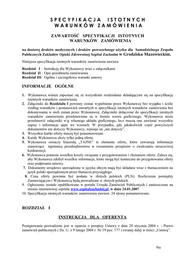 SPECYFIKACJA ISTOTNYCH WARUNKÓW ZAMÓWIENIA ZAWARTOŚĆ SPECYFIKACJI ISTOTNYCH WARUNKÓW ZAMÓWIENIA na dostawę druków medycznych i druków powszechnego użytku dla Samodzielnego Zespołu Publicznych Zakładów Opieki Zdrowotnej Szpital Zachodni w Grodzisku Mazowieckim. Niniejsza specyfikacja istotnych warunków zamówienia zawiera: Rozdział I : Instrukcję dla Wykonawcy wraz z załącznikami Rozdział II : Opis przedmiotu zamówienia Rozdział III: Ogólne i szczegółowe warunki umowy INFORMACJE OGÓLNE 1. Wykonawca winien zapoznać się ze wszystkimi rozdziałami składającymi się na specyfikację istotnych warunków zamówienia. 2. Załączniki do Rozdziału I powinny zostać wypełnione przez Wykonawcę bez wyjątku i ściśle według warunków i postanowień zawartych w specyfikacji istotnych warunków zamówienia bez dokonywania w nich zmian przez Wykonawcę. Załączniki dołączone do specyfikacji istotnych warunków zamówienia przedstawione są w formie wzoru graficznego. Wykonawca może przedstawić załączniki w/g własnego układu graficznego, lecz muszą one zawierać wszystkie zapisy i informacje ujęte we wzorach. W przypadku, gdy jakakolwiek część powyższych dokumentów nie dotyczy Wykonawcy, wpisuje on „nie dotyczy”. 3. Wszystkie kartki oferty muszą być ponumerowane. 4. Każdy Wykonawca złoży tylko jedną ofertę. 5. Wykonawca oznaczy klauzulą „TAJNE” te elementy oferty, które zawierają informacje stanowiące tajemnicę przedsiębiorstwa w rozumieniu przepisów o zwalczaniu nieuczciwej konkurencji. 6. Wykonawca poniesie wszelkie koszty związane z przygotowaniem i złożeniem oferty. Zaleca się, aby Wykonawca zdobył wszelkie informacje, które mogą być konieczne do przygotowania oferty oraz podpisania umowy. 7. Dokumenty urzędowe sporządzone w języku obcym mają być składane wraz z tłumaczeniem na język polski sporządzonym przez tłumacza przysięgłego. 8. Cena oferty powinna być podana w złotych polskich (PLN). Rozliczenia pomiędzy Zamawiającym i Wykonawcą będą prowadzone w złotych polskich. 9. Ogłoszenie zostało opublikowane w portalu Urzędu Zamówień Publicznych i umieszczone na stronie internetowej szpitala www.szpitalzachodni.pl, w dniu 24.01.2007 10. Specyfikacja istotnych warunków zamówienia zawiera 24 strony ponumerowane. ROZDZIAŁ I INSTRUKCJA DLA OFERENTA Postępowanie prowadzone jest w oparciu o przepisy Ustawy z dnia 29 stycznia 2004 r. - Prawo zamówień publicznych ( Dz. U. z 9 lutego 2004 r. Nr 19 poz. 177 ) zwanej dalej w treści „Ustawą”. Nu mer 1. ZAMAWIAJĄCY: Samodzielny Zespół Publicznych Zakładów Opieki Zdrowotnej Szpital Zachodni im. Jana Pawła II, 05-825 Grodzisk Mazowiecki, ul. Daleka 11, prowadzi politykę Zintegrowanego Systemu Zarządzania wg. wymagań PN – EN ISO 14001 : 2005, PN- EN ISO 9001 : 2001, AQAP 2120 : 2003, zaprasza do udziału w postępowaniu o udzielenie zamówienia publicznego w trybie przetargu nieograniczonego na dostawę druków medycznych i druków powszechnego użytku dla Szpitala Zachodniego w Grodzisku Mazowieckim – zgodnie z opisem przedmiotu zamówienia – rozdział II 2. OPIS SPOSOBU PRZYGOTOWANIA OFERT 2.1. Oferta winna być sporządzona na formularzu OFERTA, stanowiącym załącznik nr 1 do Instrukcji dla Wykonawcy. 2.2. Do oferty powinny być załączone wszystkie dokumenty wymagane odpowiednimi postanowieniami pkt. 3.1 Instrukcji dla Wykonawcy, stanowiące integralną część oferty. 2.3. Oferta wraz z załącznikami powinna być sporządzona w języku polskim. 2.4. Oferta wraz z załącznikami powinna być napisana na maszynie do pisania lub komputerze oraz powinna być podpisana przez upoważnionego przedstawiciela Wykonawcy. Oferty nieczytelne zostaną odrzucone. Jeżeli kartka oferty jest zapisana dwustronnie to przy numerze kartki dopisać należy słowo „verte” i drugą stronę kartki też podpisać. Załączniki do oferty powinny być również podpisane przez upoważnionego przedstawiciela Wykonawcy. Dokumenty wystawione przez podmioty obce /np. zaświadczenia, gwarancje/ złożone w ofercie w oryginale nie wymagają podpisu Wykonawcy. 2.5. Upoważnienie do podpisania oferty powinno być dołączone do oferty, o ile nie wynika z innych dokumentów załączonych do oferty. 2.6. Wszystkie miejsca, w których naniesiono zmiany / poprawki/ powinny być podpisane przez osobę podpisującą ofertę. 2.7. Jeżeli oferta zawiera informacje stanowiące tajemnicę przedsiębiorstwa w rozumieniu przepisów o zwalczaniu nieuczciwej konkurencji, Wykonawca powinien w sposób nie budzący wątpliwości zastrzec, które spośród zawartych w ofercie informacji stanowią tajemnicę przedsiębiorstwa. Informacje te powinny być umieszczone w osobnej wewnętrznej kopercie, odrębnie od pozostałych informacji zawartych w ofercie. Kartki należy ponumerować w taki sposób, aby umożliwić ich dopasowanie do pozostałej części oferty ( należy zachować ciągłość numeracji kartek oferty). 2.8. Wszystkie kartki oferty powinny być ze sobą połączone w sposób trwały, uniemożliwiający jej naruszenie / z uwzględnieniem sytuacji opisanej w punkcie 2.7./ 2.9.Wykonawca powinien zamieścić ofertę w wewnętrznej i zewnętrznej kopercie / opakowaniu/, które: będą zaadresowane na adres Zamawiającego, podany na wstępie oraz będą posiadać oznaczenia: oferta na: dostawę druków medycznych i druków powszechnego użytku nie otwierać przed 01.02.2007 r. godz. 10.30 2.10. Poza oznaczeniami podanymi powyżej, koperta / opakowanie/ zewnętrzna i wewnętrzna muszą posiadać nazwę i adres Wykonawcy, aby Wykonawca mógł wycofać ofertę lub ofertę złożoną po terminie można było zwrócić bez otwierania / po upływie terminu przewidzianego na wniesienie protestu /. 2.11. Wykonawca może wprowadzić zmiany lub wycofać złożoną przez siebie ofertę pod warunkiem, że Zamawiający otrzyma pisemne powiadomienie o wprowadzeniu zmian lub wycofani