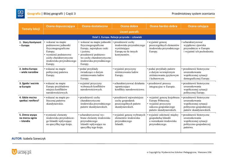 Geografia | Bliżej geografii | Część 3 Ocena dopuszczająca Tematy lekcji Przedmiotowy system oceniania Ocena dostateczna Ocena dobra Ocena bardzo dobra Ocena celująca Uczeń potrafi: Dział 1. Europa. Relacje przyroda – człowiek 1 . Stary Kontynent – Europa • wskazać na mapie • wskazać na mapie jednostki • przedstawić cechy • wyjaśnić genezę • scharakteryzować podstawowe jednostki fizycznogeograficzne środowiska przyrodniczego poszczególnych elementów wyjątkowe zjawiska fizycznogeograficzne Europy, największe rzeki wyróżniające środowiska przyrodniczego przyrodnicze w Europie Europy; i jeziora; Europę na tle innych Europy. i wyjaśnić ich pochodzenie. • wymienić podstawowe • przedstawić podstawokontynentów. cechy charakterystyczne we cechy charakterystyczne środowiska przyrodniczego środowiska przyrodniczego Europy. Europy. 2. Jedna Europa – wiele narodów • wskazać na mapie politycznej państwa Europy. • podać przykłady świadczące o dużym zróżnicowaniu ludów Europy. • wyjaśnić przyczyny zróżnicowania ludów Europy. 3. Zgoda i waśnie w Europie • wskazać na mapie Europy przykładowe miejsca konfliktów narodowościowych. • wyjaśnić przyczyny wybranych konfliktów narodowościowych. • scharakteryzować działania • przedstawić procesy ograniczające integracyjne w Europie. konflikty narodowościowe. 4. Gdzie można spotkać renifera? • wskazać na mapie politycznej państwa skandynawskie. • przedstawić cechy • przedstawić najważniejsze charakterystyczne cechy gospodarek środowiska przyrodniczego poszczególnych państw państw skandynawskich. skandynawskich. 5. Zimna wyspa na morzu ognia – Islandia • wymienić elementy środowiska przyrodniczego Islandii wpływające na specyfikę tego kraju. • scharakteryzować wy• wyjaśnić genezę wybranych • wyjaśnić zależność między brane elementy środowiska elementów środowiska gospodarką Islandii przyrodniczego przyrodniczego a warunkami środowiska Islandii wpływające na Islandii. przyrodniczego. specyfikę tego kraju. AUTOR: Izabela Szewczyk • podać przykłady państw o dużym wewnętrznym zróżnicowaniu językowym i kulturowym. • przedstawić historyczne uwarunkowania współczesnej sytuacji demograficznej Europy. • przedstawić historyczne uwarunkowania współczesnej sytuacji politycznej Europy. • wyjaśnić genezę krajobrazu • przedstawić historyczne Europy Północnej; uwarunkowania • wyjaśnić przyczyny współczesnej sytuacji sukcesu gospodarczego polityczno-gospodarczej państw skandynawskich. państw skandynawskich. • przedstawić historyczne uwarunkowania współczesnej sytuacji polityczno-gospodarczej państwa. Geografia | Bliżej geografii | Część 3 Ocena dopuszczająca Tematy lekcji Przedmiotowy system oceniania Ocena dostateczna Ocena dobra Ocena bardzo dobra Ocena celująca Uczeń potrafi: 6. Europa Zachodnia • wskazać na mapie Europy ważne regiony przemysłowe i rolnicze. • wyjaśnić pojęcia: restrukturyzacja, rolnictwo intensywne, współpraca transgraniczna. • przedstawić związki między warunkami środowiska a gospodarką wybranych regionów Europy Zachodniej. • scharakteryzować przemiany gospodarcze drugiej połowy XX wieku. • przedstawić historyczne uwarunkowania współczesnej sytuacji polityczno-gospodarczej państw Europy Zachodniej. 7. Światowa metropolia – Londyn • zlokalizować na mapie Londyn i wymienić jego podstawowe funkcje; • przedstawić zalety i wady życia w wielkim mieście. • wymienić główne cechy światowych metropolii; • scharakteryzować społeczeństwo Londynu. • opisać funkcje społeczno• przedstawić zależność -gospodarcze Londynu jako rozwoju Londynu od miasta. warunków środowiska przyrodniczego. 8. Na narty w Alpy • wskazać na mapie Alpy i państwa, w granicach których leży ten łańcuch górski. • wymienić główne cechy środowiska przyrodniczego Alp. • scharakteryzować genezę powstania górotworu Alp. • przedstawić zależność • podać przykład państwa rozwoju gospodarczego alpejskiego (innego niż Szwajcarii od warunków Szwajcaria), wskazując na środowiska przyrodniczego zależność rozwoju od Alp. środowiska przyrodniczego Alp. 9. Spadkobiercy Greków i Rzymian • wskazać na mapie europejskie państwa leżące nad Morzem Śródziemnym. • opisać główne walory środowiska przyrodniczego basenu Morza Śródziemnego. • przedstawić genezę rzeźby i warunki klimatyczne w państwach basenu Morza Śródziemnego. • scharakteryzować problemy społeczno-gospodarcze państw basenu Morza Śródziemnego. • podać przykład państwa śródziemnomorskiego (innego niż Włochy), wskazując na zależność jego rozwoju od środowiska przyrodniczego. 10. Atrakcje turystyczne Europy • podać przykłady państw europejskich o dużych walorach turystycznych. • wyjaśnić pojęcia związane z • scharakteryzować walory przyrodnicze wybranego turystyką. regionu turystycznego Europy. • scharakteryzować walory przyrodnicze wskazanego regionu turystycznego Europy. • zaproponować sposób promocji wybranego regionu Europy. AUTOR: Izabela Szewczyk • scharakteryzować inną niż Londyn europejską metropolię. Geografia | Bliżej geografii | Część 3 Ocena dopuszczająca Tematy lekcji 1 1 . Europa przyszłości Przedmiotowy system oceniania Ocena dostateczna Ocena dobra Ocena bardzo dobra Ocena celująca Uczeń potrafi: • wskazać na mapie • podać przykłady działań obszary o dużych zmianach na rzecz poprawy środowiska stanu środowiska przyrodniczego. przyrodniczego. • scharakteryzować działania • przedstawić przykłady na rzecz poprawy współpracy międzystanu środowiska narodowej w celu przyrodniczego. poprawienia stanu środowiska przyrodniczego. • wyjaśnić wpływ krajów europejskich na stan środowiska przyrodniczego w Polsce. Dział 2. Azja – Kontynent rekordów 12