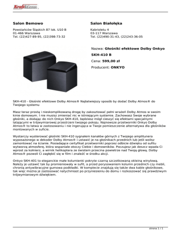 Salon Bemowo Salon Białołęka Powstańców Śląskich 87 lok. U10 B 01-466 Warszawa Tel. (22)427-89-95, (22)398-73-32 Kabrioletu 4 03-117 Warszawa Tel. (22)490-31-43, (22)243-36-05 Nazwa: Głośniki efektowe Dolby Onkyo SKH-410 B Cena: 599,00 zł Producent: ONKYO SKH-410 - Głośniki efektowe Dolby Atmos® Najłatwiejszy sposób by dodać Dolby Atmos® do Twojego systemu Masz teraz prostą i nieskomplikowaną drogę by zakosztować pełni wrażeń Dolby Atmos w swoim kinie domowym. I nie musisz zmieniać nic w istniejącym systemie. Zachowasz Swoje wybrane głośniki, a dodając do nich Onkyo SKH-410, będziesz mógł cieszyć się efektami specjalnymi latającymi w trójwymiarowej przestrzeni twojego pokoju. Najnowsze przetworniki Onkyo Dolby Atmos® to łatwa w zastosowaniu i nie ingerująca w Twoje pomieszczenie alternatywa dla głośników montowanych w suficie. Wystarczy wysterować głośniki SKH-410 sygnałem kanałów górnych z Twojego amplitunera wyposażonego w dekoder Dolby Atmos® i ustawić je na głośnikach przednich lub jeśli wolisz zamontować na ścianie. Posiadające certyfikat przetworniki poprzez odbicie dźwięku od sufitu wytworzą atmosferę, która wspaniale otoczy Ciebie i domowników. Poczujesz jak deszcz wpada Ci wprost za kołnierz, a wirnik helikoptera ze świstem przecina powietrze nad Twoją głową. Dolby Atmos® pozwoli Ci zagłębić się w film i znaleźć w środku akcji. Onkyo SKH-401 to eleganckie małe kolumienki pokryte czarną szczotkowaną okleiną winylową. Należy je ustawić tak by promieniowały w sufit, a przed porysowaniem kolumn przednich czy mebli, chronią antywibracyjne gumowa podkładki. W komplecie znajdują się także dwa kable głośnikowe, tak więc można je zastosować natychmiast po przyniesieniu do domu i rozkoszować się prawdziwym trójwymiarowym dźwiękiem. strona 1 / 1 Powered by TCPDF (www.tcpdf.org)