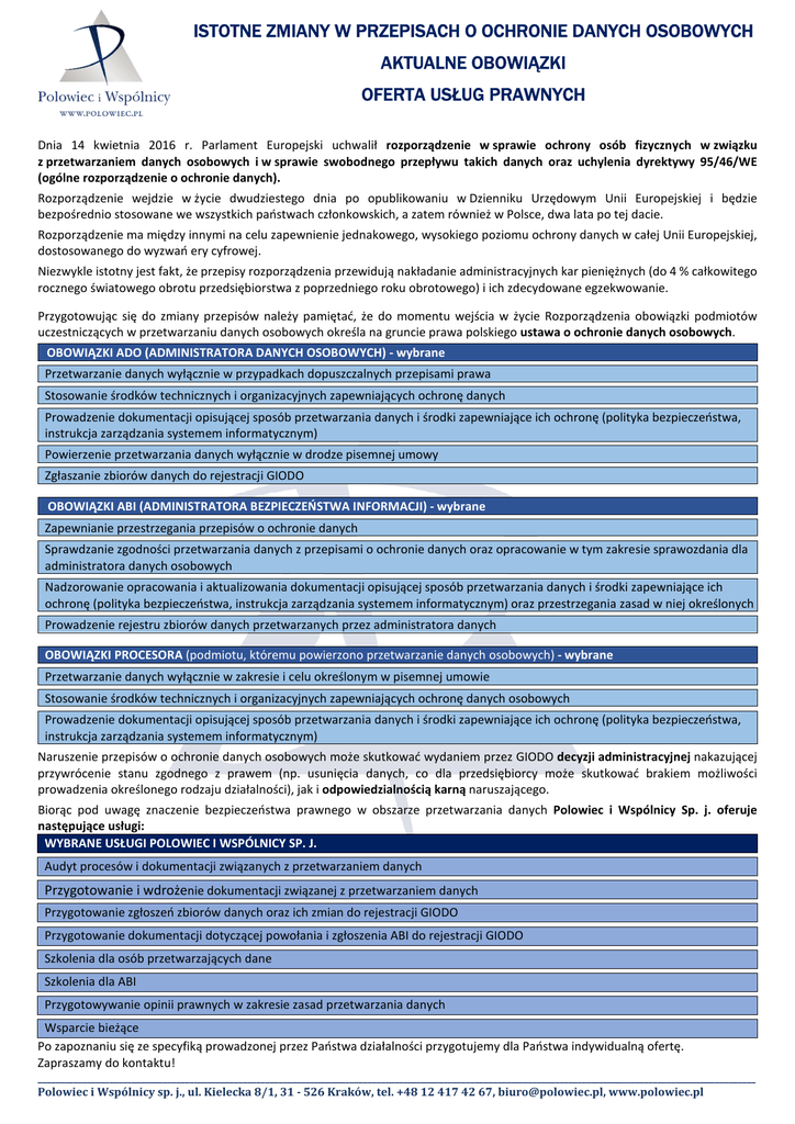ISTOTNE ZMIANY W PRZEPISACH O OCHRONIE DANYCH OSOBOWYCH AKTUALNE OBOWIĄZKI OFERTA USŁUG PRAWNYCH Dnia 14 kwietnia 2016 r. Parlament Europejski uchwalił rozporządzenie w sprawie ochrony osób fizycznych w związku z przetwarzaniem danych osobowych i w sprawie swobodnego przepływu takich danych oraz uchylenia dyrektywy 95/46/WE (ogólne rozporządzenie o ochronie danych). Rozporządzenie wejdzie w życie dwudziestego dnia po opublikowaniu w Dzienniku Urzędowym Unii Europejskiej i będzie bezpośrednio stosowane we wszystkich państwach członkowskich, a zatem również w Polsce, dwa lata po tej dacie. Rozporządzenie ma między innymi na celu zapewnienie jednakowego, wysokiego poziomu ochrony danych w całej Unii Europejskiej, dostosowanego do wyzwań ery cyfrowej. Niezwykle istotny jest fakt, że przepisy rozporządzenia przewidują nakładanie administracyjnych kar pieniężnych (do 4 % całkowitego rocznego światowego obrotu przedsiębiorstwa z poprzedniego roku obrotowego) i ich zdecydowane egzekwowanie. Przygotowując się do zmiany przepisów należy pamiętać, że do momentu wejścia w życie Rozporządzenia obowiązki podmiotów uczestniczących w przetwarzaniu danych osobowych określa na gruncie prawa polskiego ustawa o ochronie danych osobowych. OBOWIĄZKI ADO (ADMINISTRATORA DANYCH OSOBOWYCH) - wybrane Przetwarzanie danych wyłącznie w przypadkach dopuszczalnych przepisami prawa Stosowanie środków technicznych i organizacyjnych zapewniających ochronę danych Prowadzenie dokumentacji opisującej sposób przetwarzania danych i środki zapewniające ich ochronę (polityka bezpieczeństwa, instrukcja zarządzania systemem informatycznym) Powierzenie przetwarzania danych wyłącznie w drodze pisemnej umowy Zgłaszanie zbiorów danych do rejestracji GIODO OBOWIĄZKI ABI (ADMINISTRATORA BEZPIECZEŃSTWA INFORMACJI) - wybrane Zapewnianie przestrzegania przepisów o ochronie danych Sprawdzanie zgodności przetwarzania danych z przepisami o ochronie danych oraz opracowanie w tym zakresie sprawozdania dla administratora danych osobowych Nadzorowanie opracowania i aktualizowania dokumentacji opisującej sposób przetwarzania danych i środki zapewniające ich ochronę (polityka bezpieczeństwa, instrukcja zarządzania systemem informatycznym) oraz przestrzegania zasad w niej określonych Prowadzenie rejestru zbiorów danych przetwarzanych przez administratora danych OBOWIĄZKI PROCESORA (podmiotu, któremu powierzono przetwarzanie danych osobowych) - wybrane Przetwarzanie danych wyłącznie w zakresie i celu określonym w pisemnej umowie Stosowanie środków technicznych i organizacyjnych zapewniających ochronę danych osobowych Prowadzenie dokumentacji opisującej sposób przetwarzania danych i środki zapewniające ich ochronę (polityka bezpieczeństwa, instrukcja zarządzania systemem informatycznym) Naruszenie przepisów o ochronie danych osobowych może skutkować wydaniem przez GIODO decyzji administracyjnej nakazującej przywrócenie stanu zgodnego z prawem (np. usunięcia danych, co dla przedsiębiorcy może skutkować brakiem możliwości prowadzenia określonego rodzaju działalności), jak i odpowiedzialnością karną naruszającego. Biorąc pod uwagę znaczenie bezpieczeństwa prawnego w obszarze przetwarzania danych Polowiec i Wspólnicy Sp. j. oferuje następujące usługi: WYBRANE USŁUGI POLOWIEC I WSPÓLNICY SP. J. Audyt procesów i dokumentacji związanych z przetwarzaniem danych Przygotowanie i wdrożenie dokumentacji związanej z przetwarzaniem danych Przygotowanie zgłoszeń zbiorów danych oraz ich zmian do rejestracji GIODO Przygotowanie dokumentacji dotyczącej powołania i zgłoszenia ABI do rejestracji GIODO Szkolenia dla osób przetwarzających dane Szkolenia dla ABI Przygotowywanie opinii prawnych w zakresie zasad przetwarzania danych Wsparcie bieżące Po zapoznaniu się ze specyfiką prowadzonej przez Państwa działalności przygotujemy dla Państwa indywidualną ofertę. Zapraszamy do kontaktu! _________________________________________________________________________________________________________________________________________________________________ Polowiec i Wspólnicy sp. j., ul. Kielecka 8/1, 31 - 526 Kraków, tel. +48 12 417 42 67, [email protected], www.polowiec.pl