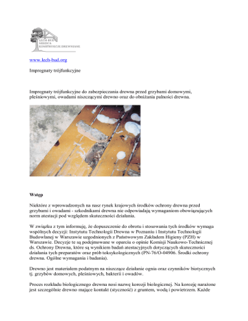 www.lech-bud.org Impregnaty trójfunkcyjne Impregnaty trójfunkcyjne do zabezpieczania drewna przed grzybami domowymi, pleśniowymi, owadami niszczącymi drewno oraz do obniżania palności drewna. Wstęp Niektóre z wprowadzonych na nasz rynek krajowych środków ochrony drewna przed grzybami i owadami - szkodnikami drewna nie odpowiadają wymaganiom obowiązujących norm atestacji pod względem skuteczności działania. W związku z tym informuję, że dopuszczenie do obrotu i stosowania tych środków wymaga wspólnych decyzji: Instytutu Technologii Drewna w Poznaniu i Instytutu Technologii Budowlanej w Warszawie uzgodnionych z Państwowym Zakładem Higieny (PZH) w Warszawie. Decyzje te są podejmowane w oparciu o opinie Komisji Naukowo-Technicznej ds. Ochrony Drewna, które są wynikiem badań atestacyjnych dotyczących skuteczności działania tych preparatów oraz prób toksykologicznych (PN-76/O-04906. Środki ochrony drewna. Ogólne wymagania i badania). Drewno jest materiałem podatnym na niszczące działanie ognia oraz czynników biotycznych tj. grzybów domowych, pleśniowych, bakterii i owadów. Proces rozkładu biologicznego drewna nosi nazwę korozji biologicznej. Na korozję narażone jest szczególnie drewno mające kontakt (styczność) z gruntem, wodą i powietrzem. Każde drewno wystawione na działanie światła słonecznego i wody deszczowej traci swój pierwotny wygląd. Wilgoć i grzyby w budynku stwarzają szkodliwe warunki dla zdrowia przebywających w nim ludzi i zwierząt oraz obniżają, a często przekreślają całkowicie użytkową wartość fragmentów lub całych budynków. Tak więc względy techniczne, technologiczne i zdrowotne zmuszają nas do zabezpieczenia budynków i budowli przed niepożądanym i szkodliwym działaniem korozji biologicznej. Jednym skutecznym sposobem przeciwdziałania temu zjawisku jest impregnacja chemiczna. Polega ona na wprowadzeniu do drewna środków ochronnych o działaniu grzybo- i owadobójczym oraz ogniochronnym. Skuteczność zabezpieczania drewna zależy od właściwości biobójczych środka, metody impregnacji, a co się z tym wiąże ilość i głębokości wniknięcia oraz trwałość środka toksycznego. Uzyskanie dobrego zabezpieczenia drewna przed ogniem i korozją biologiczną jest procesem złożonym i zależy od wielu czynników. Poza ochroną chemiczną na zdrowotność drewna istotny wpływ wywierają rozwiązania projektowe oraz prawidłowa jego konserwacja i eksploatacja. Właściwa profilaktyka konstrukcyjna, łącznie z ochroną chemiczną, może zapewnić trwałość drewna w budynkach i trwałość obiektów drewnianych. Należy podkreślić, że czynniki biotyczne są podstawowym zagrożeniem dla trwałości drewna i materiałów drewnopochodnych. Są one przyczyną dużych strat, które ponosi w każdym roku gospodarka narodowa. Toteż na życzenie czytelników Lekkiego Budownictwa Szkieletowego podaje szczegółową technologię stosowania impregnatów do zabezpieczania drewna przed działaniem ognia, grzybów domowych i owadów niszczących drewno. Jednym z takich impregnatów jest FOBOS M-2, którego charakterystykę i instrukcje stosowania przedstawiam jak niżej: Nowoczesny impregnat Fobos M-2 Do zabezpieczania drewna przed działaniem ognia, grzybów domowych i owadów. Posiada Aprobatę Techniczną dopuszczającą FOBOS M-2 do stosowania w budownictwie (AT-15-3039/98) wydaną przez Instytut Techniki Budowlanej w Warszawie na podstawie orzeczeń: - Certyfikatu zgodności z Aprobatą Techniczną nr 001/98 CNBOP w Józefowie. - Państwowego Zakładu Higieny w Warszawie dopuszczają preparat do impregnacji materiałów budowlanych i wykończeniowych stosowanych w budynkach przeznaczonych na stały pobyt ludzi. Ocena higieniczną Nr 109/B-741/91/92/94. - Zakładu Badań Ogniowych Instytut Techniki Budowlanej w Warszawie - Klasyfikacja ogniowa w zakresie stopnia palności materiałów budowlanych NP.-917/96. - Zakładu Drewna i Korozji Biologicznej Instytutu Techniki Budowlanej w Warszawie, praca nr ND-787/97. - Zakładu Drewna i Korozji Biologicznej Instytutu Techniki Budowlanej w Warszawie w zakresie badania agresywności korozyjnej preparatu ogniochronnego do drewna FOBOS M-2, praca ND-508/98. - Dopuszczenie Wyższego Urzędu Górniczego - znak dopuszczenia GG-105/96 do stosowania w podziemnych wyrobiskach. Instrukcja użytkowania 1. Charakterystyka i zakres stosowania preparatu FOBOS M-2 ma postać krystalicznego, wilgotnego proszku o barwie białoszarej, będącego mieszaniną soli nie organicznych rozpuszczalnych w wodzie. Preparat jest kompleksowym trójfunkcyjnym środkiem służącym do ochrony drewna i materiałów drewnopochodnych przed działaniem ognia, grzybów domowych i owadów - technicznych szkodników drewna. Stosowanie FOBOS M-2 powoduje uzyskanie właściwości materiału niezapalnego dla drewna budowlanego sosnowego grubości ł 18,0 mm i trudno zapalnego dla sklejki grubości ł 12,0 mm. Preparatem należy zabezpieczyć drewno w stanie czystym, nie pokryte farbą lub lakierem. Powierzchnie uprzednio malowane należy oczyścić z warstwy farby. Jeżeli drewno uprzednio było impregnowane środkiem hydrofobizującym (np. pokostem), wówczas impregnacja FOBOSEM M-2 może być mało skuteczna. Zaimpregnowane powierzchnie należy chronić przed oddziaływaniem wody, opadów atmosferycznych powodujących wymycie środka impregnacyjnego. W przypadku stosowania zaimpregnowanego drewna na zewnątrz, dla jego zabezpieczenia należy użyć niepalnego środka chroniącego również przed działaniem wody i wilgoci. Do roztworu FOBOS M-2 można dodać bejcy wodnej w celu uzyskania pożądanego koloru. FOBOS M-2 jest ekologicznym, całkowicie bezpiecznym i może być użyty w budynkach, a także pomieszczeniach przeznaczonych do magazynowania żywności i obiektach przemysłu spożywczego, jednak zabezpieczone elementy nie mogą bezpośrednio stykać się ze środkami spożywczymi. Ma zast