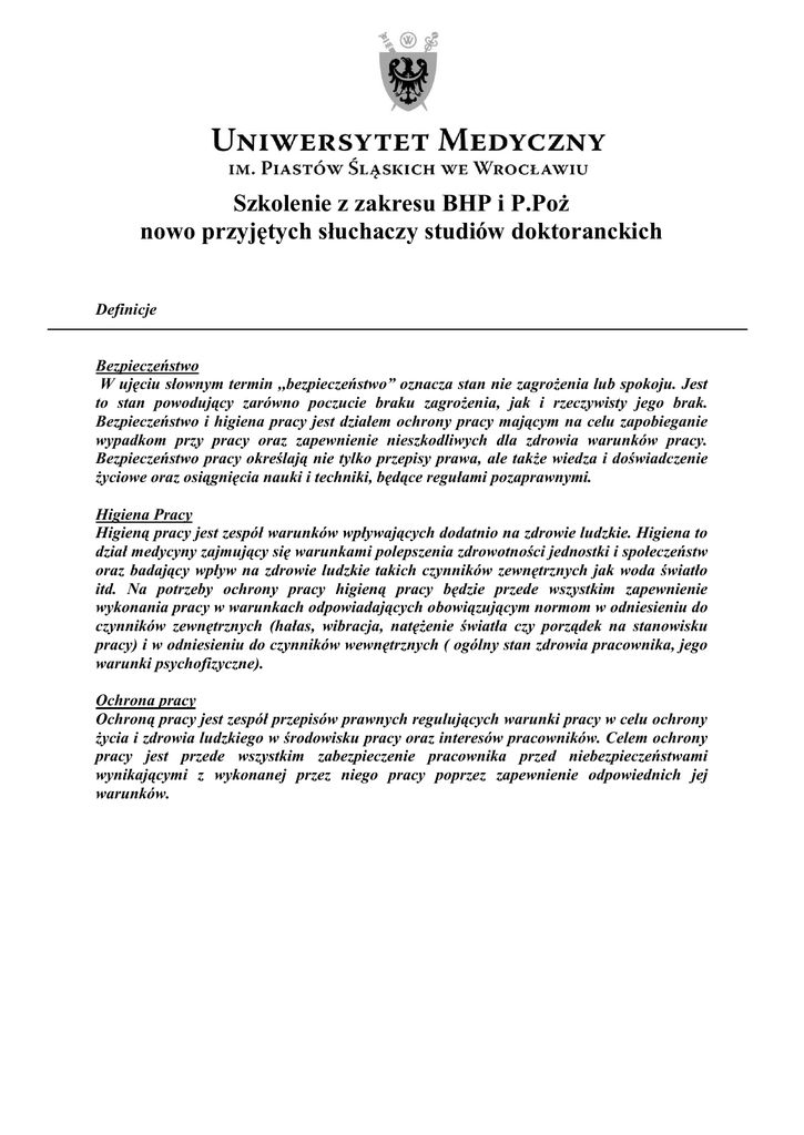 Szkolenie z zakresu BHP i P.Poż nowo przyjętych słuchaczy studiów doktoranckich Definicje Bezpieczeństwo W ujęciu słownym termin ,,bezpieczeństwo” oznacza stan nie zagrożenia lub spokoju. Jest to stan powodujący zarówno poczucie braku zagrożenia, jak i rzeczywisty jego brak. Bezpieczeństwo i higiena pracy jest działem ochrony pracy mającym na celu zapobieganie wypadkom przy pracy oraz zapewnienie nieszkodliwych dla zdrowia warunków pracy. Bezpieczeństwo pracy określają nie tylko przepisy prawa, ale także wiedza i doświadczenie życiowe oraz osiągnięcia nauki i techniki, będące regułami pozaprawnymi. Higiena Pracy Higieną pracy jest zespół warunków wpływających dodatnio na zdrowie ludzkie. Higiena to dział medycyny zajmujący się warunkami polepszenia zdrowotności jednostki i społeczeństw oraz badający wpływ na zdrowie ludzkie takich czynników zewnętrznych jak woda światło itd. Na potrzeby ochrony pracy higieną pracy będzie przede wszystkim zapewnienie wykonania pracy w warunkach odpowiadających obowiązującym normom w odniesieniu do czynników zewnętrznych (hałas, wibracja, natężenie światła czy porządek na stanowisku pracy) i w odniesieniu do czynników wewnętrznych ( ogólny stan zdrowia pracownika, jego warunki psychofizyczne). Ochrona pracy Ochroną pracy jest zespół przepisów prawnych regulujących warunki pracy w celu ochrony życia i zdrowia ludzkiego w środowisku pracy oraz interesów pracowników. Celem ochrony pracy jest przede wszystkim zabezpieczenie pracownika przed niebezpieczeństwami wynikającymi z wykonanej przez niego pracy poprzez zapewnienie odpowiednich jej warunków. REGULACJA PRAWNA- BHP W UCZELNI ROZPORZĄDZENIE MINISTRA NAUKI I SZKOLNICTWA WYŻSZEGO z dnia 5 lipca 2007 r. w sprawie bezpieczeństwa i higieny pracy w uczelniach (Dz. U. z dnia 18 lipca 2007 r.) § 1. Rektor jest obowiązany do organizowania szkoleń w zakresie bezpieczeństwa i higieny pracy dla osób objętych obowiązkowym szkoleniem zgodnie z rozporządzeniem Ministra Gospodarki i Pracy z dnia 27 lipca 2004 r. w sprawie szkolenia w dziedzinie bezpieczeństwa i higieny pracy (Dz. U. Nr 180, poz. 1860 oraz z 2005 r. Nr 116, poz. 972). § 2. 1. Rektor jest również obowiązany do organizowania szkolenia w zakresie bezpieczeństwa i higieny pracy, w wymiarze nie mniejszym niż 4 godziny, dla wszystkich studentów rozpoczynających naukę w uczelni. 2. Szkolenia powinny być realizowane w ramach zajęć dydaktycznych w formie wykładów, ćwiczeń lub seminariów. Udział w szkoleniu prowadzący potwierdza zaliczeniem. 3. Program szkolenia powinien uwzględniać wybrane zagadnienia prawne, informacje o zagrożeniach dla życia i zdrowia, ochronie przed nimi oraz postępowaniu w przypadku wystąpienia tych zagrożeń, w tym udzielania pierwszej pomocy. 4. Szczegółowy zakres i program szkolenia dla studentów oraz maksymalną wielkość grup szkoleniowych ustala rektor w zależności od specyfiki podstawowej jednostki organizacyjnej uczelni. 5. Szkolenie w zakresie bezpieczeństwa i higieny pracy powinny prowadzić osoby posiadające zasób wiedzy i doświadczenie zawodowe w dziedzinie odpowiadającej tematyce szkolenia. § 3. 1. Rektor jest obowiązany zaopatrzyć pracowników w niezbędne środki ochrony indywidualnej, odzież i obuwie robocze w zależności od rodzaju zajęć i specyfiki poszczególnych kierunków studiów. 2. Rektor jest obowiązany zapewnić studentom niezbędne środki ochrony indywidualnej w zależności od rodzaju zajęć i specyfiki poszczególnych kierunków studiów lub prowadzonych badań. § 4. 1. Budynki i pomieszczenia uczelni oraz przynależne do nich tereny i urządzenia, zgodnie z ich funkcją i przeznaczeniem, powinny spełniać wymagania, o których mowa w rozporządzeniu Ministra Infrastruktury z dnia 12 kwietnia 2002 r. w sprawie warunków technicznych, jakim powinny odpowiadać budynki i ich usytuowanie (Dz. U. Nr 75, poz. 690, z 2003 r. Nr 33, poz. 270 oraz z 2004 r. Nr 109, poz. 1156) oraz przepisach ustawy z dnia 26 czerwca 1974 r. - Kodeks pracy (Dz. U. z 1998 r. Nr 21, poz. 94, z późn. zm.3)) i wydanych na jej podstawie przepisach wykonawczych, zwanych dalej "przepisami BHP". 2. Obiekty i budynki powinny być wyposażone w odpowiedni podręczny sprzęt gaśniczy, w zależności od zagrożenia wybuchem, kategorii zagrożenia ludzi, wielkości obciążenia ogniowego, zgodnie z obowiązującymi przepisami dotyczącymi ochrony przeciwpożarowej. Sprzęt powinien być utrzymany w pełnej sprawności do użycia. 3. W obiektach i budynkach uczelni, na terenie których są organizowane stałe stanowiska pracy oraz zajęcia dydaktyczne, powinny znajdować się niezbędne pomieszczenia higienicznosanitarne odpowiednio urządzone oraz utrzymane w stanie pełnej sprawności i czystości. 4. Drogi ewakuacyjne i inne drogi oraz przejścia i dojścia dla pieszych na terenie uczelni powinny być utrzymane w należytym stanie, niestwarzającym zagrożeń dla użytkowników. 5. W pomieszczeniach uczelni powinny być spełnione warunki dotyczące oświetlenia, wentylacji, ogrzewania i powierzchni użytkowej, określone w rozporządzeniu Ministra Pracy i Polityki Socjalnej z dnia 26 września 1997 r. w sprawie ogólnych przepisów bezpieczeństwa i higieny pracy (Dz. U. z 2003 r. Nr 169, poz. 1650 oraz z 2007 r. Nr 49, poz. 330), a także z uwzględnieniem potrzeb użytkowych i funkcji poszczególnych pomieszczeń. 6. Stan wyposażenia pomieszczeń uczelni, a w szczególności: mebli, sprzętu, urządzeń i instalacji, nie może stanowić zagrożeń dla osób korzystających z tych pomieszczeń. 7. W budynkach i pomieszczeniach uczelni, w których są wykonywane badania pilotażowe, eksperymenty chemiczne, fizyczne lub inne mogące stanowić zagrożenie dla życia i zdrowia przebywających w nich osób, obowiązuje zachowanie szczególnych środków ostrożności. W pomieszczeniach, w których są wykonywane bada