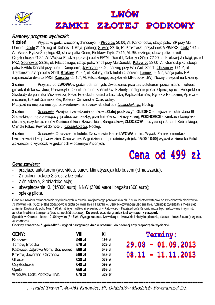 Ramowy program wycieczki: 1 dzień Wyjazd w godz. wieczornych/nocnych. (Wrocław 20:00, Al. Karkonoska, stacja paliw BP przy Mc Donald; Opole 21:15, róg ul. Dubois i 1 Maja, parking; Gliwice 22:15, Pl. Krakowski, przystanek MPK/PKS; Łódź 19:15, Al. Marsz. Rydza-Śmigłego 43, stacja paliw Orlen; Piotrków Tryb. 20:15, Al. Sikorskiego, stacja paliw Lukoil; Częstochowa 21:30, Al. Wojska Polskiego, stacja paliw BP/Mc Donald; Dąbrowa Górn. 22:00, ul. Królowej Jadwigi, przed PKZ; Sosnowiec 22:25, ul. Piłsudskiego, stacja paliw Shell przy Mc Donald; Katowice 23:00, Al. Górnośląska, stacja paliw BP/Mc Donald przy hotelu Campanile; Jaworzno 23:40, parking przy Hali Wid.-Sport.; Chrzanów 00:10*, ul. Trzebińska, stacja paliw Shell; Kraków 01:00*, ul. Kałuży, obok hotelu Cracovia; Tarnów 02:15*, stacja paliw BP naprzeciwko dworca PKS; Rzeszów 03:15*, Al. Piłsudskiego, przystanek MPK obok UW). Nocny przejazd na Ukrainę. 2 dzień Przyjazd do LWOWA w godzinach rannych. Zwiedzanie: przejazd autokarem przez miasto - katedra grekokatolicka św. Jura, Uniwersytet, Ossolineum, d. Kościół św. Elżbiety; następnie pieszo Opera, spacer Prospektem Swobody do pomnika Mickiewicza, Pałac Potockich, Katedra Łacińska, Kaplica Boimów, Rynek z Ratuszem, Apteka – muzeum, kościół Dominikanów, Katedra Ormiańska. Czas wolny. Przejazd na miejsce noclegu. Zakwaterowanie (Lwów lub okolice). Obiadokolacja. Nocleg. 3 dzień Śniadanie. Przejazd i zwiedzanie zamków „Złotej podkowy”: OLESKO - miejsce narodzin Jana III Sobieskiego, bogata ekspozycja obrazów, rzeźby, przedmiotów sztuki użytkowej; PODHORCE - zamkowy kompleks obronny, rezydencja rodów Koniecpolskich, Rzewuskich, Sanguszków; ZŁOCZÓW – rezydencja Jana III Sobieskiego, Chiński Pałac. Powrót do hotelu. Obiadokolacja. Nocleg. 4 dzień Śniadanie. Opuszczenie hotelu. Dalsze zwiedzanie LWOWA, m.in.: Wysoki Zamek, cmentarz Łyczakowski i Orląt Lwowskich. Czas wolny. W godzinach popołudniowych (ok. 15:00-16:00) wyjazd w kierunku Polski. Zakończenie wycieczki w godzinach wieczornych/nocnych. Cena zawiera: - przejazd autokarem (wc, video, barek, klimatyzacja) lub busem (klimatyzacja); - 2 noclegi, pokoje 2,3-os. z łazienką; - 2 śniadania, 2 obiadokolacje; - ubezpieczenie KL (15000 euro), NNW (3000 euro) i bagażu (300 euro); - opiekę pilota. Cena nie zawiera świadczeń nie wymienionych w ofercie, miejscowego przewodnika ok. 7 euro, biletów wstępów do zwiedzanych obiektów ok. 70 hrywien (ok. 35 zł) płatne dodatkowo u pilota po wymianie na Ukrainie. Ceny biletów mogą ulec zmianie. Kolejność zwiedzania może ulec zmianie. Dopłata do pok. 1-os. 120 zł. Istnieje możliwość przesiadki w Katowicach. Przejazd do/z Katowic może być realizowany innym niż autokar środkiem transportu (bus, samochód osobowy). Do przekroczenia granicy jest wymagany paszport. Spektakl w Operze – koszt 10-30 hrywien (7-15 zł). Występ kabaretu lwowskiego – lwowskie i nie tylko piosenki, skecze - koszt 8 euro (przy min. 30 osobach). Godziny oznaczone * „gwiazdką” – wyjazd następnego dnia w stosunku do podanej daty rozpoczęcia wycieczki. CENY: VIII XI Rzeszów Tarnów, Brzesko Katowice, Dąbrowa Górn., Sosnowiec Kraków, Jaworzno, Chrzanów Gliwice Częstochowa Opole Wrocław, Łódź, Piotrków Tryb. 549 zł 579 zł 599 zł 599 zł 629 zł 649 zł 659 zł 679 zł 499 zł 529 zł 549 zł 549 zł 579 zł 599 zł 609 zł 629 zł ----------------------------------------------------------------------------------------------------------------„Vivaldi Travel”, 40-061 Katowice, Pl. Oddziałów Młodzieży Powstańczej 2/3, tel. kom. 784 110 540, www.vivalditravel.pl