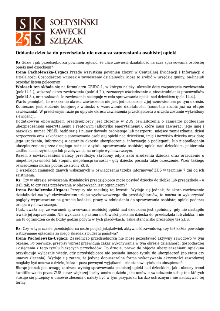 Oddanie dziecka do przedszkola nie oznacza zaprzestania osobistej opieki Rz:Gdzie i jak przedsiębiorca powinien zgłosić, że chce zawiesić działalność na czas sprawowania osobistej opieki nad dzieckiem? Irena Pacholewska-Urgacz:Przede wszystkim powinien złożyć w Centralnej Ewidencji i Informacji o Działalności Gospodarczej wniosek o zawieszenie działalności. Może to zrobić w urzędzie gminy, on-linelub przesłać listem poleconym. Wniosek ten składa się na formularzu CEIDG-1, w którym należy: określić datę rozpoczęcia zawieszenia (pole14.1.), wskazać okres zawieszenia (pole14.2.), zaznaczyć oświadczenie o niezatrudnianiu pracowników (pole14.3.), oraz wskazać, że zawieszenie następuje w celu sprawowania opieki nad dzieckiem (pole 14.4.). Warto pamiętać, że wskazanie okresu zawieszenia nie jest jednoznaczne z jej wznowieniem po tym okresie. Konieczne jest złożenie kolejnego wniosku o wznowienie działalności (comożna zrobić już na etapie zawieszania). W przeciwnym razie po upływie okresu zawieszenia przedsiębiorca z urzędu zostanie wykreślony z ewidencji. Dodatkowym obowiązkiem przedsiębiorcy jest złożenie w ZUS oświadczenia o zamiarze podlegania ubezpieczeniom emerytalnemu i rentowym (albotylko emerytalnemu), które musi zawierać: jego imię i nazwisko, numer PESEL bądź serię i numer dowodu osobistego lub paszportu, miejsce zamieszkania, dzień rozpoczęcia oraz zakończenia sprawowania osobistej opieki nad dzieckiem, imię i nazwisko dziecka oraz datę jego urodzenia, informację o ostatnim okresie ubezpieczenia, informację o podleganiu lub niepodleganiu ubezpieczeniom przez drugiego rodzica z tytułu sprawowania osobistej opieki nad dzieckiem, pobierania zasiłku macierzyńskiego lub przebywania na urlopie wychowawczym. Razem z oświadczeniem należy przedłożyć skrócony odpis aktu urodzenia dziecka oraz orzeczenie o niepełnosprawności lub stopniu niepełnosprawności – gdy dziecko posiada takie orzeczenie. Wzór takiego oświadczenia można pobrać ze strony ZUS. O wszelkich zmianach danych wskazanych w oświadczeniu trzeba informować ZUS w terminie 7 dni od ich zaistnienia. Rz: Czy w okresie zawieszenia działalności przedsiębiorca może posyłać dziecko do żłobka lub przedszkola – a jeśli tak, to czy czas przebywania w placówkach jest ograniczony? Irena Pacholewska-Urgacz: Przepisy nie regulują tej kwestii. Wydaje się jednak, że skoro zawieszenie działalności ma być ekwiwalentem urlopu wychowawczego dla przedsiębiorców, to można tu wykorzystać poglądy wypracowane na gruncie kodeksu pracy w odniesieniu do sprawowania osobistej opieki podczas urlopu wychowawczego. I tak, uważa się, że warunek sprawowania osobistej opieki nad dzieckiem jest spełniony, gdy nie nastąpiło trwałe jej zaprzestanie. Nie wyklucza się zatem możliwości posłania dziecka do przedszkola lub żłobka, i nie ma tu ograniczeń co do liczby godzin pobytu w tych placówkach. Takie stanowisko prezentuje też ZUS. Rz: Czy w tym czasie przedsiębiorca może podjąć jakąkolwiek aktywność zawodową, czy też każda powoduje wstrzymanie opłacania za niego składek z budżetu państwa? Irena Pacholewska-Urgacz: Zasadniczo przedsiębiorca nie może pozostawać aktywny zawodowo w tym okresie. Po pierwsze, przepisy wprost przewidują zakaz wykonywania w tym okresie działalności gospodarczej i osiągania z tego tytułu bieżących przychodów. Po drugie, prawo do objęcia ubezpieczeniami opiekuna przysługuje wyłącznie wtedy, gdy przedsiębiorca nie posiada innego tytułu do ubezpieczeń (np.etatu czy umowy zlecenia). Wydaje się zatem, że jedyną dopuszczalną formą wykonywania aktywności zawodowej mogłaby być umowa o dzieło, która – poza pewnymi wyjątkami – nie stanowi tytułu do ubezpieczeń. Biorąc jednak pod uwagę zarówno wymóg sprawowania osobistej opieki nad dzieckiem, jak i obecny trend kwalifikowania przez ZUS coraz większej liczby umów o dzieło jako umów o świadczenie usług (do których stosuje się przepisy o umowie zlecenia), należy być w tym przypadku bardzo ostrożnym i nie nadużywać tej formy. Źródło: http://archiwum.rp.pl/artykul/1331597-Oddanie-dziecka-do-przedszkola-nie-oznacza-zaprzestania-osobistej-opie ki.html