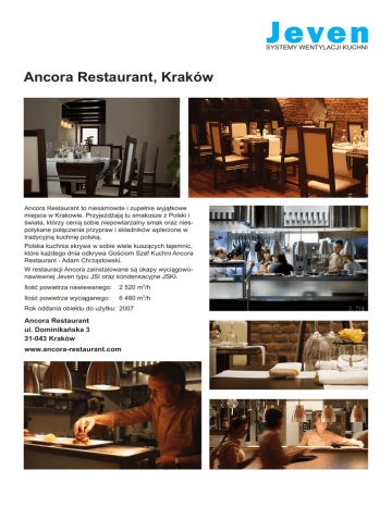 SYSTEMY WENTYLACJI KUCHNI Ancora Restaurant, Kraków Ancora Restaurant to niesamowite i zupełnie wyjątkowe miejsce w Krakowie. Przyjeżdżają tu smakosze z Polski i świata, którzy cenią sobie niepowtarzalny smak oraz niespotykane połączenia przypraw i składników wplecione w tradycyjną kuchnię polską. Polska kuchnia skrywa w sobie wiele kuszących tajemnic, które każdego dnia odkrywa Gościom Szef Kuchni Ancora Restaurant - Adam Chrząstowski. W restauracji Ancora zainstalowane są okapy wyciągowonawiewnej Jeven typu JSI oraz kondensacyjne JSKI. Ilość powietrza nawiewanego: 2 520 m3/h Ilość powietrza wyciąganego: 6 480 m3/h Rok oddania obiektu do użytku: 2007 Ancora Restaurant ul. Dominikańska 3 31-043 Kraków www.ancora-restaurant.com
