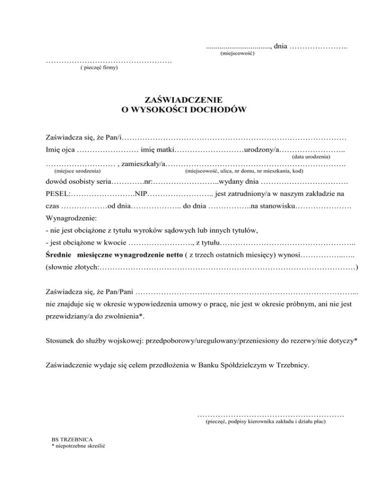 ................................., dnia ………………….. (miejscowość) …………………………………………. ( pieczęć firmy) ZAŚWIADCZENIE O WYSOKOŚCI DOCHODÓW Zaświadcza się, Ŝe Pan/i…………………………………………………………………………… Imię ojca …………………… imię matki………………………urodzony/a…………………….. (data urodzenia) ……………………… , zamieszkały/a……………………………………………………………. (miejsce urodzenia) (miejscowość, ulica, nr domu, nr mieszkania, kod) dowód osobisty seria………….nr:……………………..wydany dnia ……………………………. PESEL:…………………….NIP…………………….. jest zatrudniony/a w naszym zakładzie na czas ………………od dnia……………….. do dnia ……………..na stanowisku…………………. Wynagrodzenie: - nie jest obciąŜone z tytułu wyroków sądowych lub innych tytułów, - jest obciąŜone w kwocie ……………………., z tytułu…………………………………………….. Średnie miesięczne wynagrodzenie netto ( z trzech ostatnich miesięcy) wynosi……………..….. (słownie złotych:………………………………………………………………………………………) Zaświadcza się, Ŝe Pan/Pani …………………………………………………………………………... nie znajduje się w okresie wypowiedzenia umowy o pracę, nie jest w okresie próbnym, ani nie jest przewidziany/a do zwolnienia*. Stosunek do słuŜby wojskowej: przedpoborowy/uregulowany/przeniesiony do rezerwy/nie dotyczy* Zaświadczenie wydaje się celem przedłoŜenia w Banku Spółdzielczym w Trzebnicy. ………………………………………………… (pieczęć, podpisy kierownika zakładu i działu płac) BS TRZEBNICA * niepotrzebne skreślić
