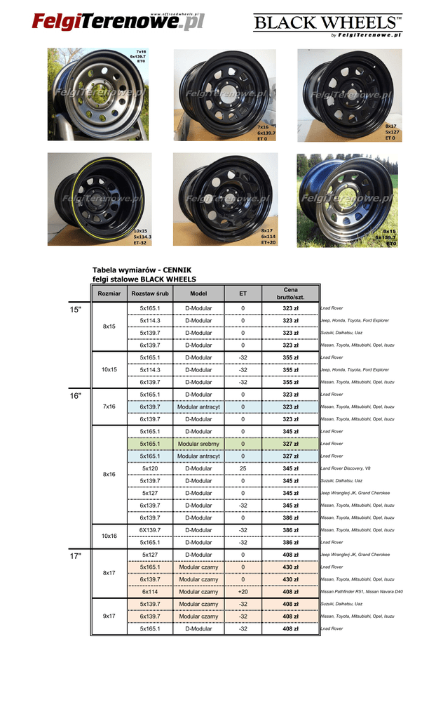Tabela wymiarów - CENNIK felgi stalowe BLACK WHEELS Rozmiar 15" Rozstaw śrub Model ET Cena brutto/szt. 5x165.1 D-Modular 0 323 zł Lnad Rover 5x114.3 D-Modular 0 323 zł Jeep, Honda, Toyota, Ford Explorer 5x139.7 D-Modular 0 323 zł Suzuki, Daihatsu, Uaz 6x139.7 D-Modular 0 323 zł Nissan, Toyota, Mitsubishi, Opel, Isuzu 5x165.1 D-Modular -32 355 zł Lnad Rover 5x114.3 D-Modular -32 355 zł Jeep, Honda, Toyota, Ford Explorer 6x139.7 D-Modular -32 355 zł Nissan, Toyota, Mitsubishi, Opel, Isuzu 5x165.1 D-Modular 0 323 zł Lnad Rover 6x139.7 Modular antracyt 0 323 zł Nissan, Toyota, Mitsubishi, Opel, Isuzu 6x139.7 D-Modular 0 323 zł Nissan, Toyota, Mitsubishi, Opel, Isuzu 5x165.1 D-Modular 0 345 zł Lnad Rover 5x165.1 Modular srebrny 0 327 zł Lnad Rover 5x165.1 Modular antracyt 0 327 zł Lnad Rover 5x120 D-Modular 25 345 zł Land Rover Discovery, V8 5x139.7 D-Modular 0 345 zł Suzuki, Daihatsu, Uaz 5x127 D-Modular 0 345 zł Jeep Wranglerj JK, Grand Cherokee 6x139.7 D-Modular -32 345 zł Nissan, Toyota, Mitsubishi, Opel, Isuzu 6x139.7 D-Modular 0 386 zł Nissan, Toyota, Mitsubishi, Opel, Isuzu 6X139.7 D-Modular -32 386 zł Nissan, Toyota, Mitsubishi, Opel, Isuzu 5x165.1 D-Modular -32 386 zł Lnad Rover 5x127 D-Modular 0 408 zł Jeep Wranglerj JK, Grand Cherokee 5x165.1 Modular czarny 0 430 zł Lnad Rover 6x139.7 Modular czarny 0 430 zł Nissan, Toyota, Mitsubishi, Opel, Isuzu 6x114 Modular czarny +20 408 zł Nissan Pathfinder R51, Nissan Navara D40 5x139.7 Modular czarny -32 408 zł Suzuki, Daihatsu, Uaz 6x139.7 Modular czarny -32 408 zł Nissan, Toyota, Mitsubishi, Opel, Isuzu 5x165.1 D-Modular -32 408 zł Lnad Rover 8x15 10x15 16" 7x16 8x16 10x16 17" 8x17 9x17