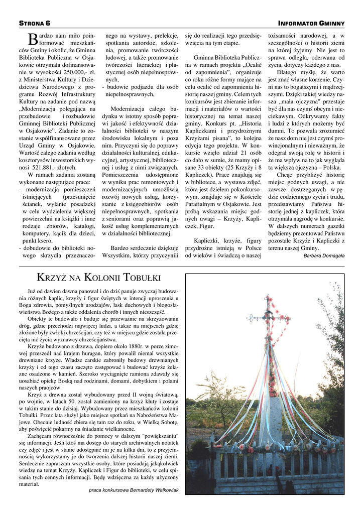 STRONA 6 B INFORMATOR GMINNY ardzo nam miło poinformować mieszkańców Gminy i okolic, że Gminna Biblioteka Publiczna w Osjakowie otrzymała dofinansowanie w wysokości 250.000,- zł. z Ministerstwa Kultury i Dziedzictwa Narodowego z programu Rozwój Infrastruktury Kultury na zadanie pod nazwą „Modernizacja polegająca na przebudowie i rozbudowie Gminnej Biblioteki Publicznej w Osjakowie”. Zadanie to zostanie współfinansowane przez Urząd Gminy w Osjakowie. Wartość całego zadania według kosztorysów inwestorskich wynosi 521.881,- złotych. W ramach zadania zostaną wykonane następujące prace: - modernizacja pomieszczeń istniejących (przesunięcie ścianek, wylanie posadzek) w celu wydzielenia większej powierzchni na książki i inne rodzaje zbiorów, katalogi, komputery, kącik dla dzieci, punkt ksero, - dobudowie do biblioteki nowego skrzydła przeznaczo- nego na wystawy, prelekcje, spotkania autorskie, szkolenia, promowanie twórczości ludowej, a także promowanie twórczości literackiej i plastycznej osób niepełnosprawnych, - budowie podjazdu dla osób niepełnosprawnych, Modernizacja całego budynku w istotny sposób poprawi jakość i efektywność działalności biblioteki w naszym środowisku lokalnym i poza nim. Przyczyni się do poprawy działalności kulturalnej, edukacyjnej, artystycznej, bibliotecznej i usług z nimi związanych. Pomieszczenia udostępnione w wyniku prac remontowych i modernizacyjnych umożliwią rozwój nowych usług, korzystanie z księgozbiorów osób niepełnosprawnych, spotkania z seniorami oraz poprawią jakość usług komplementarnych w działalności bibliotecznej. Bardzo serdecznie dziękuję Wszystkim, którzy przyczynili KRZYŻ NA KOLONII TOBUŁKI Już od dawien dawna panował i do dziś panuje zwyczaj budowania różnych kaplic, krzyży i figur świętych w intencji uproszenia u Boga zdrowia, pomyślnych urodzajów, łask duchowych i błogosławieństwa Bożego a także oddalenia chorób i innych nieszczęść. Obiekty te budowało i buduje się przeważnie na skrzyżowaniu dróg, gdzie przechodzi najwięcej ludzi, a także na miejscach gdzie złożone były zwłoki chrześcijan, czy też w miejscu gdzie została przecięta nić życia wyznawcy chrześcijaństwa. Krzyże budowano z drzewa, dopiero około 1880r. w porze zimowej przeszedł nad krajem huragan, który powalił niemal wszystkie drewniane krzyże. Władze carskie zabroniły budowy drewnianych krzyży i od tego czasu zaczęto zastępować i budować krzyże żelazne osadzone w kamień. Szeroko wyciągnięte ramiona zdawały się uosabiać opiekę Boską nad rodzinami, domami, dobytkiem i polami naszych praojców. Krzyż z drewna został wybudowany przed II wojną światową, po wojnie, w latach 50. został zamieniony na krzyż kłuty i zostaje w takim stanie do dzisiaj. Wybudowany przez mieszkańców kolonii Tobułki. Przez lata służył jako miejsce spotkań na Nabożeństwa Majowe. Obecnie ludność zbiera się tam raz do roku, w Wielką Sobotę, aby poświęcić pokarmy na śniadanie wielkanocne. Zachęcam równocześnie do pomocy w dalszym "powiększaniu" się informacji. Jeśli ktoś ma dostęp do starych archiwalnych notatek czy zdjęć i jest w stanie udostępnić mi je na kilka dni, to z przyjemnością wykorzystamy je do tworzenia dalszej historii naszej ziemi. Serdecznie zapraszam wszystkie osoby, które posiadają jakąkolwiek wiedzę na temat Krzyży, Kapliczek i Figur do biblioteki, w celu spisania tych cennych informacji. Będę wdzięczna za każdy użyczony materiał. praca konkursowa Bernardety Walkowiak się do realizacji tego przedsięwzięcia na tym etapie. Gminna Biblioteka Publiczna w ramach projektu „Ocalić od zapomnienia”, organizuje co roku różne formy mające na celu ocalić od zapomnienia historię naszej gminy. Celem tych konkursów jest zbieranie informacji i materiałów o wartości historycznej na temat naszej gminy. Konkurs pt. „Historia Kapliczkami i przydrożnymi Krzyżami pisana”, to kolejna edycja tego projektu. W konkursie wzięło udział 21 osób co dało w sumie, że mamy opisane 33 obiekty (25 Krzyży i 8 Kapliczek). Prace znajdują się w bibliotece, a wystawa zdjęć, która jest dziełem pokonkursowym, znajduje się w Kościele Parafialnym w Osjakowie. Jest próbą wskazania miejsc godnych uwagi – Krzyży, Kapliczek, Figur. Kapliczki, krzyże, figury przydrożne istnieją w Polsce od wieków i świadczą o naszej tożsamości narodowej, a w szczególności o historii ziemi na której żyjemy. Nie jest to sprawa odległa, oderwana od życia, dotyczy każdego z nas. Dlatego myślę, że warto jest znać własne korzenie. Czyni nas to bogatszymi i mądrzejszymi. Dzięki takiej wiedzy nasza „mała ojczyzna" przestaje być dla nas czymś obcym i nieciekawym. Odkrywamy fakty i ludzi z których możemy być dumni. To pozwala zrozumieć że nasz dom nie jest czymś prowincjonalnym i nieważnym, że odegrał swoją rolę w historii i że ma wpływ na to jak wygląda ta większa ojczyzna – Polska. Chcąc przybliżyć historię miejsc godnych uwagi, a nie zawsze dostrzeganych w pędzie codziennego życia i trudu, przedstawiamy Państwu historię jednej z kapliczek, która otrzymała nagrodę w konkursie. W dalszych numerach gazetki będziemy prezentować Państwu pozostałe Krzyże i Kapliczki z terenu naszej Gminy. Barbara Domagała ROK 2, NUMER 1 20 MAJ 2009r. INWESTYCJE W GMINIE OSJAKÓW B udowa sali gimnastycznej z zapleczem przy Publicznym Gimnazjum w Osjakowie to jedno z priorytetowych zadań inwestycyjnych gminy. Jak wiadomo, budowa została rozpoczęta w 2008 r. Obecnie prace są zintensyfikowane, realizowane zgodnie z założonym harmonogramem prac. Zakończenie prac przewiduje się w lipcu br., a przekazanie do użytkowania we wrześniu br. Obecnie inwestycja ta jest finansowana z dwóch źródeł, tj. środki własne gminy i środki Funduszu Rozwoju Kultury Fizycznej. Projekt przebudowy parku przy ul. R