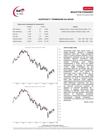 BIULETYN PORANNY wtorek, 22 września 2015 KONTRAKTY TERMINOWE NA WIG20 Wyniki sesji: poniedziałek, 22 września 2015 Wartość System: zmiana Kurs otwarcia 2 152 -44 -2,00% Aktualna pozycja – długa, sygnał otwarcia krótkiej - 2151 Kurs zamknięcia 2 165 10 0,46% Ostatnia zmiana sygnału z krótkiej na długą - 2165 Kurs min. 2 148 -5 -0,23% Kurs max. 2 168 -33 -1,50% Wolumen obrotu 11 307 -26 483 -70,08% Najbliższe poziomy oporu: 2202 2235 2258 2310 Otwarte pozycje 49 223 -34 415 -41,15% Najbliższe poziomy wsparcia: 2100 2080 2005 1900 Znowu wieje nudą FW20 (2,152.00, 2,168.00, 2,148.00, 2,165.00, +13.0000) 2550 2500 2450 2400 2350 2300 2250 2200 2150 2100 2050 2000 April May June July August September WIG20 (2,166.54, 2,180.91, 2,162.07, 2,178.27, +10.0801) October 2600 2550 2500 2450 2400 2350 Wczorajsza sesja była raczej nudna, co mogło wynikać zarówno z ubogiego kalendarza makro jak i braku poważnych zmian w wyniku greckich wyborów. Dziś w kalendarium ponownie nie ma zbyt wiele odczytów. Naszych inwestorów mogą interesować dane na temat koniunktury w polskim przemyśle, które zostaną opublikowane o 14:00. Poza tym ciężko oczekiwać jakiś impulsów do większych ruchów. Ciągle znajdujemy się pod poziomem 2200 pkt. na WIG20, który jest teraz najbliższym oporem i jego ewentualne przełamanie może dać sygnał do kontynuacji ruchu w górę. Wydaje się, że ten poziom jest dzisiaj w zasięgu inwestorów nawet biorąc pod uwagę niską zmienność na GPW w ostatnich dniach, która była zaburzona przez piątkowe wygaśnięcie wrześniowej serii kontraktów. Z kolei najbliższym wsparciem jest teraz minimum z piątku, które z racji przywołanej już mizernej zmienności wyróżnia się zarówno na wykresie kontraktów jak i WIG20. O poranku nieznacznie tracą kontrakty na S&P500, nieco lepiej radzi sobie DAX, który jest wyraźnie nad kreską. Powinno to skutkować neutralnym otwarciem, a dalszy bieg wydarzeń powinny rozstrzygnąć nastroje inwestorów i zachowanie się indeksów przy kluczowych poziomach Marek Jurzec 2300 2250 2200 2150 2100 2050 2000 April May June July August September October Wydział Analiz i Informacji Dom Maklerski BDM S.A. ul. 3-go Maja 23, 40-096 Katowice, Tel.: 032 208 14 12, [email protected] Opracowanie ma charakter czysto informacyjny i zostało opracowany na podstawie informacji uznanych przez autorów za wiarygodne . Zawarte w nim komentarze są subiektywnymi poglądami autorów. Opracowanie i zawarte w nim komentarze nie są podstawą żadnej rekomendacji kupna bądź sprzedaży w rozumieniu obowiązującego prawa i nie powinny być tak interpretowane. Publikowanie w prasie lub w Internecie całości lub części opracowania wymaga zgody sporządzających raport. BIULETYN PORANNY wtorek, 22 września 2015 RYNEK AKCJI Wyniki sesji: poniedziałek, 21 września 2015 52 tygodnie Indeks Kurs otwarcia Kurs zamknięcia Zmiana [%] Kurs min. Kurs max. Zakres wahań Obrót [mln PLN] Kurs max. Kurs min. WIG20 2 558,6 2 014,7 2 166,54 2 178,27 0,46% 2 162,07 2 180,91 18,8 483,6 WIG30 2 782,4 2 232,7 2 393,90 2 403,23 0,46% 2 385,77 2 403,29 17,5 508,1 mWIG40 3 961,0 3 388,6 3 659,50 3 671,15 0,36% 13 218,93 13 300,50 81,6 78,6 sWIG80 14 107,4 11 847,7 13 295,90 13 269,77 -0,05% 3 652,29 3 671,15 18,9 25,3 WIG-PL 58 998,6 49 970,2 52 572,95 52 744,53 0,39% 52 572,95 52 744,53 171,6 576,7 WIG 57 460,4 48 048,1 51 345,07 51 499,88 0,38% 51 210,01 51 499,93 289,9 583,9 Spółka zmiana % względem WIG30 zmiana % Cena [PLN] Mkt Cap [mln PLN] dzienna 1M 3M 6M dzienna 1M 3M 6M 6 245 2,0% 0,6% -4,5% 3,3% 1,5% 1,1% 2,2% 11,3% ALIOR BANK 85,92 ASSECOPOL 55,00 4 565 -1,6% 2,3% -9,7% -4,0% -2,0% 2,8% -2,9% 4,0% BANK HANDLOWY 83,39 10 896 0,5% -3,9% -16,2% -25,7% 0,0% -3,4% -9,4% -17,7% BOGDANKA 63,68 2 166 -1,2% 19,9% 14,2% -23,2% -1,6% 20,3% 21,0% -15,2% BORYSZEW 5,35 1 284 0,0% -9,8% -10,8% -14,0% -0,5% -9,3% -4,1% -6,0% BZ WBK 307,80 30 544 1,9% 7,2% -8,4% -10,3% 1,5% 7,6% -1,6% -2,3% CCC 170,00 6 528 -0,4% -10,1% -5,5% -7,5% -0,9% -9,6% 1,3% 0,5% CYFROWY POLSAT 23,07 14 754 0,9% 3,1% -6,2% -6,1% 0,4% 3,5% 0,6% 1,9% ENEA 13,67 6 035 -0,2% -4,1% -15,5% -17,7% -0,7% -3,6% -8,7% -9,7% EUROCASH 41,88 5 808 -1,5% -1,9% 9,3% 26,9% -1,9% -1,4% 16,1% 34,9% GRUPA AZOTY 91,90 9 116 2,1% 9,7% 8,6% 19,2% 1,6% 10,1% 15,4% 27,2% GTC 6,21 2 858 -1,3% 2,1% 0,3% 21,1% -1,7% 2,5% 7,1% 29,0% ING BSK 122,15 15 892 0,7% -6,0% -9,0% -10,8% 0,2% -5,6% -2,3% -2,8% JSW 13,37 1 570 -3,2% 7,0% 16,4% -30,4% -3,6% 7,4% 23,1% -22,4% KERNEL 44,50 3 546 0,9% 4,2% 14,8% 14,4% 0,4% 4,7% 21,6% 22,4% KGHM 85,65 17 130 -1,3% 2,2% -22,3% -28,8% -1,7% 2,7% -15,6% -20,8% 25,2% LOTOS 30,47 5 633 -0,7% -2,2% 2,9% 17,2% -1,1% -1,8% 9,7% 7 800,00 14 283 0,9% 5,5% 13,1% 9,9% 0,5% 6,0% 19,9% 17,9% 374,35 15 808 1,4% 8,7% -14,8% -18,6% 1,0% 9,1% -8,0% -10,6% NETIA 5,64 1 964 0,9% 2,5% 2,5% -5,2% 0,4% 3,0% 9,3% 2,8% ORANGE POLSKA 7,35 9 646 1,4% -4,5% -16,8% -23,1% 0,9% -4,1% -10,0% -15,1% PEKAO 158,90 41 706 0,6% -0,4% -9,2% -16,1% 0,1% 0,1% -2,4% -8,2% PGE 15,29 28 589 0,5% -3,1% -18,4% -25,6% 0,1% -2,7% -11,6% -17,6% PGNIG 6,77 39 943 0,4% 1,0% -2,6% 27,7% 0,0% 1,5% 4,2% 35,7% PKNORLEN 72,05 30 816 1,5% -14,2% -0,7% 26,4% 1,0% -13,8% 6,1% 34,4% PKOBP 29,96 37 450 -0,7% 4,7% -5,8% -16,2% -1,1% 5,1% 0,9% -8,2% PKP CARGO 68,90 3 086 1,0% -5,0% -19,1% -20,5% 0,5% -4,5% -12,4% -12,5% PZU -1,3% LPP mBANK 438,20 37 840 0,5% 5,2% 1,2% -9,3% 0,0% 5,7% 7,9% SYNTHOS 3,86 5 108 0,8% -4,5% -17,5% -11,5% 0,3% -4,0% -10,7% -3,5% TAURON 3,51 6 151 2,3% 0,3% -20,2% -25,9% 1,9% 0,7% -13,5% -18,0% Wydział Analiz i Informacji Dom Maklerski BDM S.A. ul. 3-go Maja 23, 40-096 Katowice, Tel.: 032 208 14 12, [email protected] Opracowanie ma charakter czysto informacyjny i zostało opracowany na podstawie informacji uznanych przez autorów za wiarygodne . Zawarte w nim komentarze są subiektywnymi poglądami autorów. Opracowanie i zawarte w nim komentarze nie są podstawą żadnej rekomendacji kupna bądź sprze