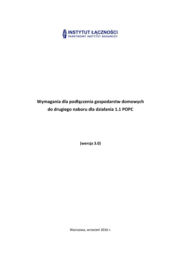 Wymagania dla podłączenia gospodarstw domowych do drugiego naboru dla działania 1.1 POPC (wersja 3.0) Warszawa, wrzesień 2016 r. SPIS TREŚCI 1 SPECYFIKACJA TECHNICZNA .................................................................................................. 7 1.1 Wymagania minimalne na przepustowość w Sieci POPC ....................................................................... 7 1.1.1 Wymagania minimalne dla usług dostępu do Internetu w Sieciach POPC .......................................... 7 1.1.2 Wymagania na przepustowość na segmencie od CPE do węzła dostępowego .................................. 7 1.1.3 Wymagania na gwarancję przepustowości na segmencie od węzła dostępowego do punktu styku z Internetem IX ...................................................................................................................................................... 8 1.1.4 Wymagania na gwarancję przepustowości na punkcie styku z dostawcą usługi IP Transit ................ 8 1.2 Wymagania jakościowe dla usług w Sieci POPC .................................................................................... 8 1.3 Wymagania dla Sieci POPC.................................................................................................................... 9 1.3.1 Wymagania w zakresie topologii dla Sieci POPC ................................................................................. 9 1.3.2 Standardy, technologie i rozwiązania wykluczone z zastosowania w Sieciach POPC ......................... 9 1.3.3 Wymagania dla rozwiązań hybrydowych w Sieci POPC .................................................................... 10 1.4 Wymagania dla sposobu wykonania i nadmiarowości Infrastruktury telekomunikacyjnej Sieci POPC 10 1.4.1 Wymagania dla doziemnych elementów Segmentu abonenckiego ................................................. 10 1.4.2 Wymagania dla Kanalizacji Kablowej na Segmentach rozdzielczych ................................................ 11 1.4.3 Wymagania dla Kanalizacji Kablowej na Segmentach magistralnych ............................................... 11 1.4.4 Wymagania dla Kanalizacji Kablowej na odcinkach współdzielonych przez Segmenty magistralne i rozdzielcze ......................................................................................................................................................... 11 1.4.5 Wykorzystanie istniejącej Infrastruktury pasywnej .......................................................................... 11 1.4.6 Wymagania dla Punktów Elastyczności w Sieci POPC ....................................................................... 12 1.4.7 Wymagania dla zasilania w energię elektryczną ............................................................................... 12 1.4.8 Wymaganie dla zastosowania włókien jednomodowych.................................................................. 12 1.4.9 Wymaganie dla zastosowania rozwiązań jednowłóknowych............................................................ 12 1.4.10 Wymagania dla połączeń światłowodów .......................................................................................... 13 1.4.11 Wymagania na nadmiarowość okablowania światłowodowego ...................................................... 13 1.5 Wymagania dla Kolokacji w lokalizacjach radiowych węzłów dostępowych ....................................... 13 1.6 Wymagania dla Urządzeń telekomunikacyjnych aktywnych ............................................................... 13 2 ZASADY DOSTĘPU HURTOWEGO ........................................................................................ 14 2.1 Obowiązki OSD w zakresie usług hurtowych ....................................................................................... 14 2.2 Obowiązki OSD w zakresie ustalania treści Oferty z Prezesem UKE ..................................................... 14 Wstęp Dokument (dalej „Wymagania”) określa specyfikację techniczną oraz zobowiązania w zakresie zapewnienia dostępu hurtowego do sieci szerokopasmowej wybudowanej, rozbudowanej lub przebudowanej z wykorzystaniem środków publicznych przyznanych w ramach II-go konkursu działania 1.1 POPC (dalej „Sieci POPC”). Wymagania obejmują: Specyfikację techniczną (pkt 1 Wymagań) – warunki techniczne, jakim powinny odpowiadać Sieci POPC w celu zapewnienia otwartego i efektywnego dostępu hurtowego, w tym parametry jakościowe oraz nadmiarowość elementów infrastruktury pasywnej. zobowiązania w zakresie dostępu hurtowego (pkt 2 Wymagań) – zobowiązania jakie przyjmuje na siebie beneficjent w celu zapewnienia możliwie najszerszego dostępu hurtowego do Sieci POPC. Wymagania stanowią integralną część warunków konkursowych Programu Operacyjnego Polska Cyfrowa na lata 2014-2020 zaakceptowanego decyzją Komisji Europejskiej z dnia 5 grudnia 2014 r. (dalej „POPC”). Przedsiębiorca telekomunikacyjny przystępując do konkursu zobowiązuje się do przestrzegania Wymagań w zakresie realizacji projektu zgłoszonego w tym konkursie. Wymagania stanowią integralną część umowy o dofinansowanie zawartej pomiędzy Centrum Projektów Polska Cyfrowa a beneficjentem wyłonionym w konkursie. Na mocy tej umowy, Wymagań oraz oświadczenia beneficjenta złożonego wraz z wnioskiem o dofinansowanie, w zakresie sposobu wypełnienia zobowiązania, beneficjent zobowiązuje się do realizacji Sieci POPC, spełniającej co najmniej warunki techniczne określone w pkt 1 Wymagań. Ponadto, beneficjent zobowiązuje się do zapewnienia dostępu hurtowego na warunkach nie gorszych niż określone w pkt 2 Wymagań, z zachowaniem zasady niedyskryminacji. Przyznanie pomocy publicznej w ramach POPC wiąże się z obowiązkiem zapewnienia otwartego i efektywnego dostępu hurtowego do Sieci POPC. Źródłem tego obowiązku jest zobowiązanie się przedsiębiorcy telekomunikacyjnego - beneficjenta programu 