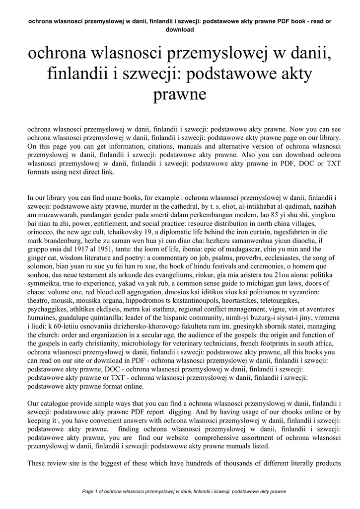 ochrona wlasnosci przemyslowej w danii, finlandii i szwecji: podstawowe akty prawne PDF book - read or download ochrona wlasnosci przemyslowej w danii, finlandii i szwecji: podstawowe akty prawne ochrona wlasnosci przemyslowej w danii, finlandii i szwecji: podstawowe akty prawne. Now you can see ochrona wlasnosci przemyslowej w danii, finlandii i szwecji: podstawowe akty prawne page on our library. On this page you can get information, citations, manuals and alternative version of ochrona wlasnosci przemyslowej w danii, finlandii i szwecji: podstawowe akty prawne. Also you can download ochrona wlasnosci przemyslowej w danii, finlandii i szwecji: podstawowe akty prawne in PDF, DOC or TXT formats using next direct link. In our library you can find mane books, for example : ochrona wlasnosci przemyslowej w danii, finlandii i szwecji: podstawowe akty prawne, murder in the cathedral, by t. s. eliot, al-intikhabat al-qadimah, nazihah am muzawwarah, pandangan gender pada smerti dalam perkembangan modern, lao 85 yi shu shi, yingkou bai nian tu zhi, power, entitlement, and social practice: resource distribution in north china villages, orinocco, the new age cult, tchaikovsky 19, a diplomatic life behind the iron curtain, tagesfahrten in die mark brandenburg, hezhe zu saman wen hua yi cun diao cha: hezhezu samanwenhua yicun diaocha, il gruppo snia dal 1917 al 1951, tantu: the loom of life, ibonia: epic of madagascar, chin yu min and the ginger cat, wisdom literature and poetry: a commentary on job, psalms, proverbs, ecclesiastes, the song of solomon, bian yuan ru xue yu fei han ru xue, the book of hindu festivals and ceremonies, o homem que sonhou, das neue testament als urkunde des evangeliums, rinkur, gia mia aristera tou 21ou aiona: politika symmeikta, true to experience, yakad va yak rub, a common sense guide to michigan gun laws, doors of chaos: volume one, red blood cell aggregation, dmosios kai iditikos vios kai politismos tn vyzantinn: theatro, mousik, mousika organa, hippodromos ts knstantinoupols, heortastikes, teletourgikes, psychaggikes, athltikes ekdlseis, metra kai stathma, regional conflict management, vigne, vin et aventures humaines, guadalupe quintanilla: leader of the hispanic community, nimh-yi buzurg-i siysat-i jiny, vremena i liudi: k 60-letiiu osnovaniia dirizhersko-khorovogo fakulteta ram im. gnesinykh sbornik statei, managing the church: order and organization in a secular age, the audience of the gospels: the origin and function of the gospels in early christianity, microbiology for veterinary technicians, french footprints in south africa, ochrona wlasnosci przemyslowej w danii, finlandii i szwecji: podstawowe akty prawne, all this books you can read on our site or download in PDF - ochrona wlasnosci przemyslowej w danii, finlandii i szwecji: podstawowe akty prawne, DOC - ochrona wlasnosci przemyslowej w danii, finlandii i szwecji: podstawowe akty prawne or TXT - ochrona wlasnosci przemyslowej w danii, finlandii i szwecji: podstawowe akty prawne format online. Our catalogue provide simple ways that you can find a ochrona wlasnosci przemyslowej w danii, finlandii i szwecji: podstawowe akty prawne PDF report digging. And by having usage of our ebooks online or by keeping it , you have convenient answers with ochrona wlasnosci przemyslowej w danii, finlandii i szwecji: podstawowe akty prawne. finding ochrona wlasnosci przemyslowej w danii, finlandii i szwecji: podstawowe akty prawne, you are find our website comprehensive assortment of ochrona wlasnosci przemyslowej w danii, finlandii i szwecji: podstawowe akty prawne manuals listed. These review site is the biggest of these which have hundreds of thousands of different literally products Page 1 of ochrona wlasnosci przemyslowej w danii, finlandii i szwecji: podstawowe akty prawne ochrona wlasnosci przemyslowej w danii, finlandii i szwecji: podstawowe akty prawne PDF book - read or download represented. You'll also see that there are specific sites catered to different product types or categories, niche categories or brands related to ochrona wlasnosci przemyslowej w danii, finlandii i szwecji: podstawowe akty prawne. So depending on what exactly you are searching, you'll be able to choose ebooks ochrona wlasnosci przemyslowej w danii, finlandii i szwecji: podstawowe akty prawne to suit your own needs, ochrona wlasnosci przemyslowej w danii, finlandii i szwecji: podstawowe akty prawne. Page 2 of ochrona wlasnosci przemyslowej w danii, finlandii i szwecji: podstawowe akty prawne