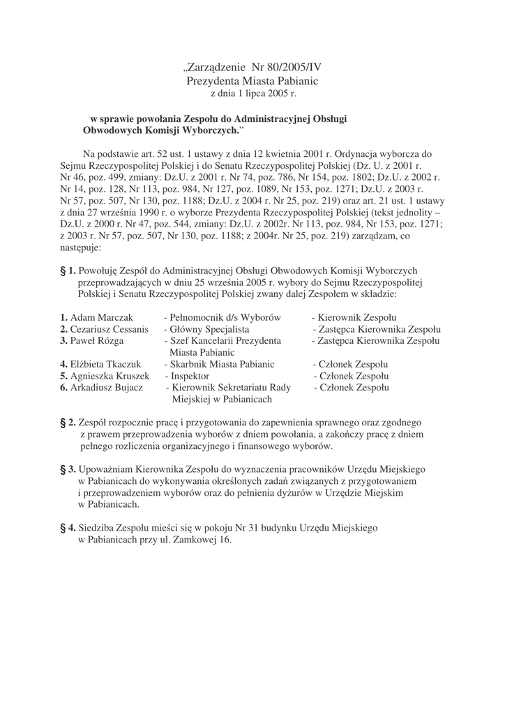 „Zarz dzenie Nr 80/2005/IV Prezydenta Miasta Pabianic z dnia 1 lipca 2005 r. w sprawie powołania Zespołu do Administracyjnej Obsługi Obwodowych Komisji Wyborczych.” Na podstawie art. 52 ust. 1 ustawy z dnia 12 kwietnia 2001 r. Ordynacja wyborcza do Sejmu Rzeczypospolitej Polskiej i do Senatu Rzeczypospolitej Polskiej (Dz. U. z 2001 r. Nr 46, poz. 499, zmiany: Dz.U. z 2001 r. Nr 74, poz. 786, Nr 154, poz. 1802; Dz.U. z 2002 r. Nr 14, poz. 128, Nr 113, poz. 984, Nr 127, poz. 1089, Nr 153, poz. 1271; Dz.U. z 2003 r. Nr 57, poz. 507, Nr 130, poz. 1188; Dz.U. z 2004 r. Nr 25, poz. 219) oraz art. 21 ust. 1 ustawy z dnia 27 wrze nia 1990 r. o wyborze Prezydenta Rzeczypospolitej Polskiej (tekst jednolity – Dz.U. z 2000 r. Nr 47, poz. 544, zmiany: Dz.U. z 2002r. Nr 113, poz. 984, Nr 153, poz. 1271; z 2003 r. Nr 57, poz. 507, Nr 130, poz. 1188; z 2004r. Nr 25, poz. 219) zarz dzam, co nast puje: 1. Powołuj Zespół do Administracyjnej Obsługi Obwodowych Komisji Wyborczych przeprowadzaj cych w dniu 25 wrze nia 2005 r. wybory do Sejmu Rzeczypospolitej Polskiej i Senatu Rzeczypospolitej Polskiej zwany dalej Zespołem w składzie: 1. Adam Marczak 2. Cezariusz Cessanis 3. Paweł Rózga 4. El bieta Tkaczuk 5. Agnieszka Kruszek 6. Arkadiusz Bujacz - Pełnomocnik d/s Wyborów - Główny Specjalista - Szef Kancelarii Prezydenta Miasta Pabianic - Skarbnik Miasta Pabianic - Inspektor - Kierownik Sekretariatu Rady Miejskiej w Pabianicach - Kierownik Zespołu - Zast pca Kierownika Zespołu - Zast pca Kierownika Zespołu - Członek Zespołu - Członek Zespołu - Członek Zespołu 2. Zespół rozpocznie prac i przygotowania do zapewnienia sprawnego oraz zgodnego z prawem przeprowadzenia wyborów z dniem powołania, a zako czy prac z dniem pełnego rozliczenia organizacyjnego i finansowego wyborów. 3. Upowa niam Kierownika Zespołu do wyznaczenia pracowników Urz du Miejskiego w Pabianicach do wykonywania okre lonych zada zwi zanych z przygotowaniem i przeprowadzeniem wyborów oraz do pełnienia dy urów w Urz dzie Miejskim w Pabianicach. 4. Siedziba Zespołu mie ci si w pokoju Nr 31 budynku Urz du Miejskiego w Pabianicach przy ul. Zamkowej 16. 5. Zespół ma prawo u ywa piecz tek o nast puj cym brzmieniu: 1. Zespół do Administracyjnej Obsługi Obwodowych Komisji Wyborczych ul. Zamkowa 16 95-200 Pabianice tel: 22-54-657 2. Kierownik Zespołu do Administracyjnej Obsługi Obwodowych Komisji Wyborczych Adam Marczak 6. Zespół korzysta z nast puj cych numerów telefonicznych i numeru fax-u: Kierownik Zespołu Zast pca Kierownika Zespołu Zast pca Kierownika Zespołu Członkowie Zespołu 22-54-666 22-54-657 22-54-637 22-54-651 7. Zarz dzenie wchodzi w ycie z dniem podj cia.