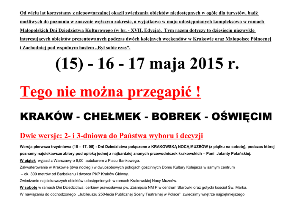 Od wielu lat korzystamy z niepowtarzalnej okazji zwiedzania obiektów niedostępnych w ogóle dla turystów, bądź możliwych do poznania w znacznie węższym zakresie, a wyjątkowo w maju udostępnianych kompleksowo w ramach Małopolskich Dni Dziedzictwa Kulturowego (w br. - XVII. Edycja). Tym razem dotyczy to dziesięciu niezwykle interesujących obiektów prezentowanych podczas dwóch kolejnych weekendów w Krakowie oraz Małopolsce Północnej i Zachodniej pod wspólnym hasłem „Był sobie czas”. (15) - 16 - 17 maja 2015 r. Tego nie można przegapić ! KRAKÓW - CHEŁMEK - BOBREK - OŚWIĘCIM Dwie wersje: 2- i 3-dniowa do Państwa wyboru i decyzji Wersja pierwsza trzydniowa (15 – 17. 05) - Dni Dziedzictwa połączone z KRAKOWSKĄ NOCĄ MUZEÓW (z piątku na sobotę), podczas której poznamy najciekawsze zbiory pod opieką jednej z najbardziej znanych przewodniczek krakowskich – Pani Jolanty Polańskiej. W piątek wyjazd z Warszawy o 9,00 autokarem z Placu Bankowego. Zakwaterowanie w Krakowie (dwa noclegi) w dwuosobowych pokojach gościnnych Domu Kultury Kolejarza w samym centrum – ok. 300 metrów od Barbakanu i dworca PKP Kraków Główny. Zwiedzanie najciekawszych obiektów udostępnionych w ramach Krakowskiej Nocy Muzeów. W sobotę w ramach Dni Dziedzictwa: cerkiew prawosławna pw. Zaśnięcia NM P w centrum Starówki oraz gotycki kościół Św. Marka. W nawiązaniu do obchodzonego „Jubileuszu 250-lecia Publicznej Sceny Teatralnej w Polsce” zwiedzimy wnętrze najpiękniejszego w Krakowie Teatru im. Juliusza Słowackiego, a dla chętnych zarezerwowane są bilety (dodatkowo płatne – ok. 60.- zł) na wieczorny spektakl muzyczny „Ziemia obiecana” wg. Wł. Reymonta lub słynny kabaret literacki w „Piwnicy pod Baranami”. Zwiedzanie z Panią J. Polańską Krakowskiej Starówki ze specjalnym uwzględnieniem obiektów - pamiątek (m. in. groby w krypcie zasłużonych na Skałce) po wybitnych Polakach: Janie Długoszu i Czesławie Miłoszu (2015 rok z inicjatywy Sejmu RP ogłoszony jest Rokiem Długosza, a tradycyjnie w połowie maja pod Wawelem odbywa się „Miłosz Festival”). Dla chętnych w godzinach popołudniowych wizyta w Muzeum Sztuki i Techniki Japońskiej MANGGHA, gdzie z okazji 20-lecia działalności prezentowana jest wystawa „Arcydzieła sztuki japońskiej w kolekcjach polskich” (koszt ok. 15 zł). W niedzielę rano wyjazd do obiektów udostępnionych do zwiedzania w ramach Dni Dziedzictwa: Fabryka Obuwia „Bata” w Chełmku, zabudowania dworskie w Bobrku oraz Muzeum Żydowskie w Oświęcimiu ze spacerem po mieście i do zamku). Powrót do Warszawy ok. godziny 21-ej. CENA PROMOCYJNA (o 60.- zł niższa od standardowej wycieczki 3-dniowej) - 300.- zł. (290.- zł. dla emerytów, dzieci, młodzieży i studentów) Wersja druga dwudniowa (16 – 17. 05) – obejmuje wszystkie obiekty objęte programem zwiedzania w ramach Małopolskich Dni Dziedzictwa Kulturalnego, zwiedzanie wybranych miejsc w Krakowie z przewodnikiem – P. Jolantą Polańską oraz możliwość uczestniczenia w sobotę w wieczorze kulturalnym: do wyboru spektakl muzyczny „Ziemia Obiecana” wg. Wł. Reymonta w Teatrze im. J. Słowackiego lub najnowszy program kabaretu literackiego „Piwnica pod Baranami”. Należy zapewnić sobie indywidualny dojazd w sobotę rano do Krakowa (np. pociągiem Pendolino) i dołączenie do grupy realizującej trzydniowy program wycieczki. W sobotę w ramach Dni Dziedzictwa: cerkiew prawosławna pw. Zaśnięcia NM P w centrum Starówki oraz gotycki kościół Św. Marka. W nawiązaniu do obchodzonego „Jubileuszu 250-lecia Publicznej Sceny Teatralnej w Polsce” zwiedzimy wnętrze najpiękniejszego w Krakowie Teatru im. Juliusza Słowackiego, a dla chętnych zarezerwowane są bilety (dodatkowo płatne – ok. 60.- zł) na wieczorny spektakl muzyczny „Ziemia obiecana” wg. Wł. Reymonta lub słynny kabaret literacki w „Piwnicy pod Baranami”. Zwiedzanie z Panią J. Polańską Krakowskiej Starówki ze specjalnym uwzględnieniem obiektów - pamiątek (m. in. groby w krypcie zasłużonych na Skałce) po wybitnych Polakach: Janie Długoszu i Czesławie Miłoszu (2015 rok z inicjatywy Sejmu RP ogłoszony jest Rokiem Długosza, a tradycyjnie w połowie maja pod Wawelem odbywa się „Miłosz Festival”). Dla chętnych w godzinach popołudniowych wizyta w Muzeum Sztuki i Techniki Japońskiej MANGGHA, gdzie z okazji 20-lecia działalności prezentowana jest wystawa „Arcydzieła sztuki japońskiej w kolekcjach polskich” (koszt ok. 15 zł). Zakwaterowanie w Krakowie w dwuosobowych pokojach gościnnych Domu Kultury Kolejarza w samym centrum – ok. 300 metrów od Barbakanu i od dworca PKP Kraków Główny. W niedzielę rano wyjazd do obiektów udostępnionych do zwiedzania w ramach Dni Dziedzictwa: Fabryka Obuwia „Bata” w Chełmku, zabudowania dworskie w Bobrku oraz Muzeum Żydowskie w Oświęcimiu ze spacerem po mieście i do zamku). Powrót do Warszawy ok. godziny 21-ej. Koszt wycieczki w wersji dwudniowej (promocja !): 210.- zł. (200.- zł. – emeryci, dzieci, młodzież szkolna i studenci). Uczestnicy wycieczki otrzymają od organizatora MDDK nieodpłatnie starannie przygotowane wydawnictwo opisujące wszystkie obiekty zwiedzane w ramach Małopolskich Dni Dziedzictwa Kulturowego. WYBIERZ WARIANT, KTÓRY NAJBARDZIEJ TOBIE ODPOWIADA Informacje i zapisy do wyczerpania miejsc, nie dłużej niż do czwartku 16 kwietnia w Biurze Podróży „Imperial” (ul. Ogrodowa 67) – tel. 22 654-89-89 (od poniedziałku do piątku w godz. 11 – 17) i u kierownika wycieczki - Marka Piaseckiego (tel. 603 404 213).