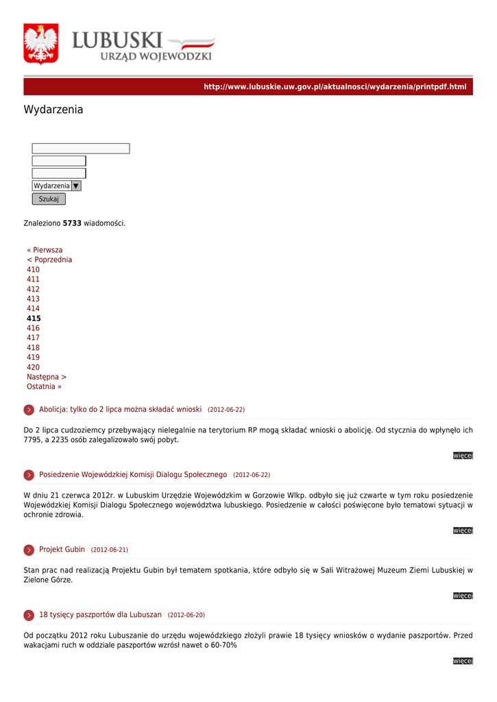 http://www.lubuskie.uw.gov.pl/aktualnosci/wydarzenia/printpdf.html Wydarzenia Wydarzenia ▼ Szukaj Znaleziono 5733 wiadomości. « Pierwsza < Poprzednia 410 411 412 413 414 415 416 417 418 419 420 Następna > Ostatnia » Abolicja: tylko do 2 lipca można składać wnioski (2012-06-22) Do 2 lipca cudzoziemcy przebywający nielegalnie na terytorium RP mogą składać wnioski o abolicję. Od stycznia do wpłynęło ich 7795, a 2235 osób zalegalizowało swój pobyt. więcej Posiedzenie Wojewódzkiej Komisji Dialogu Społecznego (2012-06-22) W dniu 21 czerwca 2012r. w Lubuskim Urzędzie Wojewódzkim w Gorzowie Wlkp. odbyło się już czwarte w tym roku posiedzenie Wojewódzkiej Komisji Dialogu Społecznego województwa lubuskiego. Posiedzenie w całości poświęcone było tematowi sytuacji w ochronie zdrowia. więcej Projekt Gubin (2012-06-21) Stan prac nad realizacją Projektu Gubin był tematem spotkania, które odbyło się w Sali Witrażowej Muzeum Ziemi Lubuskiej w Zielone Górze. więcej 18 tysięcy paszportów dla Lubuszan (2012-06-20) Od początku 2012 roku Lubuszanie do urzędu wojewódzkiego złożyli prawie 18 tysięcy wniosków o wydanie paszportów. Przed wakacjami ruch w oddziale paszportów wzrósł nawet o 60-70% więcej Pomoc społeczna bliżej ludzi (2012-06-19) Nowa platforma komunikacyjna, usprawnienie pracy jednostek administracji publicznej i efektywniejsza obsługa klienta – to podstawowe założenia nowego rządowego projektu „Empa@tia”. więcej www.lubuskie.uw.gov.pl (2012-06-19) Pod adresem lubuskie.uw.gov.pl ruszyła odświeżona witryna urzędu wojewódzkiego. Dzięki wprowadzonym zmianom wszyscy nasi klienci uzyskali łatwiejszy dostęp do informacji związanych z pracą administracji i wojewody. więcej Uniwersytet Trzeciego Wieku zakończył rok akademicki (2012-06-19) Słuchacze gorzowskiego uniwersytetu trzeciego wieku świętowali zakończenie roku akademickiego 2011/2012. Z pełnymi radości i chęci do życia seniorami spotkał się wojewoda Marcin Jabłoński, gratulując im chęci do zdobywania wiedzy. więcej Dobry klimat dla rodziny (2012-06-18) List Pary Prezydenckiej do Prezydentów Miast, Burmistrzów, Starostów i Wójtów w związku z konkursem "Dobry klimat dla rodziny". więcej Jubileusz, uprawnienia oraz festyn rodzinny (2012-06-18) 15 czerwca jubileusz 100-lecia urodzin obchodziła Pani Maria Górska. Seniorka, która już ponad pół wieku mieszka w Witnicy przyjechała na Ziemię Lubuską po zakończeniu II Wojny Światowej z okolic Lidy – miasta, które teraz znajduje się na terenie Białorusi. więcej Uczniowie nagrodzeni (2012-06-18) 99 uczniów z gorzowskich szkół odebrało stypendia artystyczne i naukowe. W uroczystości wziął udział Jan Świrepo wicewojewoda lubuski. więcej « Pierwsza < Poprzednia 410 411 412 413 414 415 416 417 418 419 420 Następna > Ostatnia »