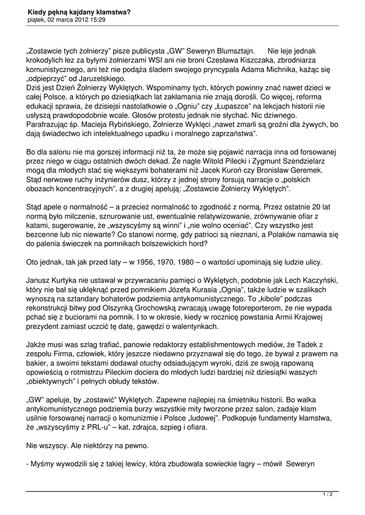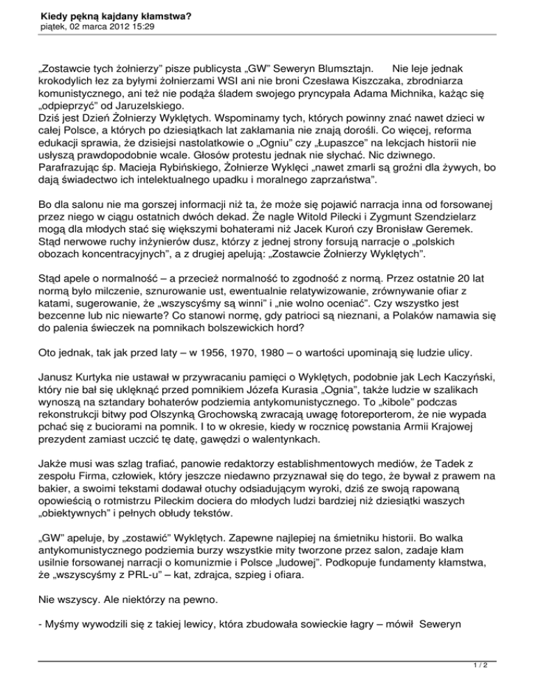 Kiedy pękną kajdany kłamstwa? piątek, 02 marca 2012 15:29 „Zostawcie tych żołnierzy” pisze publicysta „GW” Seweryn Blumsztajn. Nie leje jednak krokodylich łez za byłymi żołnierzami WSI ani nie broni Czesława Kiszczaka, zbrodniarza komunistycznego, ani też nie podąża śladem swojego pryncypała Adama Michnika, każąc się „odpieprzyć” od Jaruzelskiego. Dziś jest Dzień Żołnierzy Wyklętych. Wspominamy tych, których powinny znać nawet dzieci w całej Polsce, a których po dziesiątkach lat zakłamania nie znają dorośli. Co więcej, reforma edukacji sprawia, że dzisiejsi nastolatkowie o „Ogniu” czy „Łupaszce” na lekcjach historii nie usłyszą prawdopodobnie wcale. Głosów protestu jednak nie słychać. Nic dziwnego. Parafrazując śp. Macieja Rybińskiego, Żołnierze Wyklęci „nawet zmarli są groźni dla żywych, bo dają świadectwo ich intelektualnego upadku i moralnego zaprzaństwa”. Bo dla salonu nie ma gorszej informacji niż ta, że może się pojawić narracja inna od forsowanej przez niego w ciągu ostatnich dwóch dekad. Że nagle Witold Pilecki i Zygmunt Szendzielarz mogą dla młodych stać się większymi bohaterami niż Jacek Kuroń czy Bronisław Geremek. Stąd nerwowe ruchy inżynierów dusz, którzy z jednej strony forsują narracje o „polskich obozach koncentracyjnych”, a z drugiej apelują: „Zostawcie Żołnierzy Wyklętych”. Stąd apele o normalność – a przecież normalność to zgodność z normą. Przez ostatnie 20 lat normą było milczenie, sznurowanie ust, ewentualnie relatywizowanie, zrównywanie ofiar z katami, sugerowanie, że „wszyscyśmy są winni” i „nie wolno oceniać”. Czy wszystko jest bezcenne lub nic niewarte? Co stanowi normę, gdy patrioci są nieznani, a Polaków namawia się do palenia świeczek na pomnikach bolszewickich hord? Oto jednak, tak jak przed laty – w 1956, 1970, 1980 – o wartości upominają się ludzie ulicy. Janusz Kurtyka nie ustawał w przywracaniu pamięci o Wyklętych, podobnie jak Lech Kaczyński, który nie bał się uklęknąć przed pomnikiem Józefa Kurasia „Ognia”, także ludzie w szalikach wynoszą na sztandary bohaterów podziemia antykomunistycznego. To „kibole” podczas rekonstrukcji bitwy pod Olszynką Grochowską zwracają uwagę fotoreporterom, że nie wypada pchać się z buciorami na pomnik. I to w okresie, kiedy w rocznicę powstania Armii Krajowej prezydent zamiast uczcić tę datę, gawędzi o walentynkach. Jakże musi was szlag trafiać, panowie redaktorzy establishmentowych mediów, że Tadek z zespołu Firma, człowiek, który jeszcze niedawno przyznawał się do tego, że bywał z prawem na bakier, a swoimi tekstami dodawał otuchy odsiadującym wyroki, dziś ze swoją rapowaną opowieścią o rotmistrzu Pileckim dociera do młodych ludzi bardziej niż dziesiątki waszych „obiektywnych” i pełnych obłudy tekstów. „GW” apeluje, by „zostawić” Wyklętych. Zapewne najlepiej na śmietniku historii. Bo walka antykomunistycznego podziemia burzy wszystkie mity tworzone przez salon, zadaje kłam usilnie forsowanej narracji o komunizmie i Polsce „ludowej”. Podkopuje fundamenty kłamstwa, że „wszyscyśmy z PRL-u” – kat, zdrajca, szpieg i ofiara. Nie wszyscy. Ale niektórzy na pewno. - Myśmy wywodzili się z takiej lewicy, która zbudowała sowieckie łagry – mówił Seweryn 1/2 Kiedy pękną kajdany kłamstwa? piątek, 02 marca 2012 15:29 Blumsztajn na promocji książki prof. Friszke, która odbyła się w siedzibie Agory. To wiele tłumaczy. za: niezalezna.pl/ *** Wiadomo, że w domu wisielca nie powinno mówić się o sznurze. To jasne - bo domownicy wisielca zaraz mają nieprzyjemne skojarzenia. Okazuje się, że takim domem wisielca jest jeśli nie cała Polska, to w każdym razie - niektóre jej części, ze szczególnym uwzględnieniem redakcji „Gazety Wyborczej” przy ul. Czerskiej w Warszawie. Być może nigdy nie wyszłoby to na jaw, gdyby nie ustanowiony 1 marca Dzień Żołnierzy Wyklętych, a więc - dzień wdzięcznej pamięci Polaków o uczestnikach zbrojnego oporu przeciwko sowieckiej okupacji Polski po zakończeniu II wojny światowej, kontynuujących walkę wbrew nadziei. Ale oczywiście nie wszyscy mieszkańcy naszego nieszczęśliwego kraju zachowują tych ludzi we wdzięcznej pamięci. Dla tych, których przodkowie i krewniacy, kolaborując z sowieckim okupantem, uczestniczyli w eksterminowaniu żołnierzy niepodległości i w ogóle - polskich patriotów, wspominanie „Żołnierzy Wyklętych” nie należy do przyjemności, ponieważ przypomina im, skąd wyrastają im nogi i jaką treść niesie ich rodzinna tradycja. Nic zatem dziwnego, że pan red. Seweryn Blumsztajn nawołuje w „Gazecie Wyborczej”, by „zostawić tych żołnierzy” i w ogóle zaniechać „patriotycznych wrzasków”. Wtedy pan red. Seweryn Blumsztajn z towarzyszami mógłby wrzeszczeć po swojemu nie tylko bez jakichkolwiek przeszkód, ale również - bez kompleksów wobec gościnnego i cierpliwego tubylczego narodu. Stanisław Michalkiewicz za: http://www.michalkiewicz.pl/ 2/2
