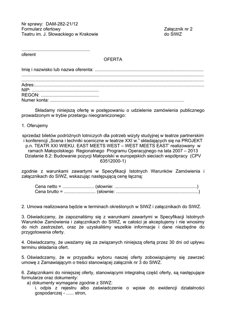 Nr sprawy: DAM-282-21/12 Formularz ofertowy Teatru im. J. Słowackiego w Krakowie Załącznik nr 2 do SIWZ ...................................................... oferent OFERTA Imię i nazwisko lub nazwa oferenta: ...................................................................................... ................................................................................................................................................ ................................................................................................................................................ Adres:...................................................................................................................................... NIP: ..................................................... REGON: .............................................. Numer konta: .......................................................................................................... Składamy niniejszą ofertę w postępowaniu o udzielenie zamówienia publicznego prowadzonym w trybie przetargu nieograniczonego: 1. Oferujemy sprzedaż biletów podróżnych lotniczych dla potrzeb wizyty studyjnej w teatrze partnerskim i konferencji „Scena i techniki sceniczne w teatrze XXI w.” składających się na PROJEKT p.n. TEATR XXI WIEKU. EAST MEETS WEST – WEST MEETS EAST’ realizowany w ramach Małopolskiego Regionalnego Programu Operacyjnego na lata 2007 – 2013 Działanie 8.2: Budowanie pozycji Małopolski w europejskich sieciach współpracy (CPV 63512000-1) zgodnie z warunkami zawartymi w Specyfikacji Istotnych Warunków Zamówienia i załącznikach do SIWZ, wskazując następującą cenę łączną: Cena netto = ......................... (słownie: .................................................................) Cena brutto = ......................... (słownie: .................................................................) 2. Umowa realizowana będzie w terminach określonych w SIWZ i załącznikach do SIWZ. 3. Oświadczamy, że zapoznaliśmy się z warunkami zawartymi w Specyfikacji Istotnych Warunków Zamówienia i załącznikach do SIWZ, w całości je akceptujemy i nie wnosimy do nich zastrzeżeń, oraz że uzyskaliśmy wszelkie informacje i dane niezbędne do przygotowania oferty. 4. Oświadczamy, że uważamy się za związanych niniejszą ofertą przez 30 dni od upływu terminu składania ofert. 5. Oświadczamy, że w przypadku wyboru naszej oferty zobowiązujemy się zawrzeć umowę z Zamawiającym o treści stanowiącej załącznik nr 3 do SIWZ. 6. Załącznikami do niniejszej oferty, stanowiącymi integralną część oferty, są następujące formularze oraz dokumenty: a) dokumenty wymagane zgodnie z SIWZ: i. odpis z rejestru albo zaświadczenie o wpisie do ewidencji działalności gospodarczej - ...... stron, ii. zaświadczenie z Urzędu Skarbowego - ...... stron, iii. zaświadczenie z oddziału Zakładu Ubezpieczeń Społecznych - ...... stron, b) szczegółowa kalkulacja sposobu obliczenia ceny wskazująca ceny poszczególnych biletów dla jednej osoby - …… stron, c) parafowany tekst umowy o zamówienie publiczne – stanowiący załącznik nr 3 do SIWZ, d) pełnomocnictwo udzielone przez podmioty wspólnie składające ofertę do ich reprezentowania w postępowaniu (jeśli dotyczy) - ...... stron. 7. Ja, niżej podpisany, świadomy odpowiedzialności karnej za składanie fałszywych oświadczeń, niniejszym oświadczam, że podmiot przeze mnie reprezentowany: a) posiada uprawnienia do wykonywania określonej działalności i do wykonywania składających się na przedmiot zamówienia czynności, b) posiada niezbędną wiedzę i doświadczenie oraz dysponuje odpowiednim potencjałem technicznym oraz osobami zdolnymi do wykonania zamówienia, c) znajduje się w sytuacji ekonomicznej i finansowej zapewniającej wykonanie zamówienia, d) nie podlega wykluczeniu z postępowania na podstawie art. 24 ustawy Prawo zamówień publicznych. ...................................................... ...................................................... miejscowość, data pieczęć wykonawcy podpisy osób uprawnionych do reprezentacji