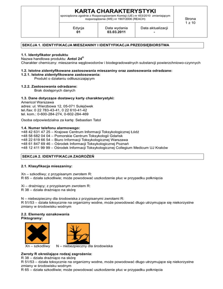 Kart0 charakterystyki sporz dzono zgodnie z Rozporz dzeniem Komisji (UE) nr 453/2010 z dnia 20 maja