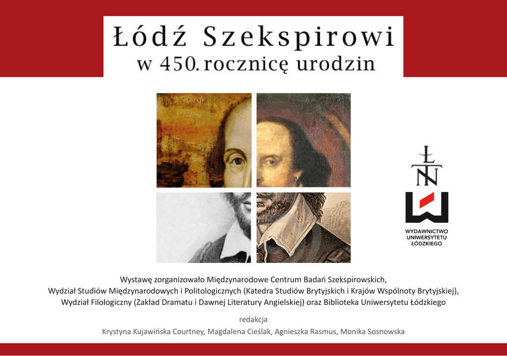 . Wystawę zorganizowało Międzynarodowe Centrum Badań Szekspirowskich, Wydział Studiów Międzynarodowych i Politologicznych (Katedra Studiów Brytyjskich i Krajów Wspólnoty Brytyjskiej), Wydział Filologiczny (Zakład Dramatu i Dawnej Literatury Angielskiej) oraz Biblioteka Uniwersytetu Łódzkiego redakcja Krystyna Kujawińska Courtney, Magdalena Cieślak, Agnieszka Rasmus, Monika Sosnowska Krystyna Kujawińska Courtney, Monika Sosnowska – Uniwersytet Łódzki, Wydział Studiów Międzynarodowych i Politologicznych, Katedra Studiów Brytyjskich i Krajów Wspólnoty Brytyjskiej, Międzynarodowe Centrum Badań Szekspirowskich Magdalena Cieślak, Agnieszka Rasmus – Uniwersytet Łódzki, Wydział Filologiczny, Zakład Dramatu i Dawnej Literatury Angielskiej, Międzynarodowe Centrum Badań Szekspirowskich Spis treści Słowo wstępne 1 SKŁAD I ŁAMANIE Oficyna Wydawnicza Edytor.org © Copyright by Łódzkie Towarzystwo Naukowe, Łódź 2014 © Copyright for this edition by Uniwersytet Łódzki, Łódź 2014 Dofinansowane ze środków Ministerstwa Nauki i Szkolnictwa Wyższego Wydanie I. W.06744.14.0.I ISBN WUŁ 978-83-7969-413-6 ISBN ŁTN 978-83-60655-75-7 Łódzkie Towarzystwo Naukowe Wydawnictwo Uniwersytetu Łódzkiego 90-131 Łódź, ul. Lindleya 8 www.wydawnictwo.uni.lodz.pl Krystyna Kujawińska Courtney 4 Antoni Różalski, Prorektor ds. Nauki UŁ 7 Tomasz Domański, Dziekan Wydziału Studiów Międzynarodowych i Politologicznych 10 Piotr Cap, Prodziekan ds. Naukowych Wydziału Filologicznego UŁ 13 2 Mariola Augustyniak 3 Monika Sosnowska 4 Katarzyna Jasińska 5 Magdalena Cieślak 6 Agnieszka Rasmus Szekspir w zbiorach Biblioteki Uniwersytetu Łódzkiego Szekspir na Uniwersytecie Łódzkim Szekspir na scenie Teatru Wielkiego w Łodzi Szekspir w łódzkich teatrach Szekspir w filmie 14 17 21 23 27 Podziękowania S erdecznie dziękujemy Panu prof. dr hab. Łukaszowi Boguckiemu, Dyrektorowi Instytutu Anglistyki UŁ, za wsparcie finansowe, bez którego nie powstałaby wystawa. Jesteśmy wdzięczni Panu prof. dr hab. Antoniemu Różalskiemu, Prorektorowi ds. nauki UŁ, Pani prof. dr hab. Elżbiecie Żądzińskiej, Dziekan Wydziału Biologii i Ochrony Środowiska UŁ, oraz Panu prof. dr hab. Tomaszowi Domańskiemu, Dziekanowi Wydziału Studiów Międzynarodowych i Politologicznych UŁ, za uświetnienie wystawy swoją obecnością. Pragniemy również podziękować Panu Tomaszowi Piestrzyńskiemu, Dyrektorowi Biblioteki UŁ, za umożliwienie zorganizowania wystawy na terenie Biblioteki oraz udostępnienie zbiorów. Podziękowania kierujemy także do Pani Marioli Augustyniak, Z-cy Dyrektora, oraz do Pań kustosz – Marzeny Kowalskiej i dr Ireny Łabiszewskiej – za zaangażowanie w przygotowanie wystawy. Ponadto za udostępnienie kostiumów i rekwizytów uprzejmie dziękujemy Dyrekcji Teatru im. Stefana Jaracza oraz Teatru Nowego w Łodzi; Kierownik działu literackiego Teatru Wielkiego, Pani Katarzynie Jasińskiej. Panu Filipowi Jesionkowi jesteśmy wdzięczni za fantastyczne zdjęcia. 1 Słowo wstępne 4 Prof. zw. dr hab. Krystyna Kujawińska Courtney Szanowni Państwo, Oddajemy Państwu do rąk, a prawdę mówiąc na ekran komputera, katalog wystawy „Łódź Szekspirowi w 450. rocznicę urodzin”, która miała miejsce w Bibliotece Uniwersytetu Łódzkiego i trwała od dnia 7 kwietnia do dnia 1 maja 2014 r. Wystawę zorganizowało Międzynarodowe Centrum Badań Szekspirowskich przy współpracy: AAWydziału Studiów Międzynarodowych i Politologicznych (Kate- dra Studiów Brytyjskich i Krajów Wspólnoty Brytyjskiej) AAWydziału Filologicznego (Zakład Dramatu i Dawnej Literatury Angielskiej) oraz AABiblioteki Uniwersytetu Łódzkiego. Wydarzenie to nie mogłoby się odbyć bez zaangażowania pracowników Biblioteki Uniwersytetu Łódzkiego. Plakat wystawy „Łódź Szekspirowi w 450. rocznicę urodzin” . 1 Słowo wstępne 5 Prof. zw. dr hab. Krystyna Kujawińska Courtney K iedy w 1964 roku obchodzono 400. rocznicę urodzin Szekspira, środowisko łódzkie, niestety, nie włączyło się aktywnie w różnorodne imprezy świętujące to wydarzenie zarówno w Polsce jak i zagranicą. Jedynym elementem uświetnienia rocznicy była wówczas wystawa przygotowana przez British Council, którą pokazywano w Warszawie, Krakowie i właśnie Łodzi. Wystawa przedstawiała współczesne prace autorów anglojęzycznych oraz obrazy przedstawiające Szekspira wraz z fotografiami wybranych wystawień jego sztuk przez Royal Shakespeare Company. Przyczyn tej sytuacji było z pewnością wiele. Jedną z nich, można domyślać się, była szczególna rola naszego miasta na ówczesnej mapie polskiej kultury. Do pewnego stopnia odzwierciedlała ją opinia na temat łódzkich związków z Szekspirem wygłoszona w 1867 r. Kiedy w owym roku zmarł nagle w Łodzi podczas swego europejskiego tournée Ira Aldridge (ur. w 1807 w Nowym Jorku), pierwszy czarnoskóry tragik szekspirowski, jeden z warszawskich dziennikarzy skwitował ten fakt w Tygodniku Ilustrowanym (24 sierpnia, 1867 r.) zapytaniem: Kto mógłby się spodziewać, ze Otello, Makbet, Szajlok umrą w Łodzi, mieście fabryk, które z powodu swej natury nigdy nie miała kontaktów z Szekspirem, co dopiero ze stworzonymi przez niego bohaterami? Wystawa „Łódź Szekspirowi w 450. rocznicę urodzin” w budynku Biblioteki Uniwersytetu Łódzkiego 1 Słowo wstępne 6 Prof. zw. dr hab. Krystyna Kujawińska Courtney Jak niniejszy katalog wskazuje, aktualnie Łódź wpisuje się swoimi imponującymi osiągnięciami, m.in. naukowymi, teatralnymi, filmowymi, operowymi a także powiększającymi się zbiorami starodruków, nie tylko w Polski, ale i w ogólnoświatowy trend zainteresowań twórczością Szekspira. S erdecznie dziękujemy wszystkim organizacjom kultury i nauki, które tak aktywnie włączyły się w przygotowanie wystawy i katalogu. Mamy jednocześnie nadzieje, że 500. rocznica urodzin Szekspira będzie jeszcze większym wydar