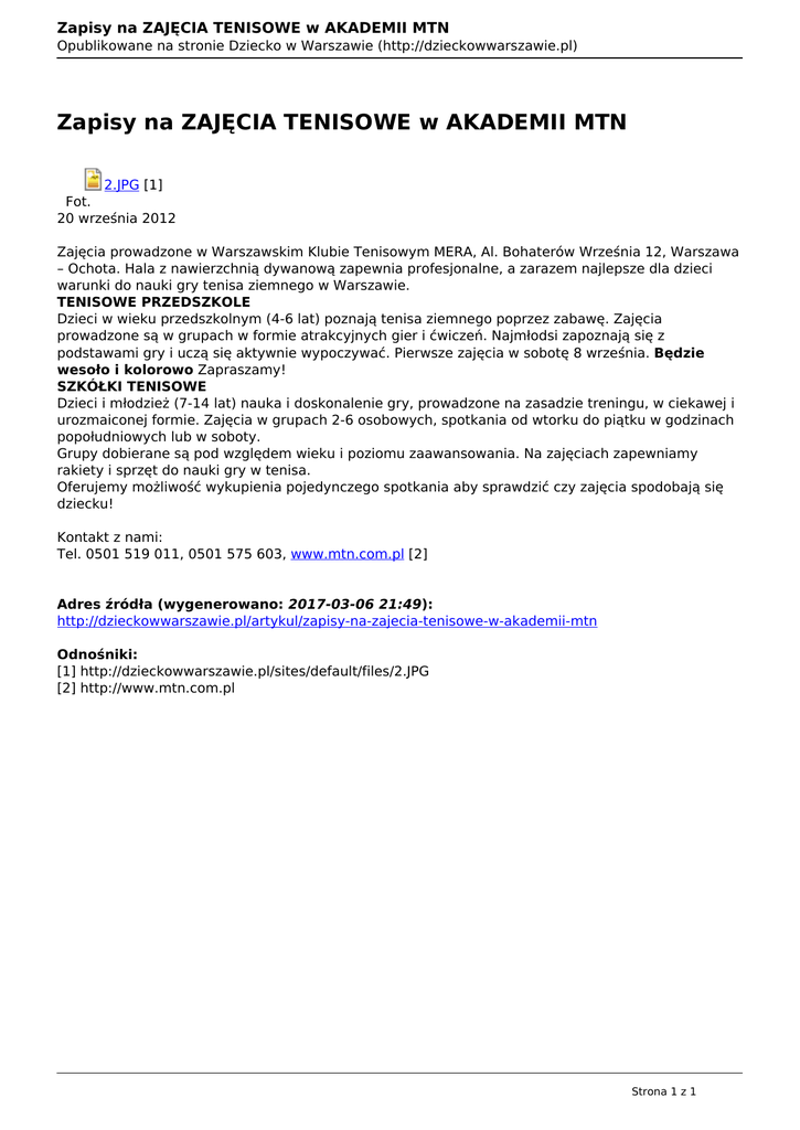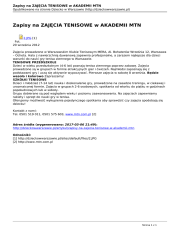 Zapisy na ZAJĘCIA TENISOWE w AKADEMII MTN Opublikowane na stronie Dziecko w Warszawie (http://dzieckowwarszawie.pl) Zapisy na ZAJĘCIA TENISOWE w AKADEMII MTN 2.JPG [1] Fot. 20 września 2012 Zajęcia prowadzone w Warszawskim Klubie Tenisowym MERA, Al. Bohaterów Września 12, Warszawa – Ochota. Hala z nawierzchnią dywanową zapewnia profesjonalne, a zarazem najlepsze dla dzieci warunki do nauki gry tenisa ziemnego w Warszawie. TENISOWE PRZEDSZKOLE Dzieci w wieku przedszkolnym (4-6 lat) poznają tenisa ziemnego poprzez zabawę. Zajęcia prowadzone są w grupach w formie atrakcyjnych gier i ćwiczeń. Najmłodsi zapoznają się z podstawami gry i uczą się aktywnie wypoczywać. Pierwsze zajęcia w sobotę 8 września. Będzie wesoło i kolorowo Zapraszamy! SZKÓŁKI TENISOWE Dzieci i młodzież (7-14 lat) nauka i doskonalenie gry, prowadzone na zasadzie treningu, w ciekawej i urozmaiconej formie. Zajęcia w grupach 2-6 osobowych, spotkania od wtorku do piątku w godzinach popołudniowych lub w soboty. Grupy dobierane są pod względem wieku i poziomu zaawansowania. Na zajęciach zapewniamy rakiety i sprzęt do nauki gry w tenisa. Oferujemy możliwość wykupienia pojedynczego spotkania aby sprawdzić czy zajęcia spodobają się dziecku! Kontakt z nami: Tel. 0501 519 011, 0501 575 603, www.mtn.com.pl [2] Adres źródła (wygenerowano: 2017-03-06 21:49): http://dzieckowwarszawie.pl/artykul/zapisy-na-zajecia-tenisowe-w-akademii-mtn Odnośniki: [1] http://dzieckowwarszawie.pl/sites/default/files/2.JPG [2] http://www.mtn.com.pl Strona 1 z 1 Powered by TCPDF (www.tcpdf.org)