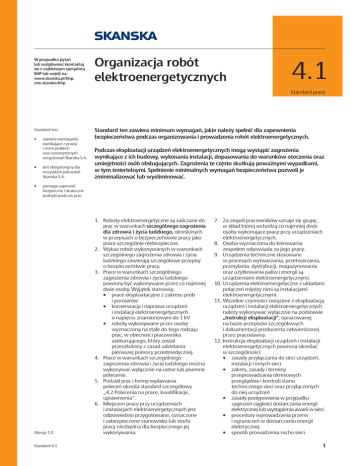 W przypadku pytań lub wątpliwości skontaktuj się z najbliższym specjalistą BHP lub wejdź na: www.skanska.pl/bhp, one.skanska/bhp Organizacja robót elektroenergetycznych 4.1 Standard pracy Standard ten: • zawiera wymagania wynikające z prawa i norm polskich oraz wewnętrznych uregulowań Skanska S.A. • jest obligatoryjny dla wszystkich jednostek Skanska S.A. • pomaga zapewnić bezpieczne i skuteczne praktyki podczas prac. Wersja 1.0 Standard 4.1 Standard ten zawiera minimum wymagań, jakie należy spełnić dla zapewnienia bezpieczeństwa podczas organizowania i prowadzenia robót elektroenergetycznych. Podczas eksploatacji urządzeń elektroenergetycznych mogą wystąpić zagrożenia wynikające z ich budowy, wykonania instalacji, dopasowania do warunków otoczenia oraz umiejętności osób obsługujących. Zagrożenia te często skutkują poważnymi wypadkami, w tym śmiertelnymi. Spełnienie minimalnych wymagań bezpieczeństwa pozwoli je zminimalizować lub wyeliminować. 1. Roboty elektroenergetyczne są zaliczane do prac w warunkach szczególnego zagrożenia dla zdrowia i życia ludzkiego, określonych w przepisach o bezpieczeństwie pracy jako prace szczególnie niebezpieczne. 2. Wykaz robót wykonywanych w warunkach szczególnego zagrożenia zdrowia i życia ludzkiego zawierają szczegółowe przepisy o bezpieczeństwie pracy. 3. Prace w warunkach szczególnego zagrożenia zdrowia i życia ludzkiego powinny być wykonywane przez co najmniej dwie osoby. Wyjątek stanowią: • prace eksploatacyjne z zakresu prób i pomiarów • konserwacja i naprawa urządzeń i instalacji elektroenergetycznych o napięciu znamionowym do 1 kV • roboty wykonywane przez osobę wyznaczoną na stałe do tego rodzaju prac, w obecności pracownika asekurującego, który został przeszkolony z zasad udzielania pierwszej pomocy przedmedycznej. 4. Prace w warunkach szczególnego zagrożenia zdrowia i życia ludzkiego można wykonywać wyłącznie na ustne lub pisemne polecenie. 5. Podział prac i formy wydawania poleceń określa standard szczegółowy „4.2 Polecenia na prace, kwalifikacje, uprawnienia”. 6. Miejscem pracy przy urządzeniach i instalacjach elektroenergetycznych jest odpowiednio przygotowane, oznaczone i zabezpieczone stanowisko lub strefa pracy niezbędna dla bezpiecznego jej wykonywania. 7. Za zespół pracowników uznaje się grupę, w skład której wchodzą co najmniej dwie osoby wykonujące pracę przy urządzeniach elektroenergetycznych. 8. Osoba wyznaczona do kierowania zespołem odpowiada za jego pracę. 9. Urządzenia techniczne stosowane w procesach wytwarzania, przetwarzania, przesyłania, dystrybucji, magazynowania oraz użytkowania paliw i energii są urządzeniami elektroenergetycznymi. 10. Urządzenia elektroenergetyczne z układami połączeń między nimi są instalacjami elektroenergetycznymi. 11. Wszelkie czynności związane z eksploatacją urządzeń i instalacji elektroenergetycznych należy wykonywać wyłącznie na podstawie „Instrukcji eksploatacji”, opracowanej na bazie przepisów szczegółowych i dokumentacji producenta zatwierdzonej przez pracodawcę. 12. Instrukcja eksploatacji urządzeń i instalacji elektroenergetycznych powinna określać w szczególności: • zasady przyłączania do sieci urządzeń, instalacji i innych sieci • zakres, zasady i terminy przeprowadzania okresowych przeglądów i kontroli stanu technicznego sieci oraz przyłączonych do niej urządzeń • zasady postępowania w przypadku zagrożeń ciągłości dostarczania energii elektrycznej lub wystąpienia awarii w sieci • procedury wprowadzania przerw i ograniczeń w dostarczaniu energii elektrycznej • sposób prowadzenia ruchu sieci. 1 13. Niezależnie od wymienionej wyższej instrukcji eksploatacji wszelkie prace przy urządzeniach i instalacjach elektroenergetycznych można wykonywać w oparciu o Instrukcję Bezpiecznego Wykonywania Robót (IBWR). 14. Opracowując IBWR należy uwzględniać informacje zawarte w Ocenie Ryzyka dla Zadania, przeprowadzonej przed rozpoczęciem robót. 15. Prace na stanowisku dozoru lub eksploatacji, w zakresie ustalonym w przepisach szczegółowych, mogą wykonywać wyłącznie osoby posiadające świadectwo kwalifikacyjne. 16. Tryb uzyskiwania świadectw kwalifikacyjnych określa standard szczegółowy „4.2 Polecenie na prace, kwalifikacje, uprawnienia”. 17. Niezależnie od posiadania świadectwa kwalifikacyjnego, osoba prowadząca eksploatację lub nadzór nad urządzeniami i instalacjami elektroenergetycznymi powinna także mieć aktualne orzeczenie lekarskie o stanie zdrowia oraz ukończone szkolenie BHP. 18. W zależności od zastosowanych metod i środków zapewniających bezpieczeństwo pracy, roboty przy urządzeniach i instalacjach elektroenergetycznych można wykonywać: a/ przy całkowitym wyłączeniu napięcia b/ w pobliżu napięcia c/ pod napięciem. 19. Wyłączenie urządzeń i instalacji elektroenergetycznych spod napięcia powinno być dokonane w taki sposób, aby uzyskać przerwę izolacyjną w obwodach zasilających urządzenie i instalację. 20. Prace w pobliżu napięcia można wykonywać przy użyciu środków ochronnych adekwatnych do występujących warunków pracy, określonych w IBWR. 21. Prace pod napięciem można wykonywać w oparciu o właściwą technologię robót i z zastosowaniem wymaganych narzędzi i środków ochronnych określonych w IBWR. Rys. 2 Prace dozwolone bez wyłączania napięcia 2 22. Prace w pobliżu napięcia i pod napięciem mogą być prowadzone z zachowaniem określonych granic dla każdej ze stref (Rys. 1): Rys.1 Strefy prac pod napięciem i w pobliżu napięcia Napięcie znamionowe prac pod urządzenia napięciem kV m do 1 do 0,3 powyżej 1–30 do 0,6 110 do 1,1 220 do 2,5 400 do 3,5 750 do 6,4 Strefa prac w pobliżu napięcia m powyżej 0,3 do 0,7 powyżej 0,6 do 1,4 powyżej 1,1 do 2,1 powyżej 2,5 do 4,1 powyżej 3,5 do 5,4 powyżej 6,4 do 8,4 23. Uziemienie